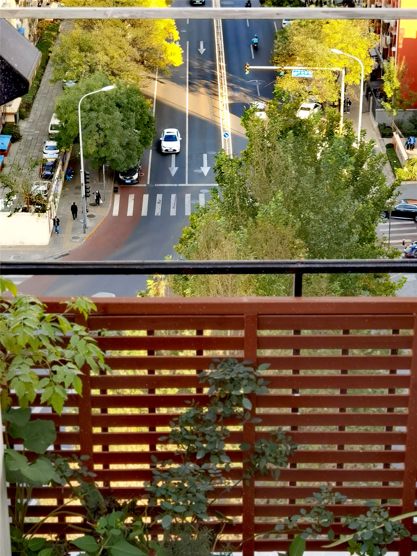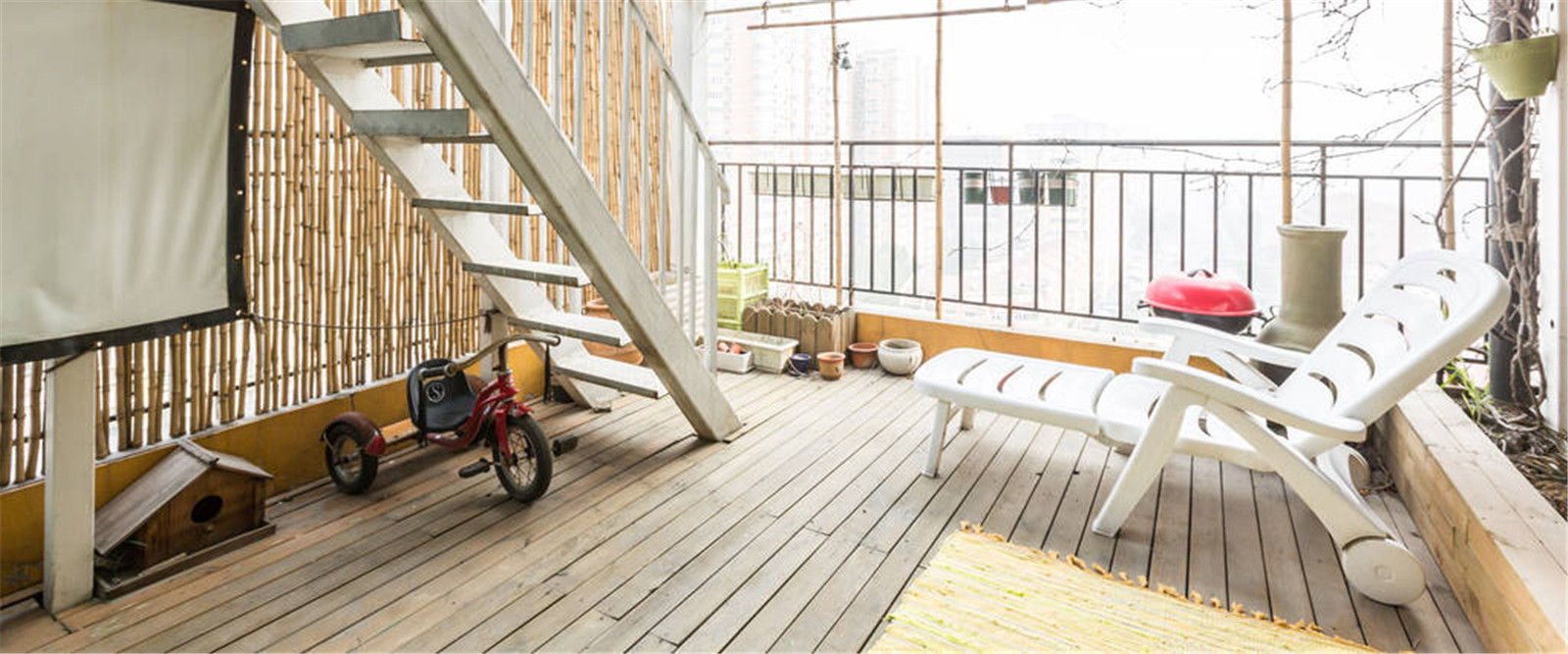 2017年, 這個(gè)設(shè)計(jì)Studio開始被啟用,工作室東側(cè)連接著一個(gè)16平方米的小天臺(tái),雖然很小,但清晨朝陽灑下來的時(shí)候感覺非常棒,地面的防腐木稍顯破舊,北側(cè)有個(gè)室外鋼梯可以上到工作室的屋頂。