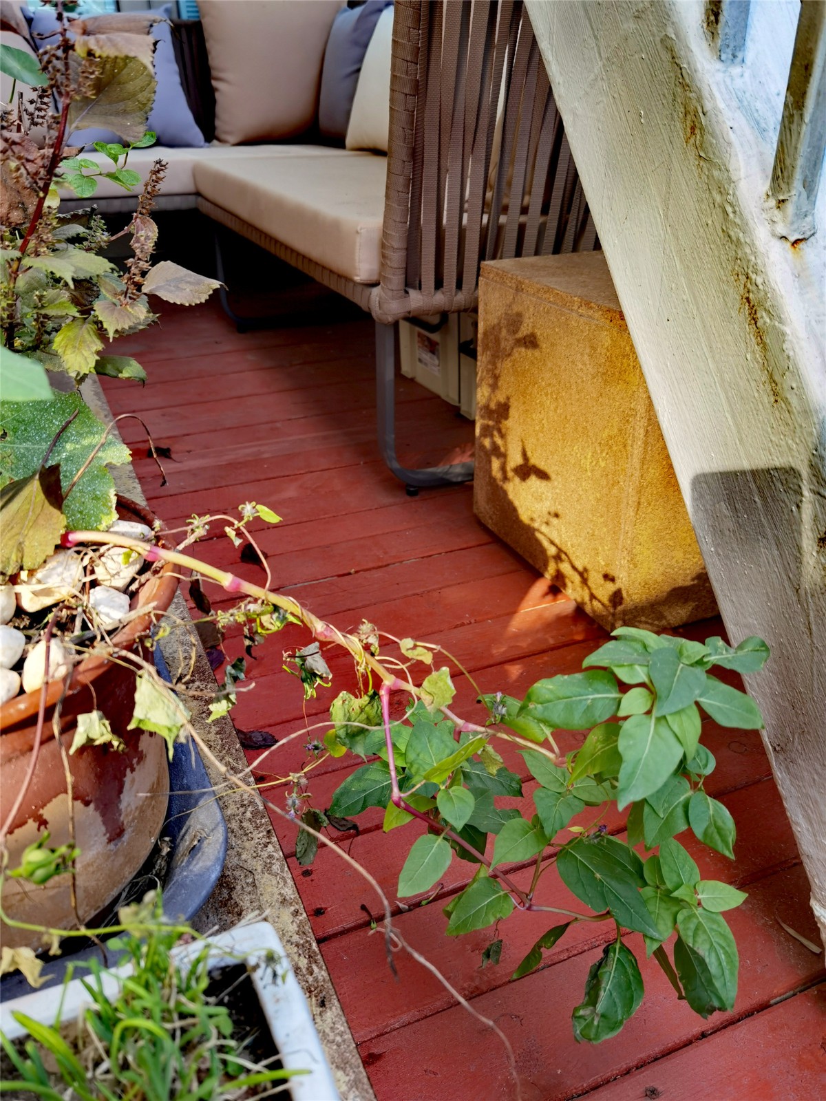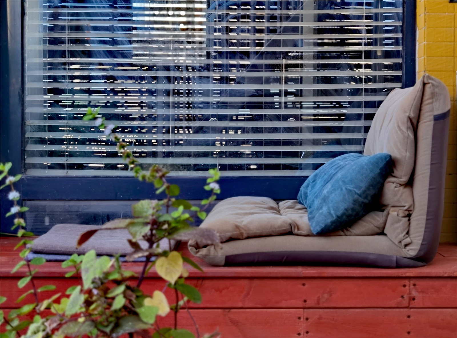 長(zhǎng)長(zhǎng)的花臺(tái)來自室內(nèi)廢棄床具的一部分,清理后刷2遍防腐木油就成為一個(gè)非常適合沙發(fā)高度的條幾和花臺(tái)