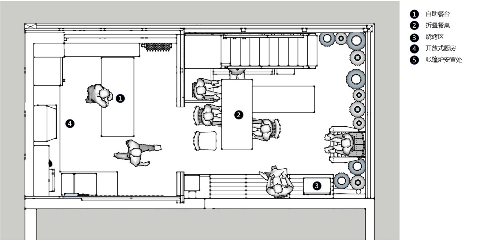 ▼一個(gè)開放式廚房+室外院落的燒烤、茶飲聚會(huì)空間(當(dāng)廚房玻璃門全部打開時(shí),室內(nèi)外空間是流通的。)