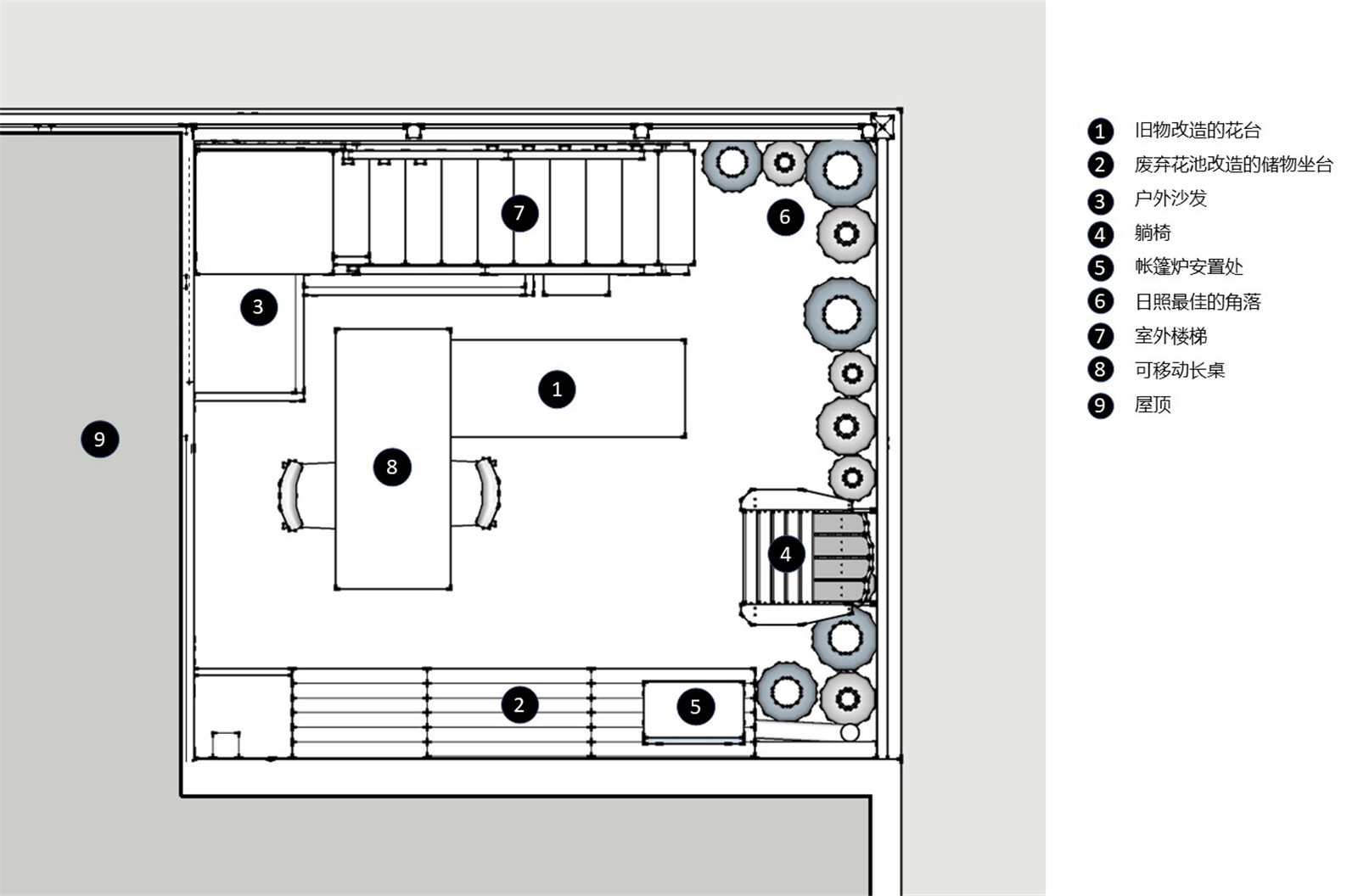 2021年七月,經(jīng)歷疫情又無法離開城市的人們,始終向往與自然、天空、大氣、樹葉、植物,更多的接觸,于是有了這個(gè)天臺(tái)小院微改造,希望將這小塊距離人類最近的室外,改造為城市屋頂上的一個(gè)小小庭院,一塊綠色屋頂,同時(shí)將工作室內(nèi)廢棄的家具拆分并做防水處理,在室外做二次利用。