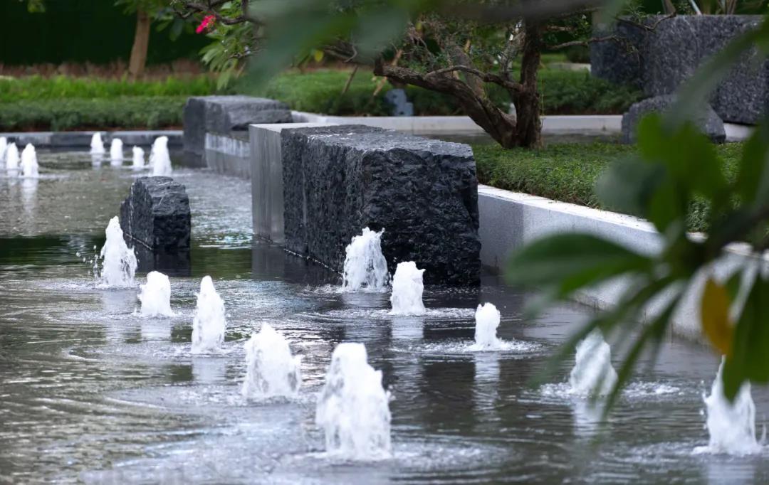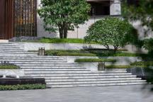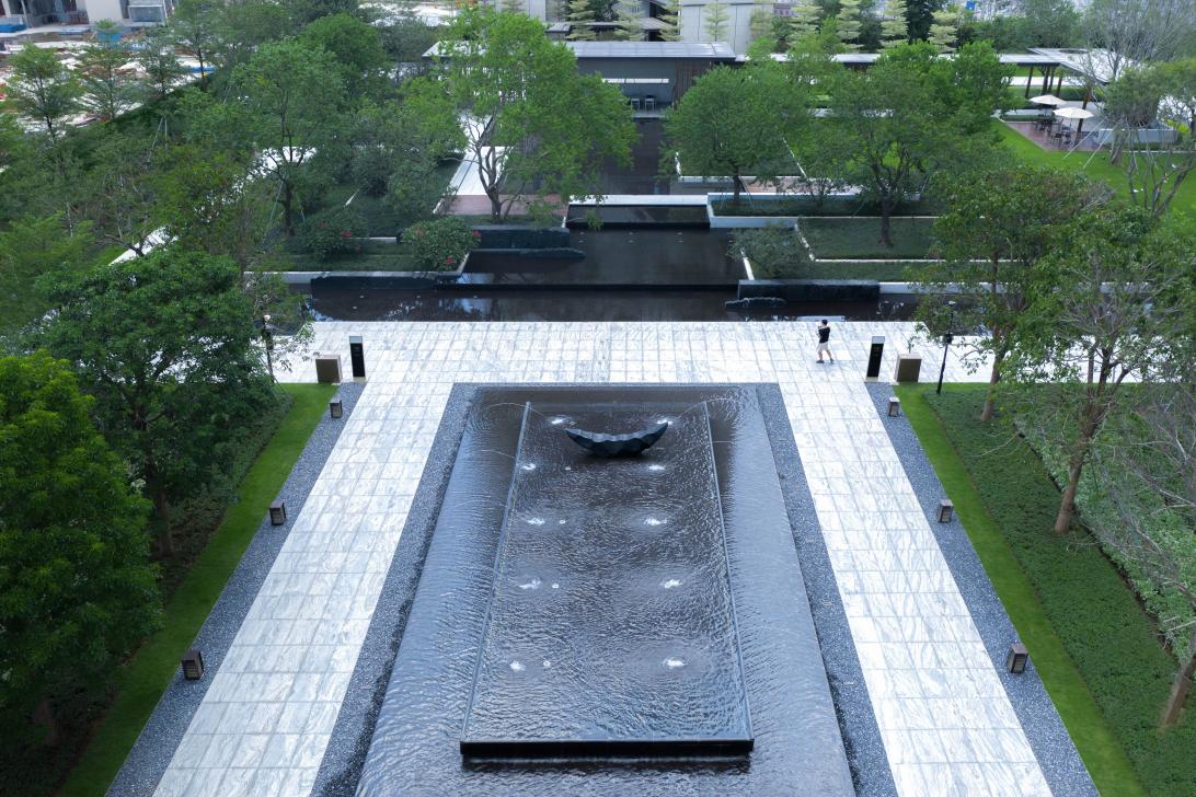 穿過涼風習習的樹陣,眼前乍現(xiàn)的主入口空間極具現(xiàn)代東方格調,開闊又充滿儀式感,信步拾級而上,涌泉相迎,山影疊巒間綠植旁逸,隨著高差景觀的變化,搭配造型優(yōu)美的喬木,以及修剪整齊的綠籬,整體給人豐富的層次感,莊重而又不失俏皮,簡潔大氣的序列空間強化出景觀的軸線美感,令來者盡享歸家愉悅。