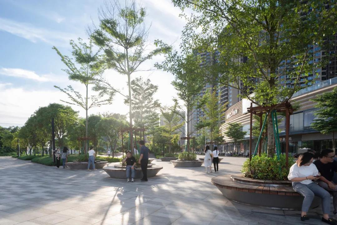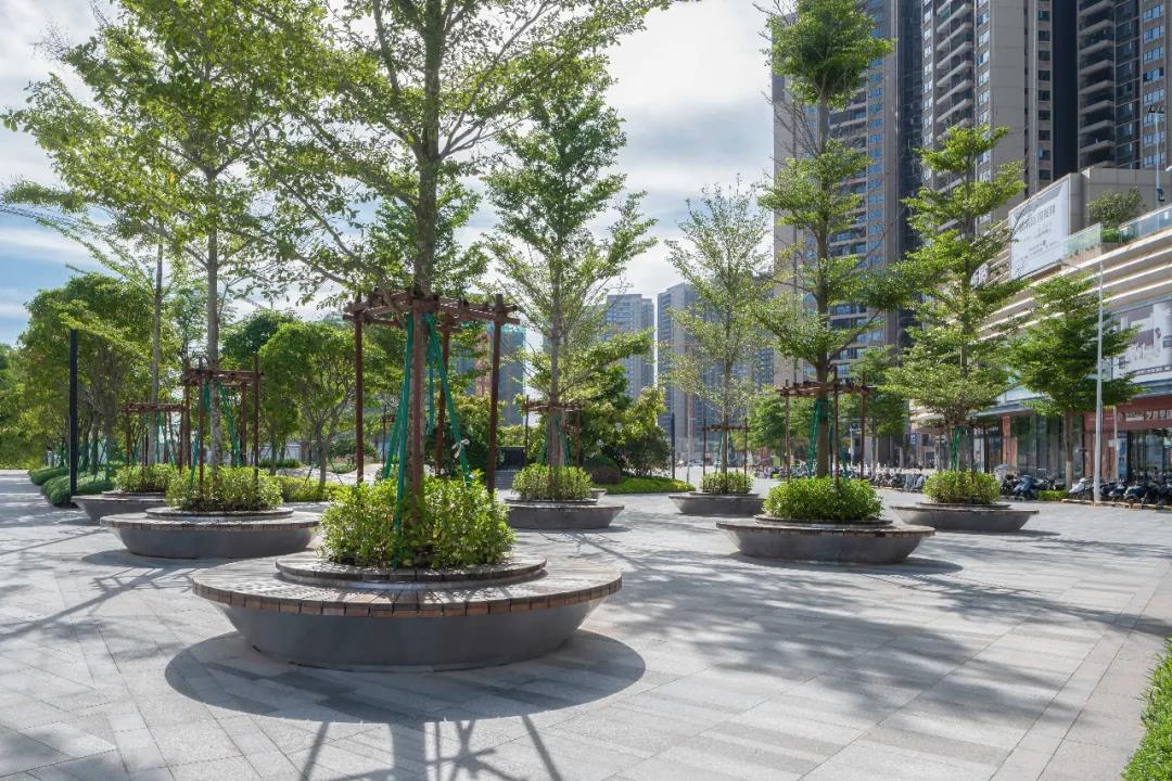 簡(jiǎn)潔大氣的設(shè)計(jì)與植物具有引導(dǎo)性和連續(xù)性,主要采用大喬木加地被的種植方式,地被采用耐修剪植物營(yíng)造整潔的公共空間。在一定程度上保證了人的視線范圍內(nèi)的通透性,同時(shí)提供林蔭給行人,營(yíng)造爽朗通透的景觀,于綠影斑駁中盡享慵懶舒適的愜意生活。
