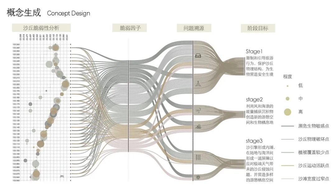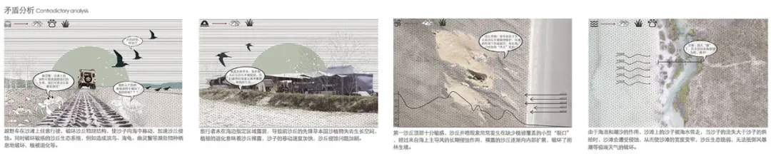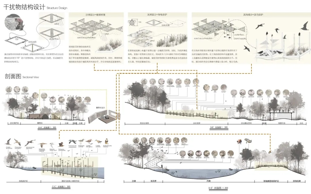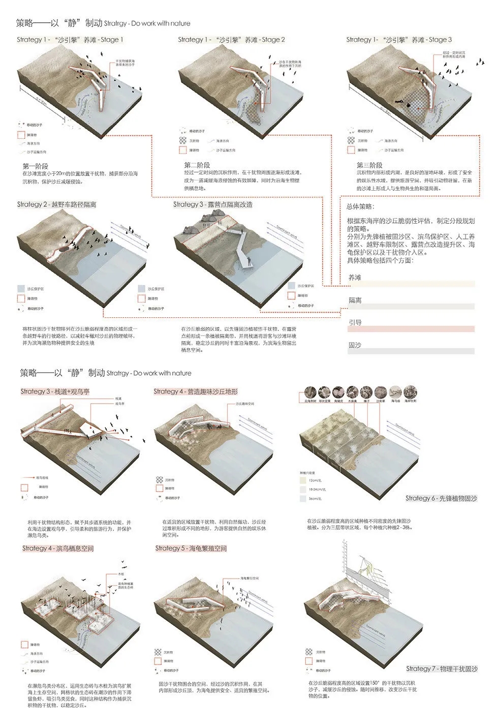 該項(xiàng)目以問題為導(dǎo)向提出“以‘靜’制動”的概念,利用大自然做功。通過 “干擾物”的微介入進(jìn)而影響沙丘運(yùn)動,以緩解海岸沙丘侵蝕的現(xiàn)象。同時(shí)賦予干擾物以不同功能空間,引導(dǎo)新的柔和的游憩行為,并為瀕危物種營造安全、適宜的沙丘生境,恢復(fù)韌性沙丘生態(tài)系統(tǒng),實(shí)現(xiàn)沙丘、生物與人類三者良性共存。