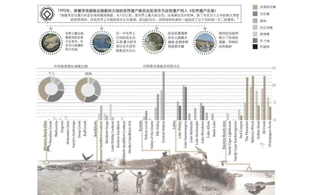 弗雷澤島位于澳大利亞昆士蘭州東部海岸線上,是世界上最大的沙島,島上生長著高大茂密的熱帶雨林,擁有獨(dú)特豐富的生物多樣性,屬于世界自然景觀遺產(chǎn),同時(shí)也是著名的旅游勝地。然而,旅游給場地帶來經(jīng)濟(jì)效益的同時(shí),也破壞了沙丘生態(tài)環(huán)境,加速了該島沙質(zhì)海岸的物理結(jié)構(gòu)變化。另外,受強(qiáng)風(fēng)、海浪、潮汐甚至風(fēng)暴潮等極端天氣的影響,沙丘上顆粒較小的沙子正在持續(xù)流失。數(shù)據(jù)表明弗雷澤島正在以0.5m/年的速度向大陸移動,東部海岸受到嚴(yán)重侵蝕,由此衍生的一系列問題還包括沙丘瀕危物種生境破壞和旅游景觀空間衰退。
