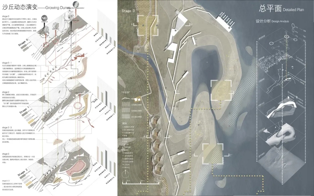 該作品關(guān)注海岸帶生態(tài)修復(fù)熱點(diǎn)問題,通過沙丘動態(tài)模擬技術(shù)提出植入沙引擎、隔離改造、先鋒植物等方法應(yīng)對海岸侵蝕問題,形成集沙丘保護(hù)、生物棲息、游人觀賞多功能于一體的復(fù)合型景觀系統(tǒng)。作品思路新穎、邏輯表達(dá)清晰,對可持續(xù)發(fā)展有一定思考。