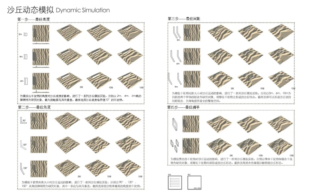 為進(jìn)一步研究不同形態(tài)的“干擾物”與沙丘的互動關(guān)系,在Rhino中運(yùn)用Python Script 進(jìn)行沙丘動態(tài)模擬實(shí)驗(yàn)。模擬了在風(fēng)的作用下,障礙物對沙丘運(yùn)動的影響以及每一階段沙丘形態(tài)的變化。實(shí)驗(yàn)共分為4個(gè)步驟,根據(jù)預(yù)期的“干擾物”功能,分別模擬了不同高度、不同角度、不同間距以及封閉狀態(tài)下沙丘的動態(tài)變化。最終得出沉積效率最高的干擾物結(jié)構(gòu)形態(tài),并運(yùn)用到策略中。