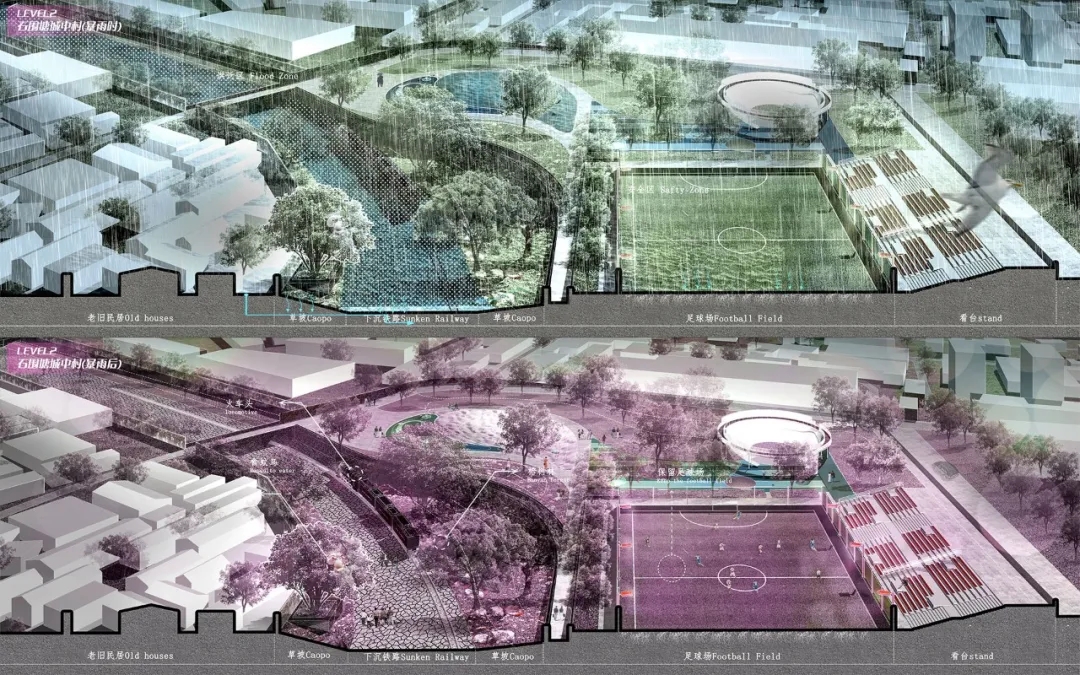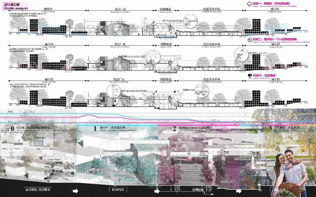 城中村及周邊鐵路韌性設(shè)計(jì)意向圖:通過層級(jí)規(guī)劃將居民區(qū)無法的積水引入到廢棄鐵路中央,打造線性的親水韌性景觀空間。晴天時(shí)可作為當(dāng)?shù)鼐用駣蕵返膱?chǎng)所,雨天時(shí)又可作為臨時(shí)的洪泛區(qū)。