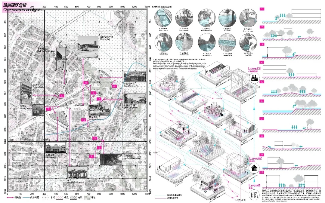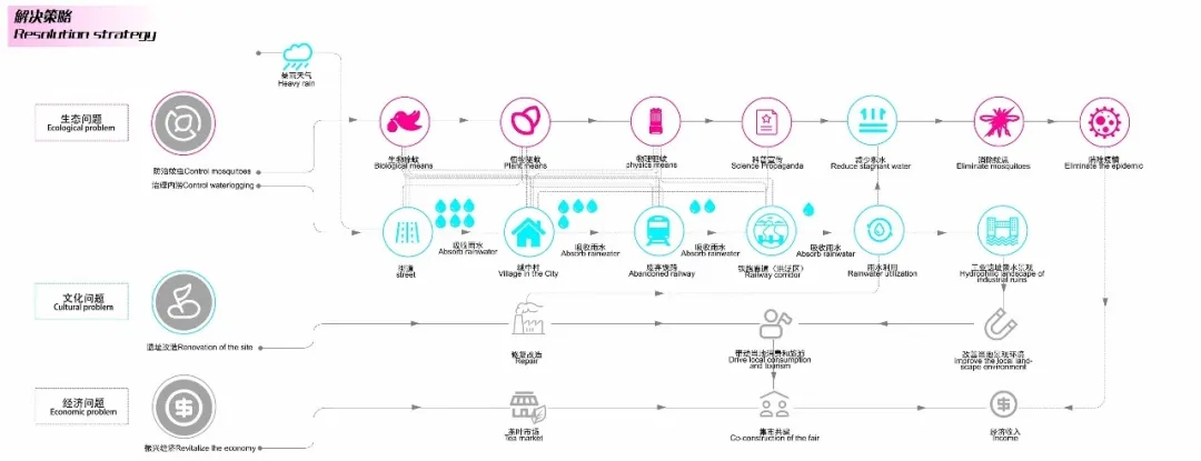 廣州市石圍塘廢棄火車站及其城中村因地形下洼,設(shè)施老舊,在受到廣州暴雨天氣時(shí),內(nèi)澇積水的存在致使蚊蟲得到大量繁殖,一度成為全國登革熱最嚴(yán)重的地區(qū)。同時(shí)場(chǎng)地?fù)碛胸S富的鐵軌等工業(yè)遺產(chǎn)資源,周邊依附的城中村居民經(jīng)濟(jì)狀況單一,該區(qū)域整體活力狀態(tài)亟待被設(shè)計(jì)創(chuàng)意所激活。一方面,通過LID雨洪管理下的蚊蠅管理措施,將積水通過層級(jí)規(guī)劃排盡或引入最為低洼的鐵路廊道,通過對(duì)低洼地帶進(jìn)行韌性景觀公園的打造,減少居民區(qū)積水的同時(shí)營造豐富的親水景觀,改善當(dāng)?shù)氐姆e水及蚊蟲現(xiàn)狀。另一方面,通過對(duì)沿鐵軌及沿低洼地帶的場(chǎng)所的設(shè)計(jì)改造,鼓勵(lì)城中村村民與外來商旅、游客的“集市共建”,從而振興當(dāng)?shù)氐奈幕c經(jīng)濟(jì)。