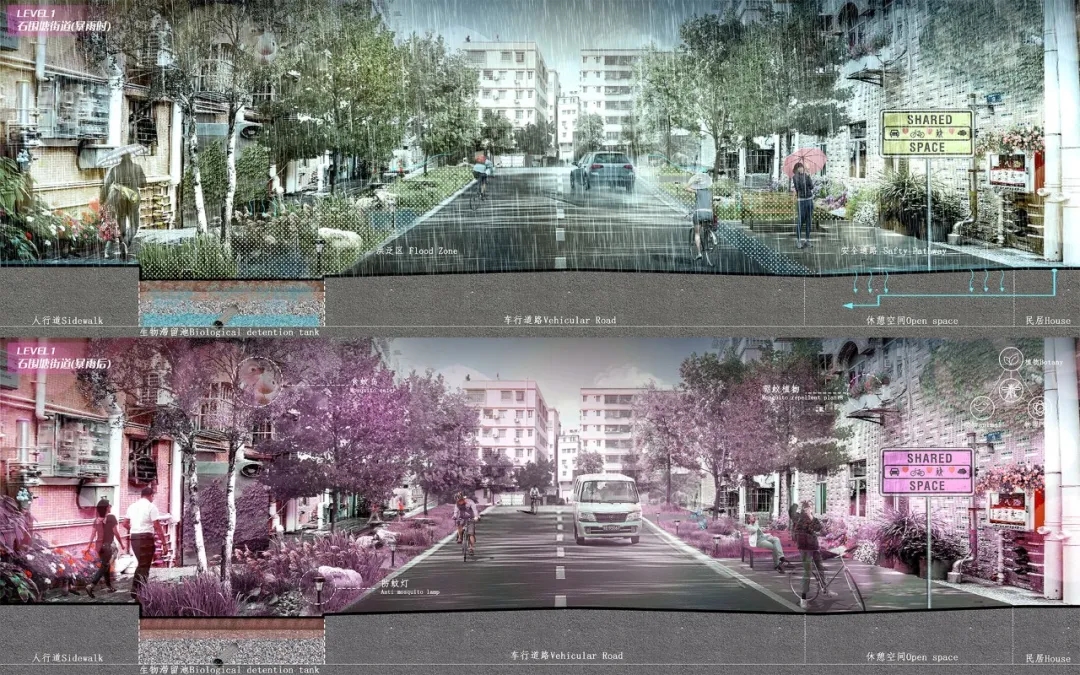 城中村街道設(shè)計(jì)意向圖:改造的街道遇到極端暴雨天氣時(shí),將雨水暫時(shí)排入生物滯留池中避免積水在住宅與路面上滯留,之后通過生物滯留池里的驅(qū)蚊植物、街道林蔭中的食蚊鳥等動(dòng)物、人工物理干預(yù)三種途徑來遏制蚊蟲的繁殖,從而制止登革熱的發(fā)生。