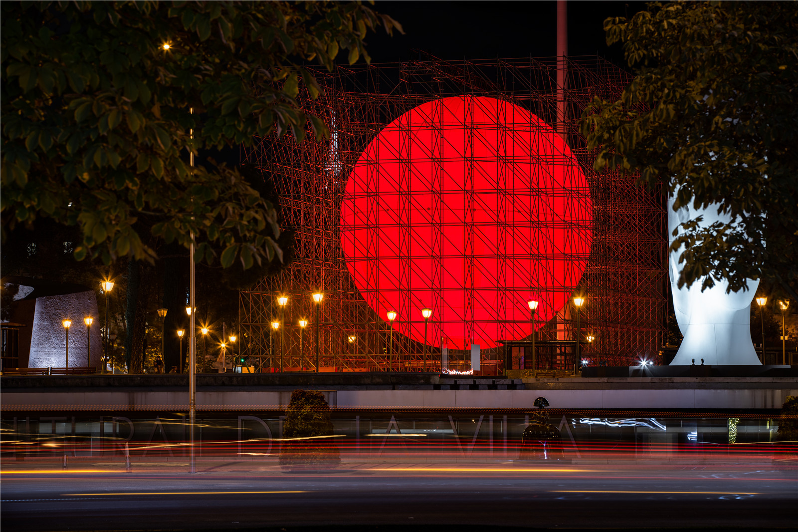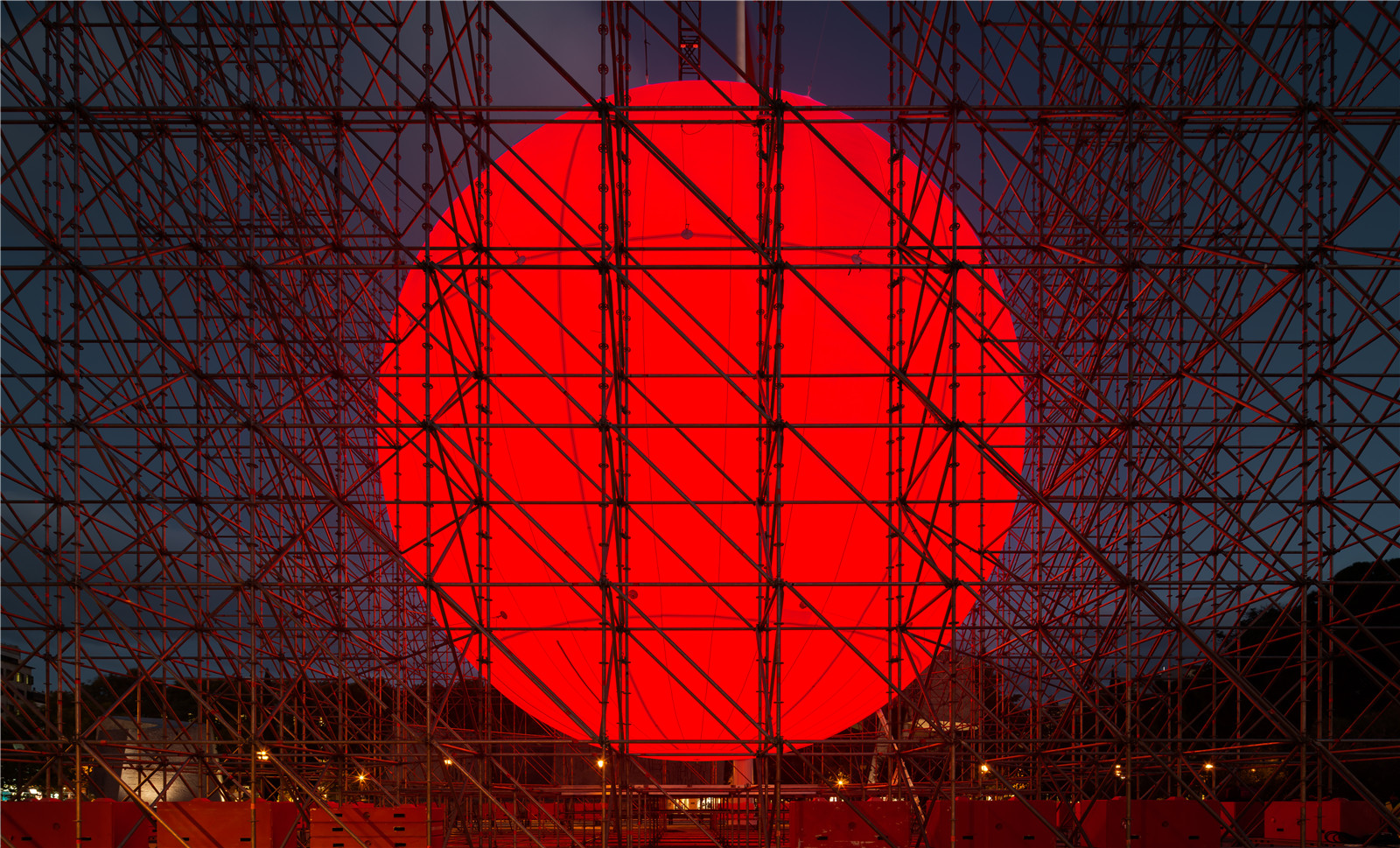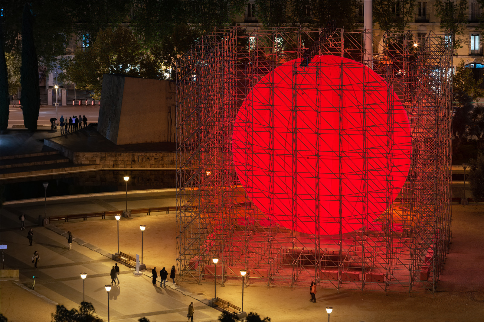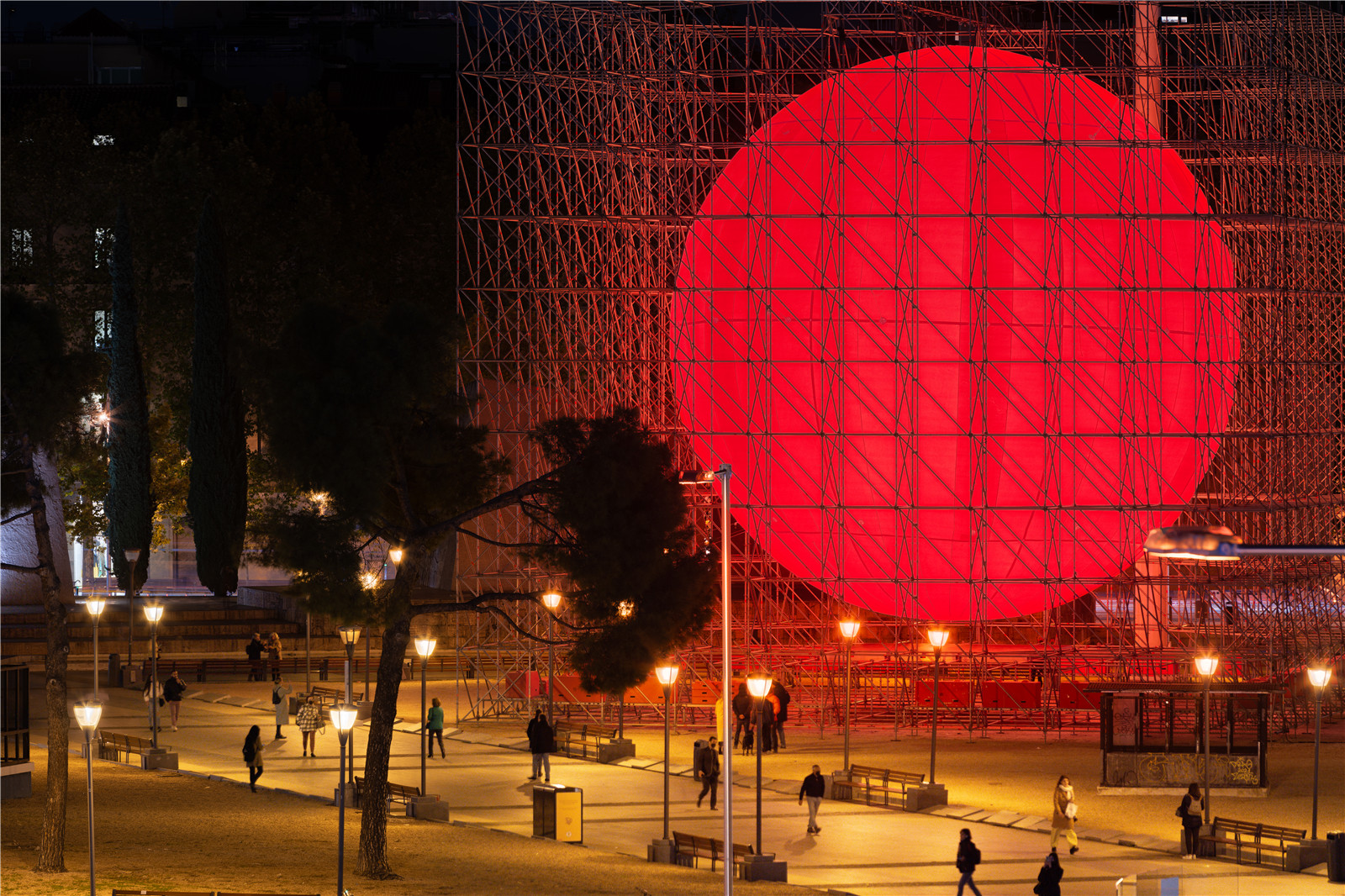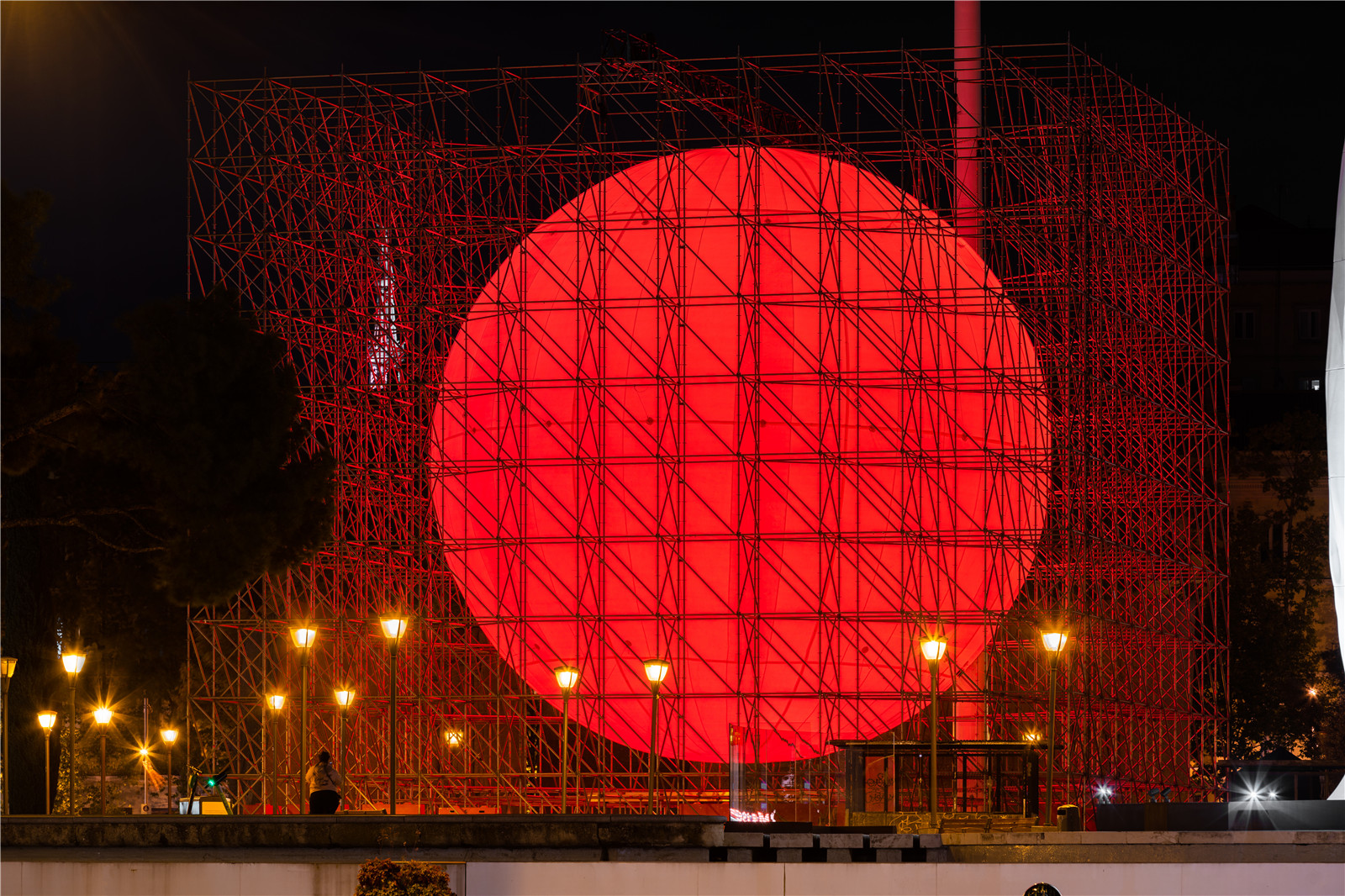 In “Tierra”, SpY presents an artistic project made up of a luminous red sphere caged inside a cube-shaped structure, constructed with the the type of scaffolding normally used on