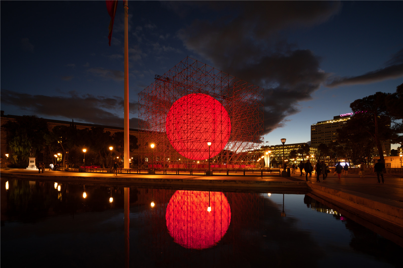 These 2 simple geometric elements (sphere and cube) form a large-scale construction which stands almost 25 metres high and has been installed in Plaza de Colón in Madrid. This powerful visual statement is accompanied by a bright red light emanating from inside the sphere, from which one can almost feel the heat transmitted by the concept of the work. In Europe, the Columbia spirit represents exploration and hope, while the red sphere represents life and sunshine, and the combination of the two represents survival and life.