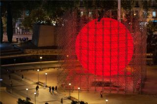 A giant luminous red sphere sits in Madrid's Plaza de Colón. ?Ruben P Bescos
