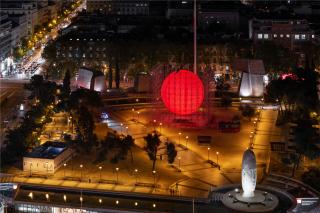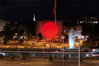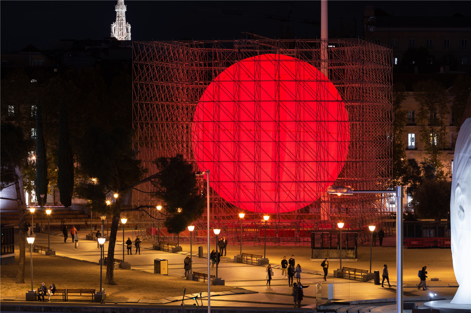 ▼巨型紅色發(fā)光球體坐落在馬德里科隆廣場上
