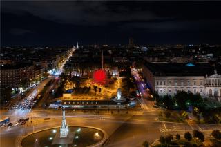 ▼空中俯視馬德里科隆廣場,紅色球體在黑暗中奪目地矗立著。