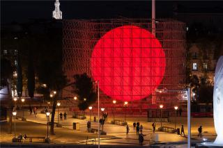 在“地球”這件藝術(shù)作品中,SpY展示了一個被嵌入在立方體結(jié)構(gòu)中的紅色發(fā)光球體,外層框架是用建筑工地上常見的腳手架建造而成。一眼望去,紅色球體所展現(xiàn)的現(xiàn)代藝術(shù)是科隆廣場典雅的宮廷氛圍的視覺張力延續(xù)。