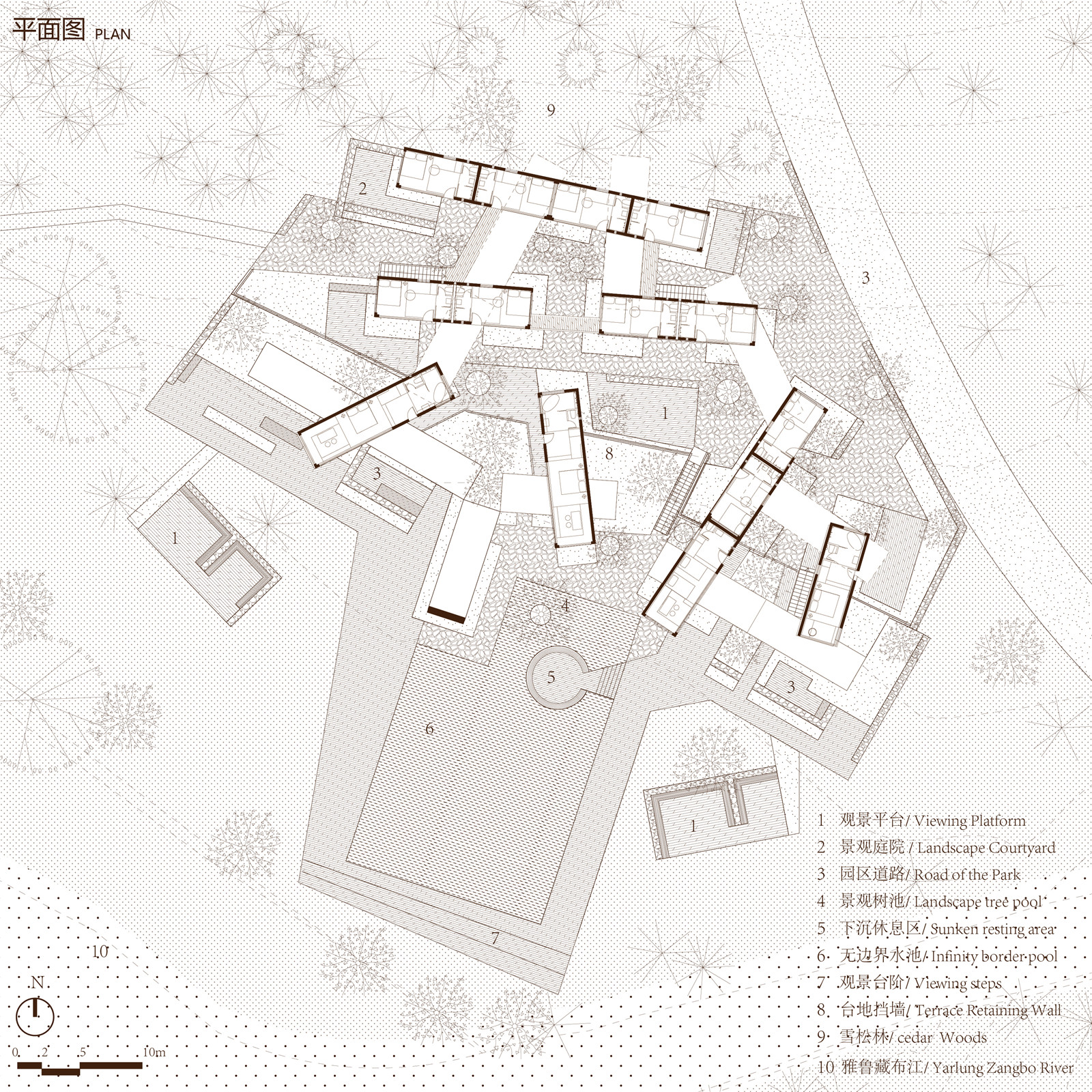 設(shè)計(jì)概念建立在尊重西藏人文景觀及自然景觀的基礎(chǔ)上,挖掘景觀與建筑的密切關(guān)系。古桃樹林作為場地內(nèi)自然景觀的原始價(jià)值體現(xiàn),我們保留了場地內(nèi)的古桃樹林,利用及梳理場地內(nèi)零碎的石塊,與新的房車道路有機(jī)結(jié)合在一起,耐候鋼板的邊緣界定礫石營位與地被植物,這種自然結(jié)合生成的圖案構(gòu)成新的大地景觀。原始場地的石塊堆疊圍合再生成景觀樹池,既凸顯古桃林群的主體景象,亦體現(xiàn)再利用性及生態(tài)性。