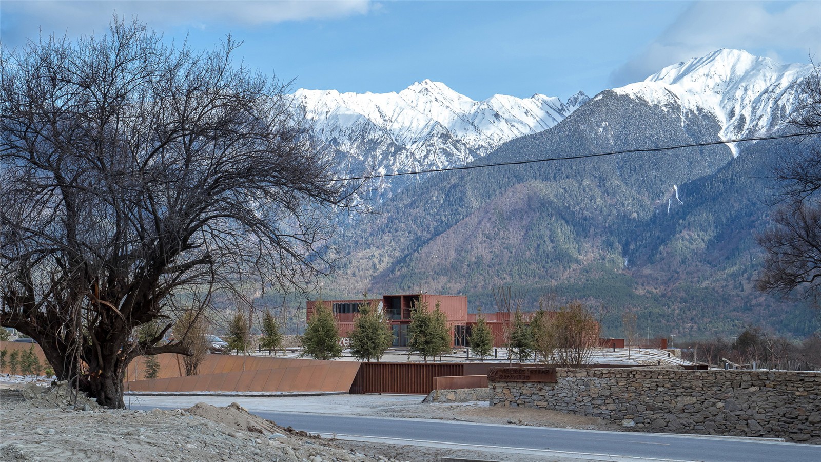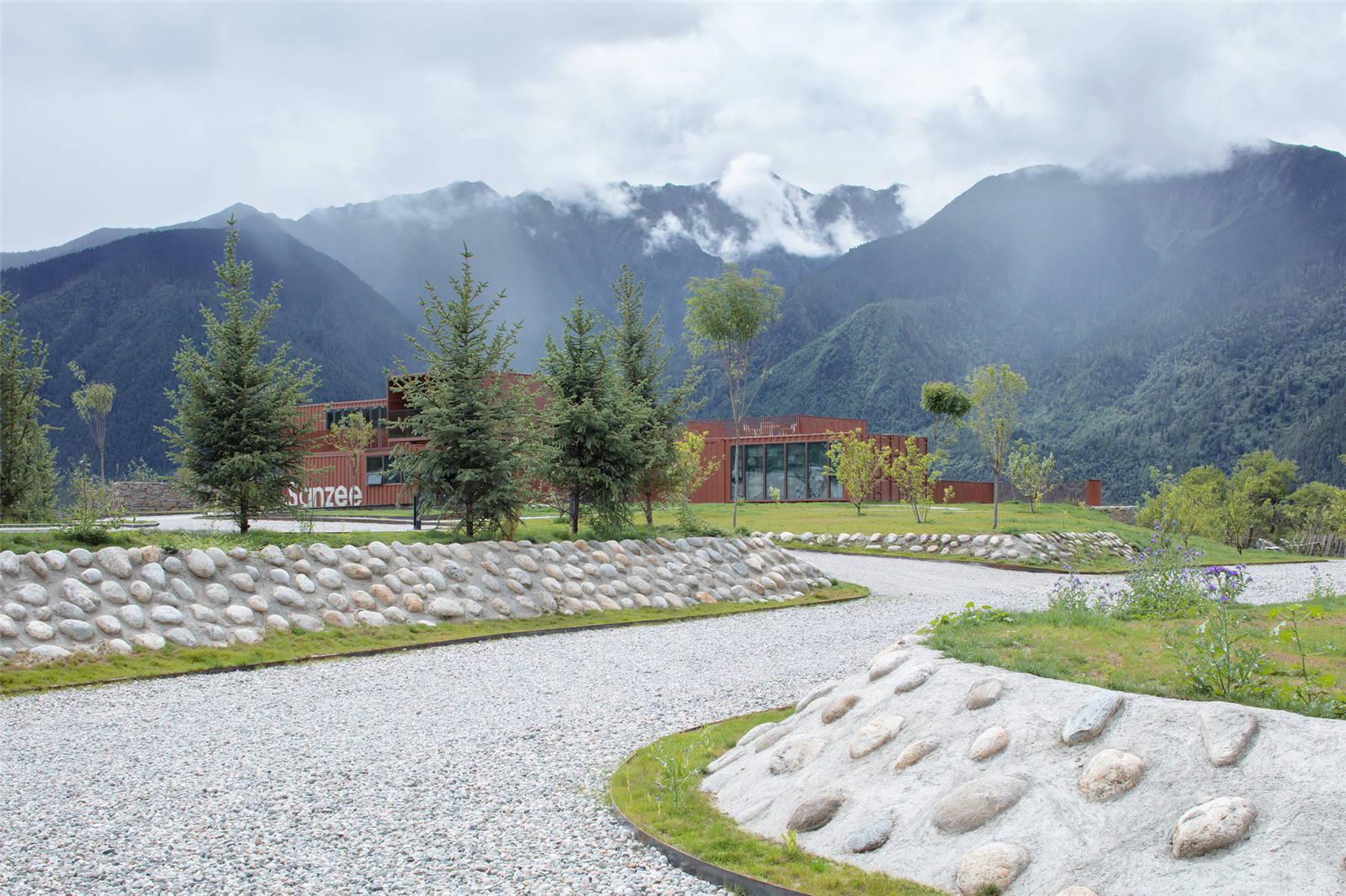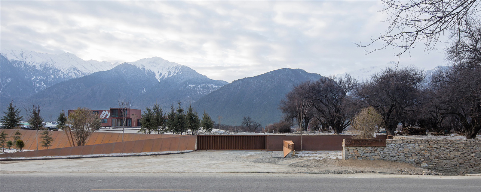 The design concept is based on respecting the cultural and natural landscape in Tibet. We explored the close relationship between landscape and architecture. As the original value of the natural landscape in the site, the ancient peach tree forest was preserved. We made use of the scattered stones, that organically bonded with the New Rv road.The edge of the weather-resistant steel defines the area of ground covers and the Rv parking space forms a new earthscape. The stones of the original site are stacked and enclosed to regenerate the landscape tree pool, which not only highlights the main scene of the ancient peach forest group, but also reflects the reuse and ecology.