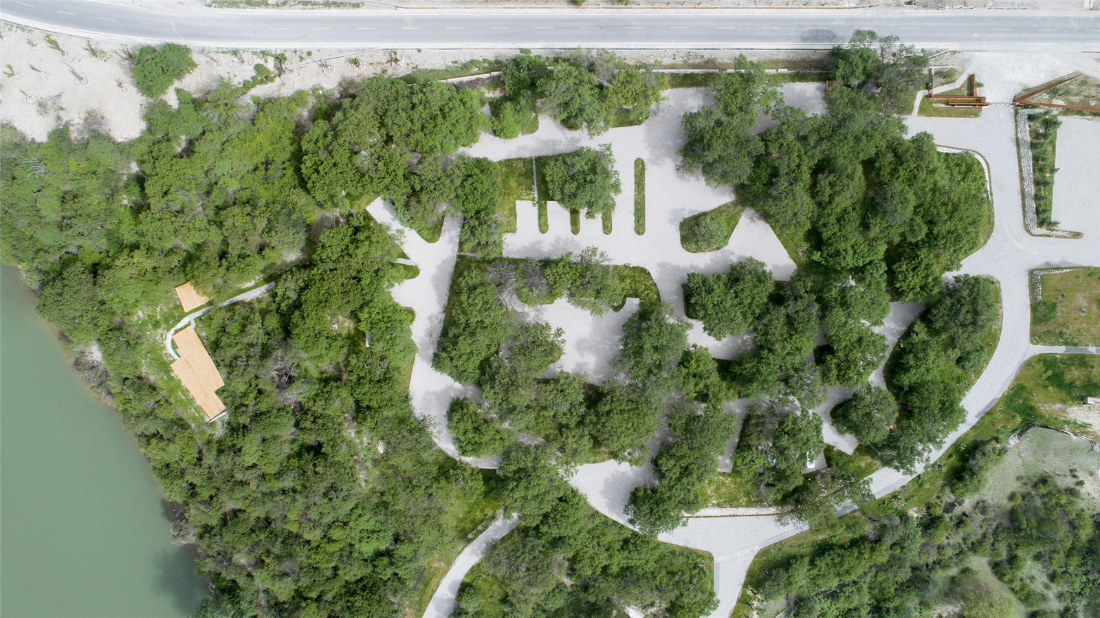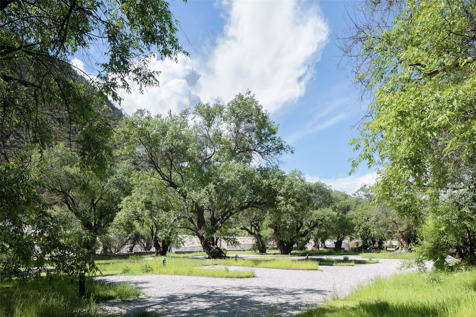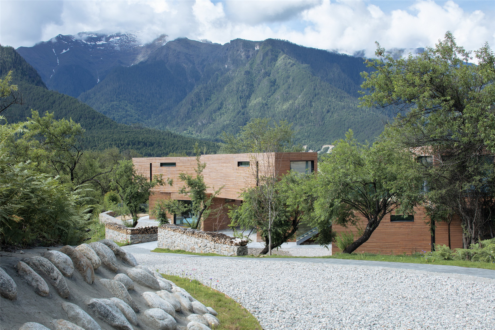 The design concept is based on respecting the cultural and natural landscape in Tibet. We explored the close relationship between landscape and architecture. As the original value of the natural landscape in the site, the ancient peach tree forest was preserved. We made use of the scattered stones, that organically bonded with the New Rv road.The edge of the weather-resistant steel defines the area of ground covers and the Rv parking space forms a new earthscape. The stones of the original site are stacked and enclosed to regenerate the landscape tree pool, which not only highlights the main scene of the ancient peach forest group, but also reflects the reuse and ecology.