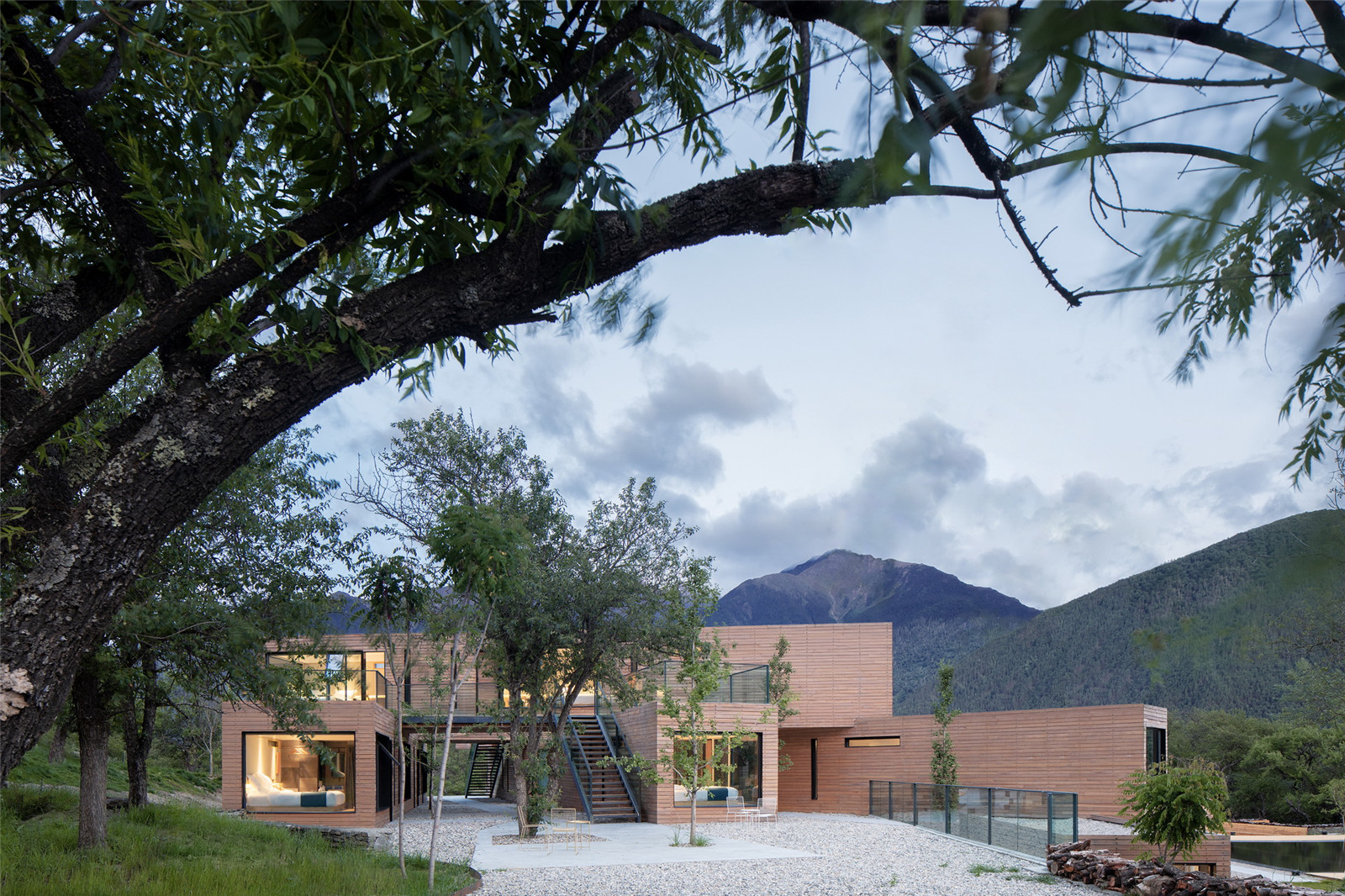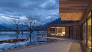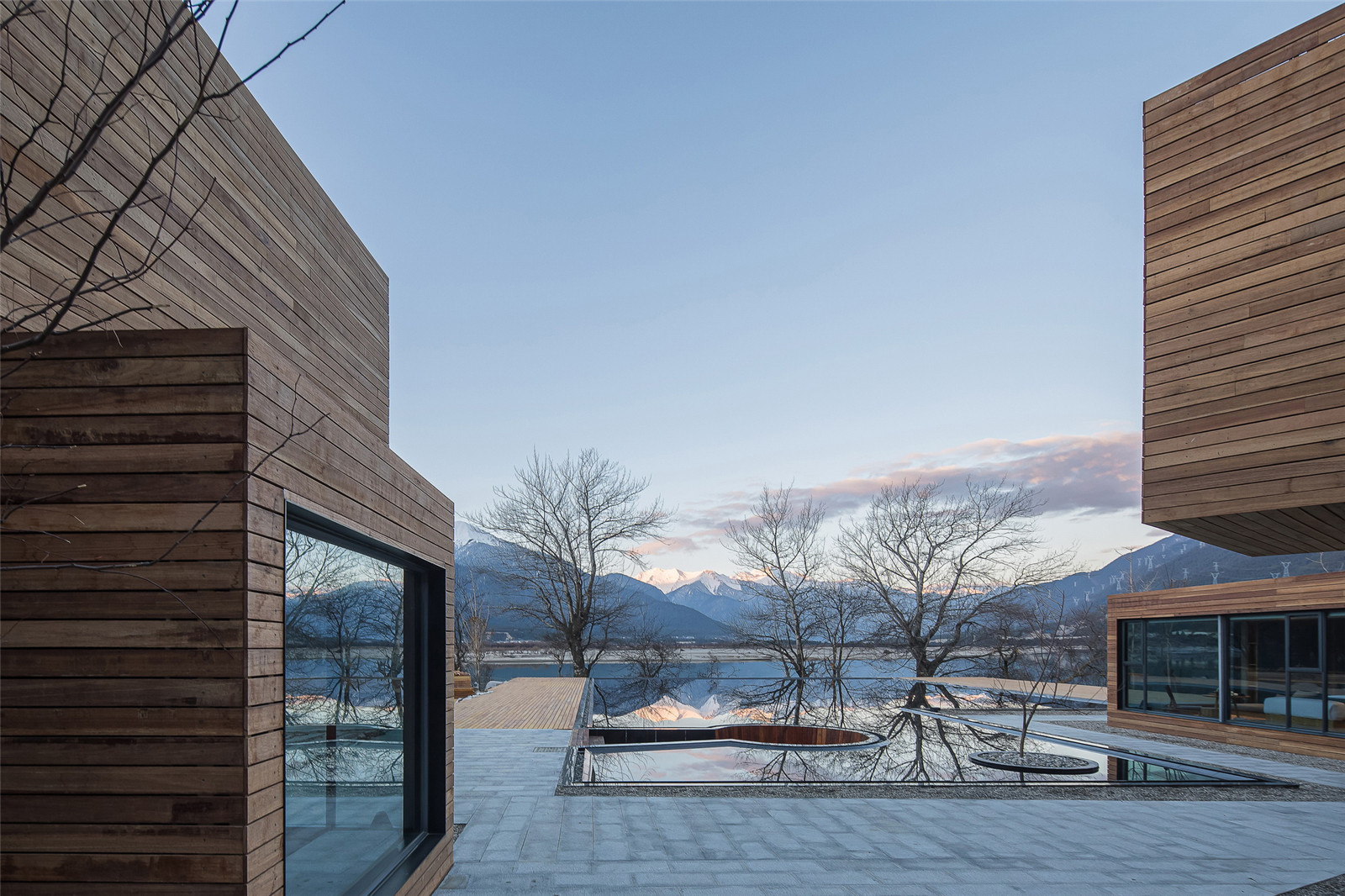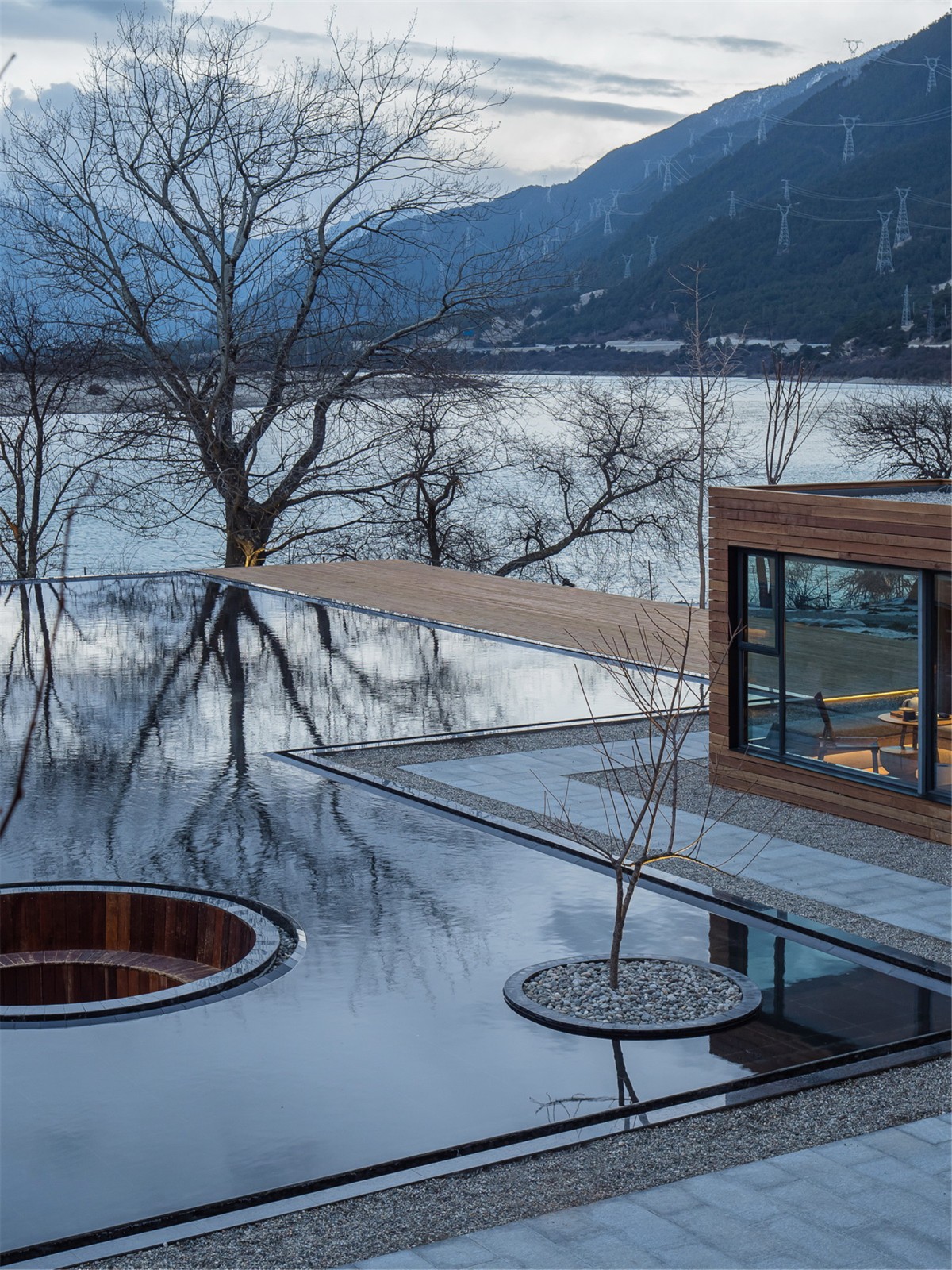 The infinity border pool that connects the containers campsite and the Yarlung Zangbo River landscape form a waterscape in the site and reflected the containers, Marebang mountain, and the landscape of Xue Ga Ru Snow Mountain. The sunken resting place in the pool and the wooden platform on the edge and wooden bench on the steps provided landscape functions of viewing, communication and resting.