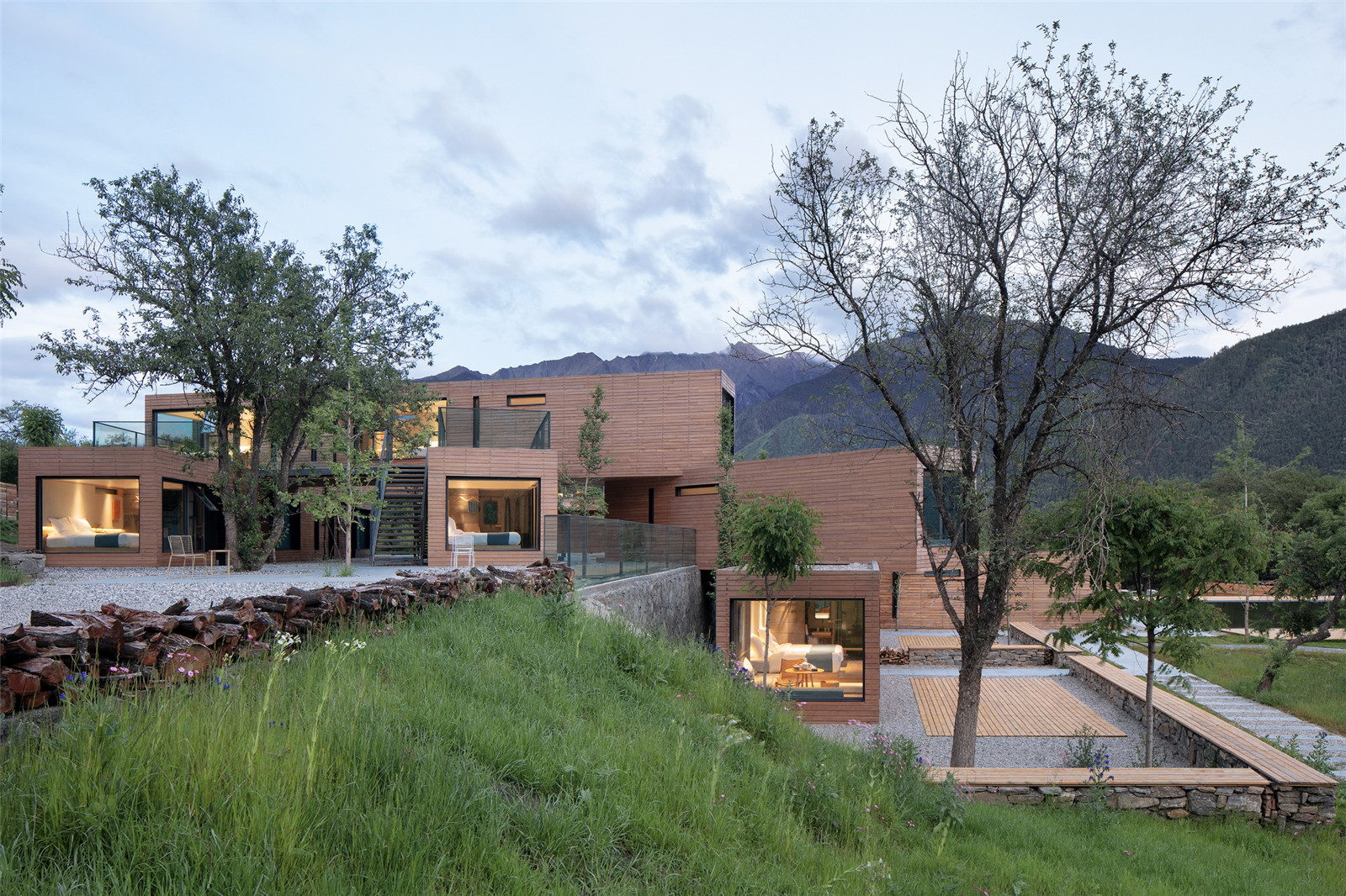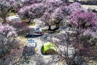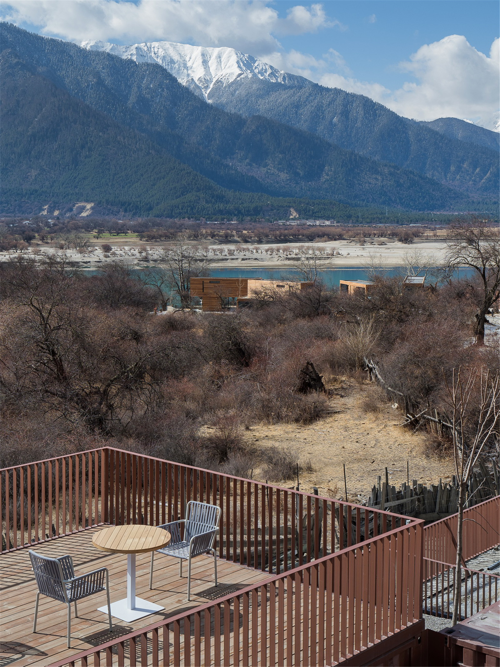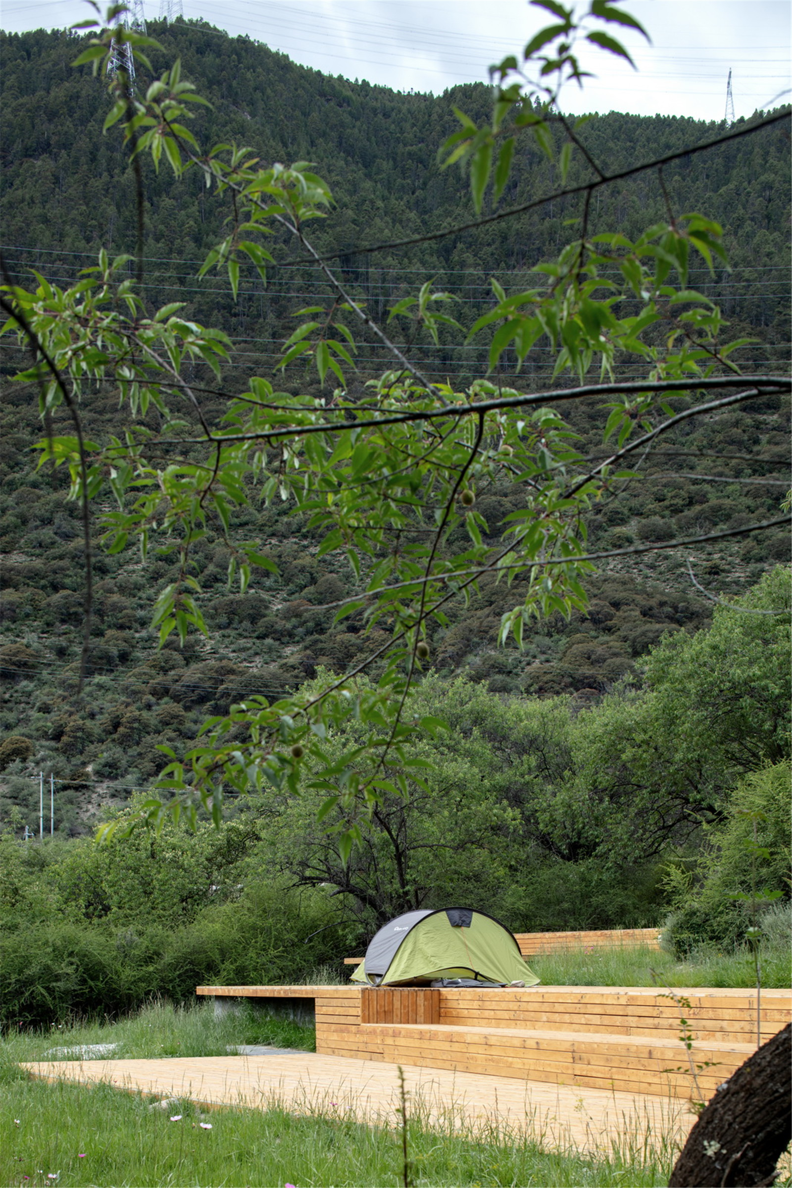 The project is Sanzee Rv self-driving campsite which is beside Peach Tree Road that connects Milin to Linzhi airport. The site is on an embankment, formed by the twist of the Yarlung Zangbo River. There are patches of willow trees where surrounded by continuous snow mountains. To the north is the Lalin section of the Sichuan-Tibet Railway which will be open up in the future. The ancient peach trees forest which consist of trees 300 to 500 hundred years old. In the site there are stones of different sizes scattered. Gesang flowers are mixed with miscanthus, mosses, ferns and other shrubs.