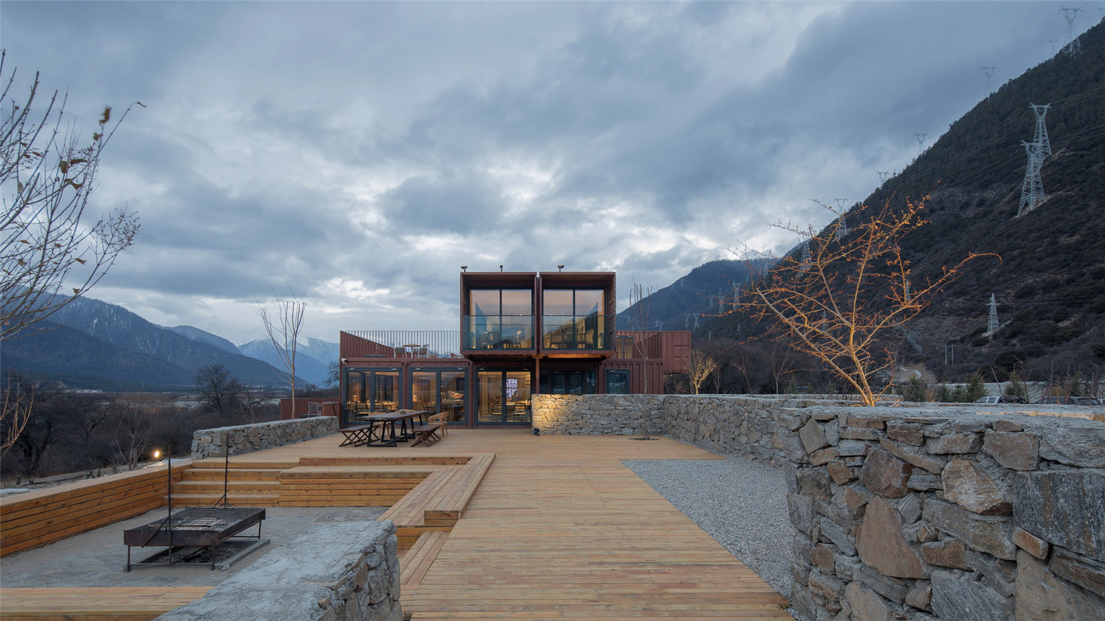 The Marnyi Stone we used for reference to the space in the south of the campsite that faces the Yarlung Zangbo River. The vertical height difference of the site was resolved through the stacking of modular container that formed a large scale earthscape with close integration to the regional environment. This kind of staggering and overlapping containers with temporary light intervention formed the inner courtyard and platform landscape with different morphological scales. It produced various spaces experience to the river view and the super excellent view to the Snow Mountain. The overlapped containers of the reception center produced the resting platform and outdoor barbecue area, wood steps, landscape flower pool and box module that formed a integrated earthscape.