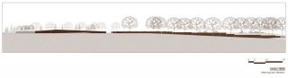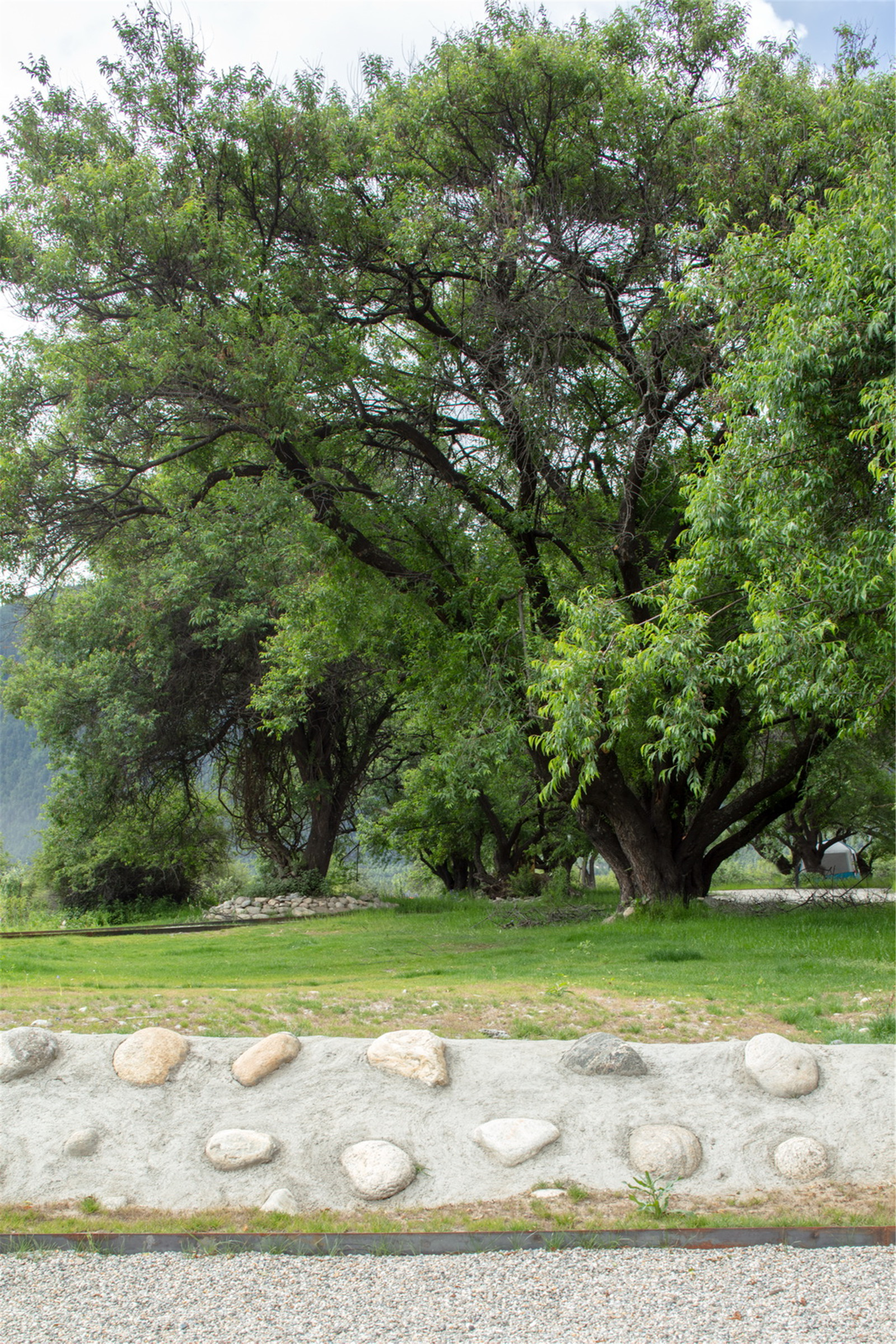 The main entrance of the park is set along Peach Tree Road. The weather-resistant steel plate enclosure turns to form the entrance flower pool that forms an iconic entrance and resolves the vertical height difference of the site boundary. The entrance landscape has mutual echo with the background of the undulating Marebang Mountain. The stone retaining wall constructed by local techniques divides the peach tree forest landscape of the park and the present situation of Peach Tree Road with the level high in the east and low in the west. A landmark retaining wall was constructed with regional materials beside the road. Some part of the wall was disconnected which resolves the terrain difference level and produces rhythmic changes. We respected the space connection of the ancient peach trees. Some part of the retaining wall turns to enclosure and shows the ancient peach trees forest Rv camp landscape at the end of the road corner. The fruit trees and steel bar railings are set to the east of the site making the edge have a natural transition. A viewing walk path is set based on the density of the orginal trees and plants to the west that faces the Yarlung Zangbo River.