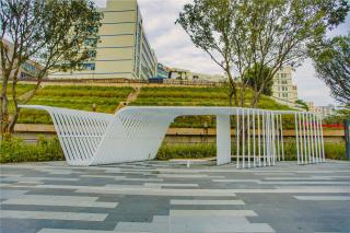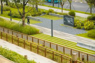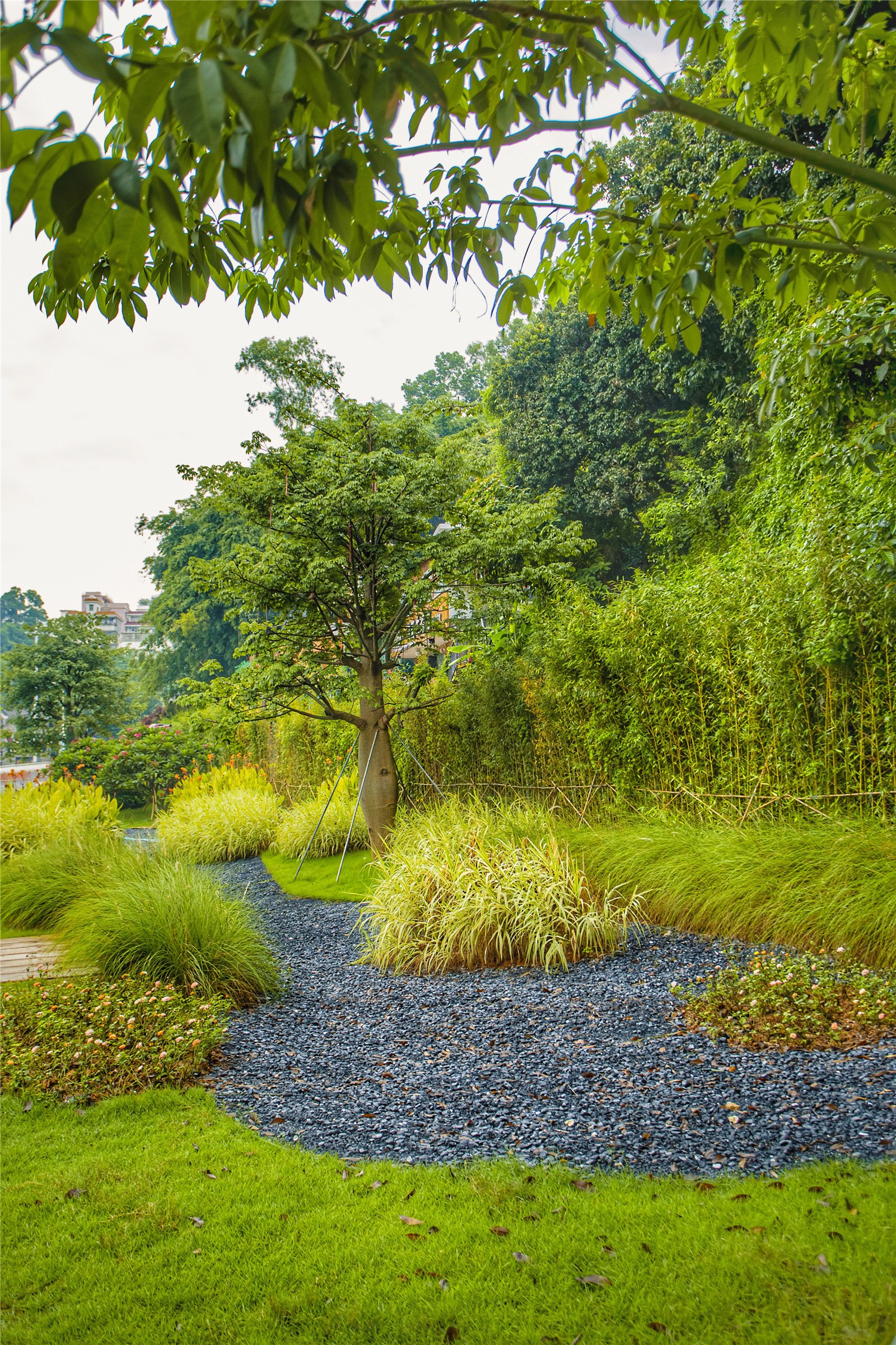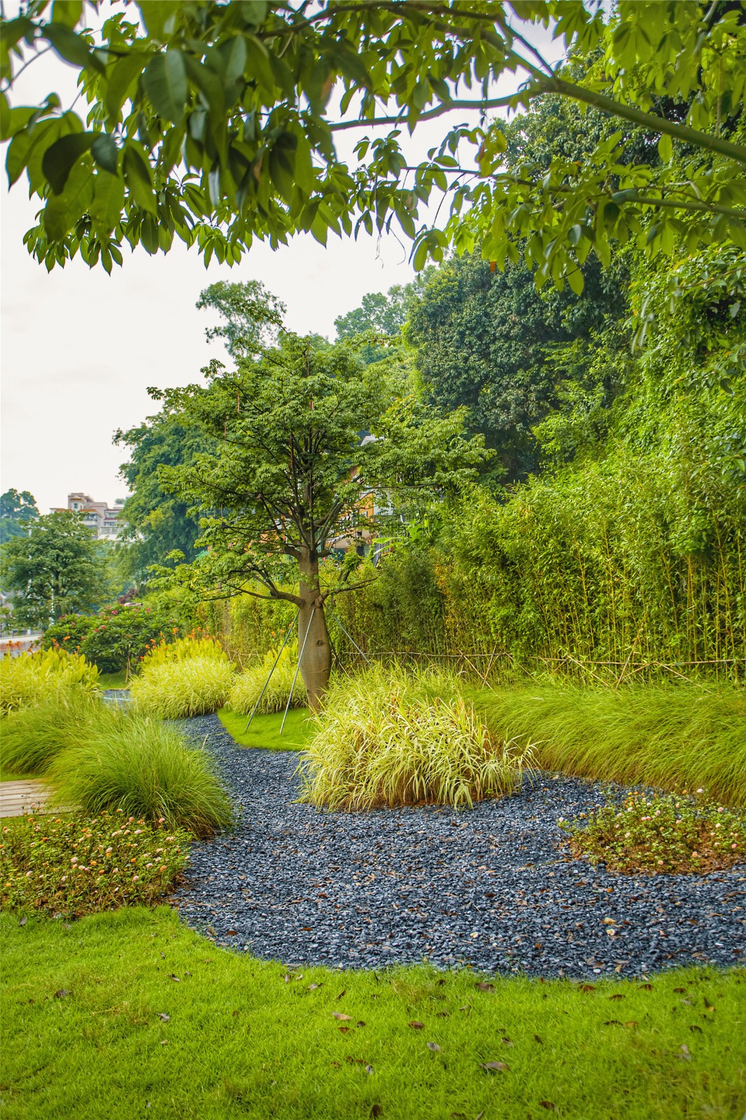 The bird shaped corridor provides an open and diversified resting place and makes the whole space more dynamic. The negative slope is newly planted with green vegetation, which is used as the background of bird Gallery to create a verdant landscape with egrets returning to Gan Keng and four mountains surrounding the flowing water.