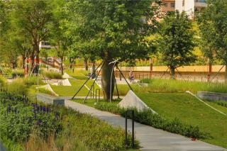 水景、古樹、廣場即承擔(dān)了集散的功能,又是凝聚活力的核心場所。藝術(shù)地形水景如靜景,似女子坐臥窗臺,雨打屋檐;中心噴泉水景如動景,似人們偶談,驚起白鷺。