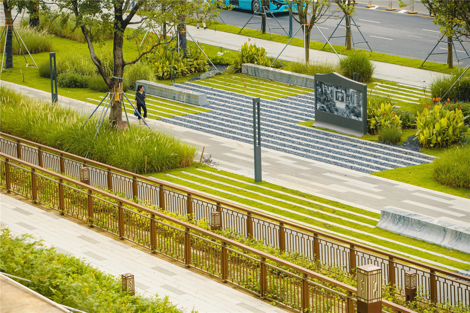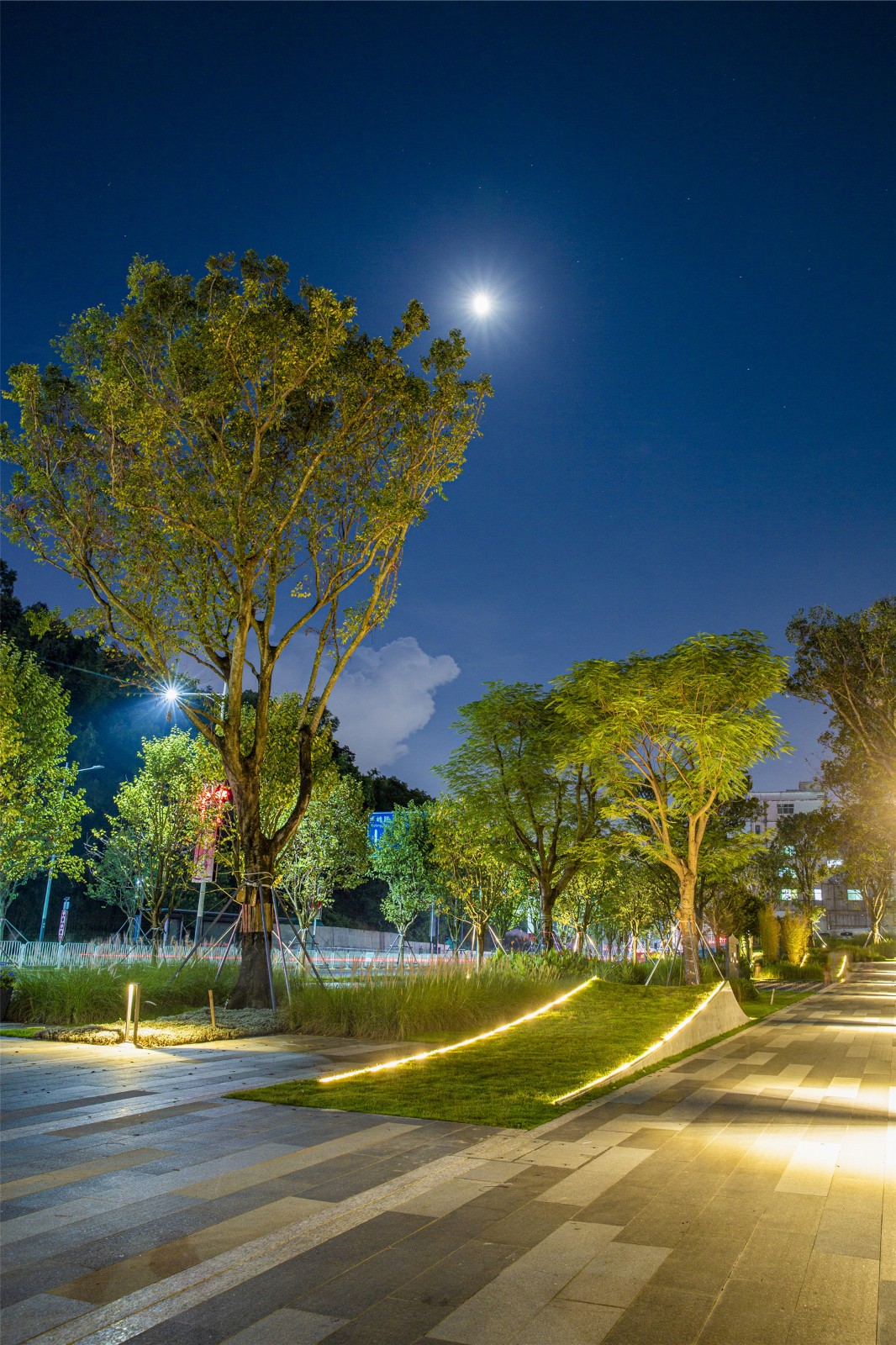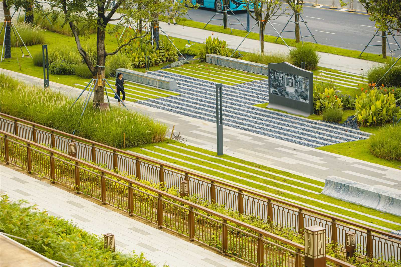 客家建筑屋面的元素給予空間充分的想象力,奔跑的孩童,如飛馳穿梭在層巒疊級的屋頂,一聲呼哨,喚回一群歸巢的白鷺。屋脊、檐角、青磚、瓦片,通過重構(gòu),融入到藝術(shù)地形、廣場坐凳設(shè)計中,點滴細(xì)節(jié)皆是客家文化的縮影。