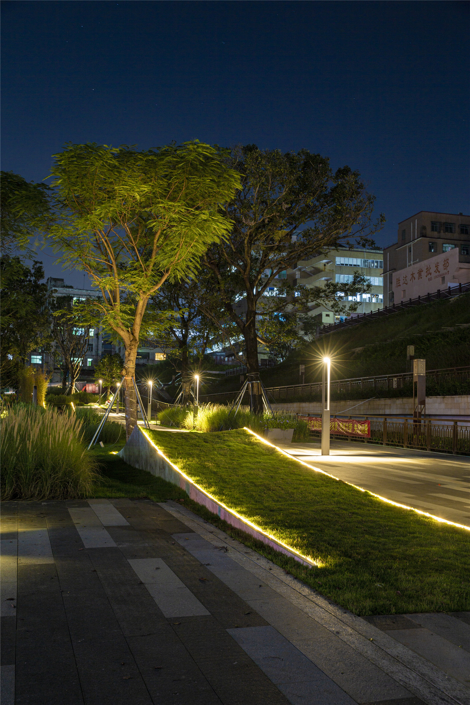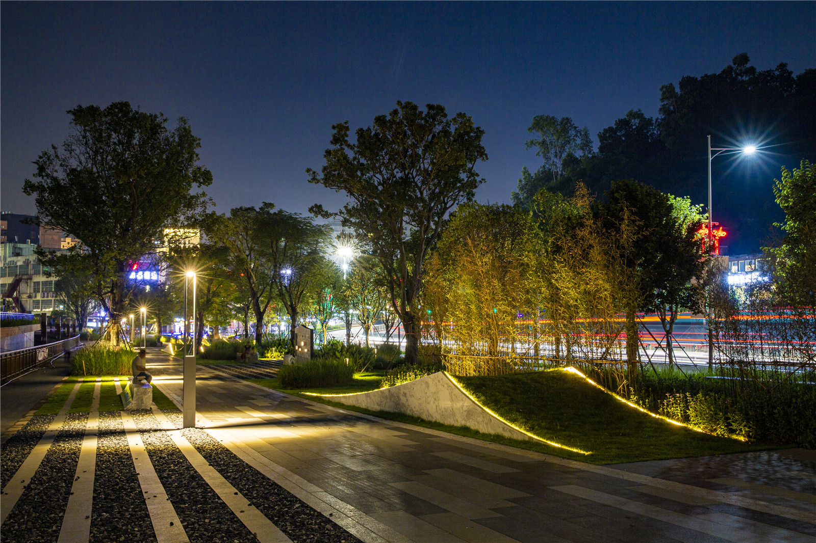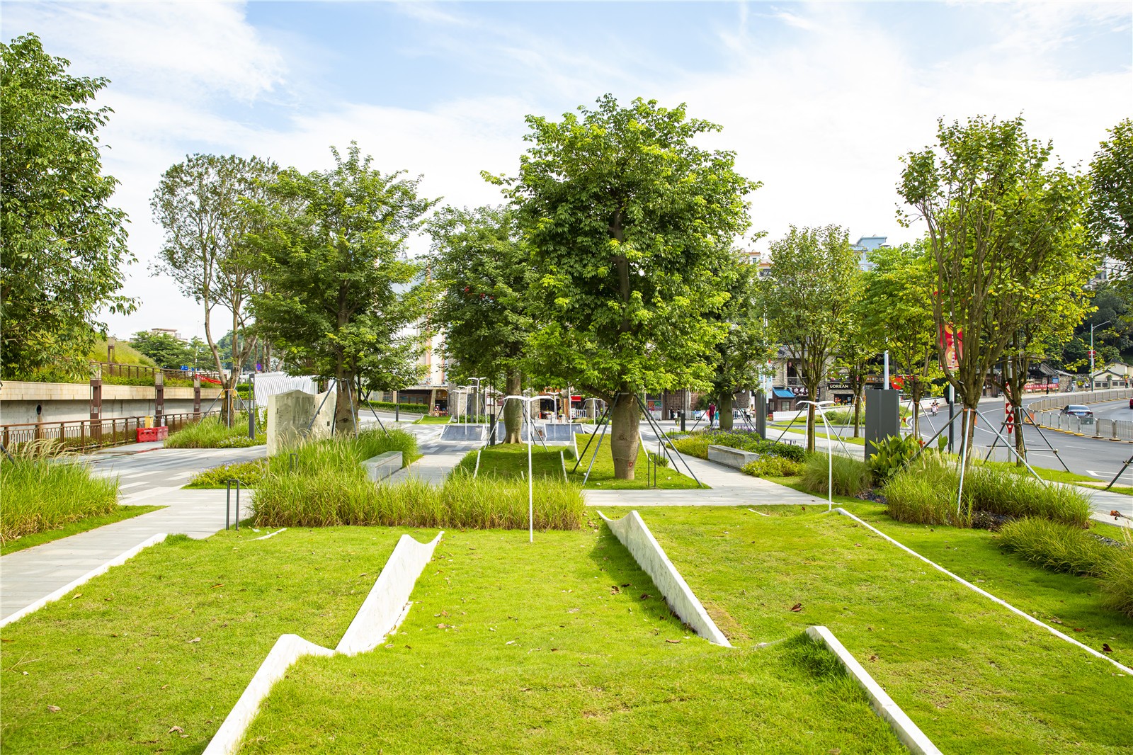 客家建筑屋面的元素給予空間充分的想象力,奔跑的孩童,如飛馳穿梭在層巒疊級的屋頂,一聲呼哨,喚回一群歸巢的白鷺。屋脊、檐角、青磚、瓦片,通過重構(gòu),融入到藝術(shù)地形、廣場坐凳設(shè)計中,點滴細(xì)節(jié)皆是客家文化的縮影。