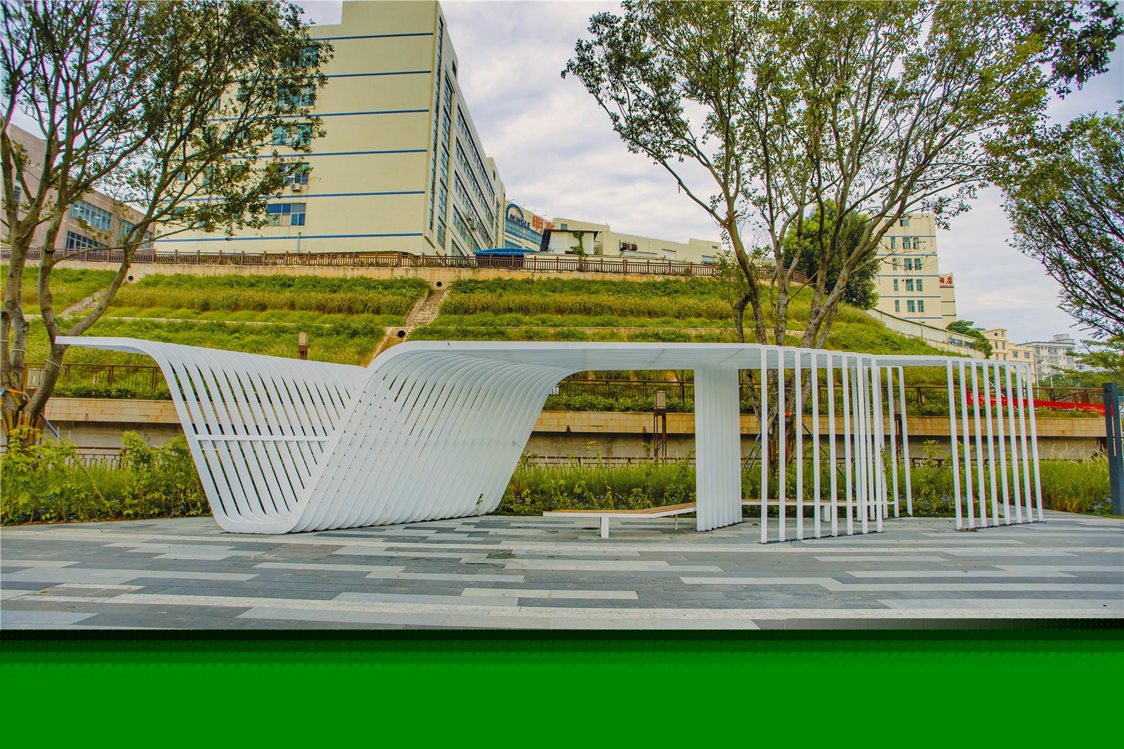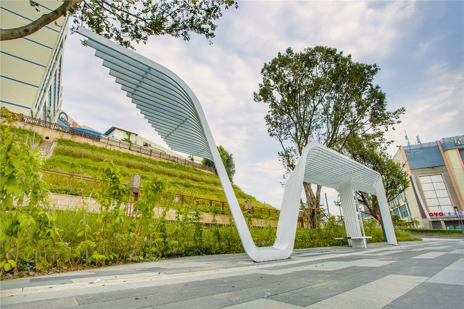 飛鳥造型的廊架提供了開放多元的休憩場地,也使得整個空間更加靈動。消極的邊坡簡單復(fù)綠作為飛鳥廊的背景,營造白鷺歸來甘坑蔥蘢,四山環(huán)繞活水長流的畫境。