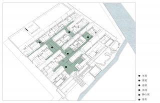 拆除后的空地形成公共庭院,分別命名為水院(Watering Courtyard)、茶院(Tea Courtyard)、游苑(Playing Garden)、泳池(Swimming Pool)、靜心苑(Health Garden)、 田苑(Field Garden),三條主要道路和六個(gè)庭院構(gòu)成一個(gè)網(wǎng)絡(luò),流線方便可達(dá)。