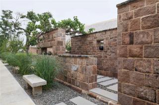 The walls of the preserved buildings maintain the original appearance of the buildings, either in the form of brick walls at the top and stone walls at the bottom, or complete stone walls from top to bottom. The newer parts of the building have additional stone masonry walls in order to maintain the integrity of the courtyard. The landscape elements are partially made of rusted steel plates and dark grey stainless steel panels to set off the handmade feel with an industrial feel. The stone walls are made from locally produced stone island red and are available in two types,