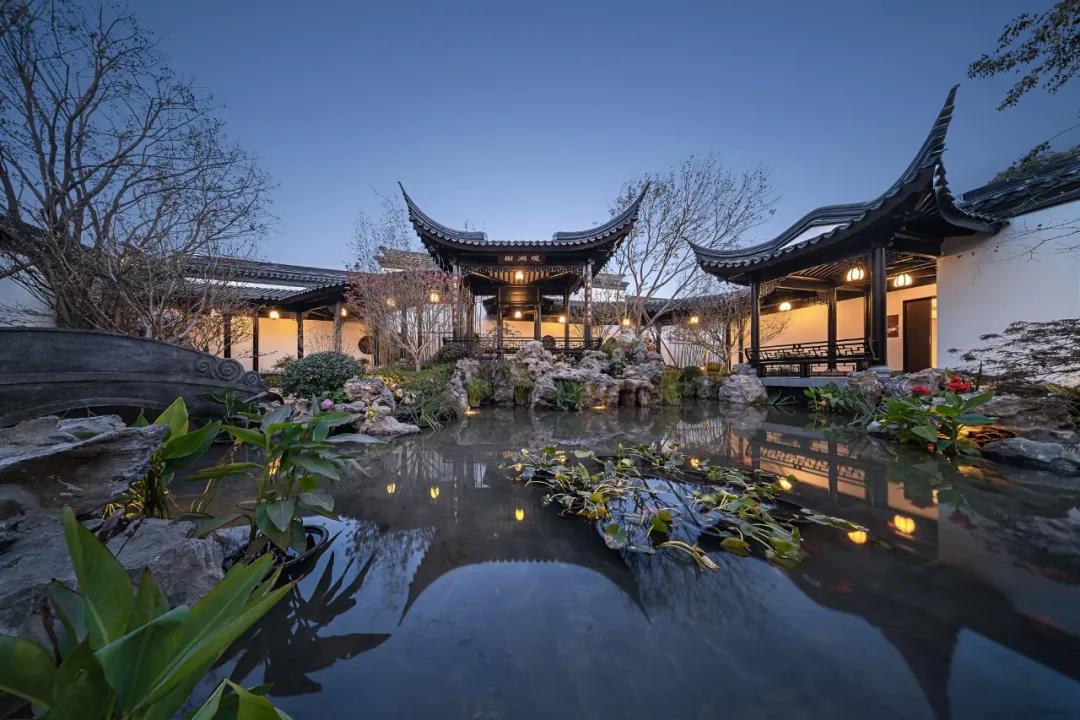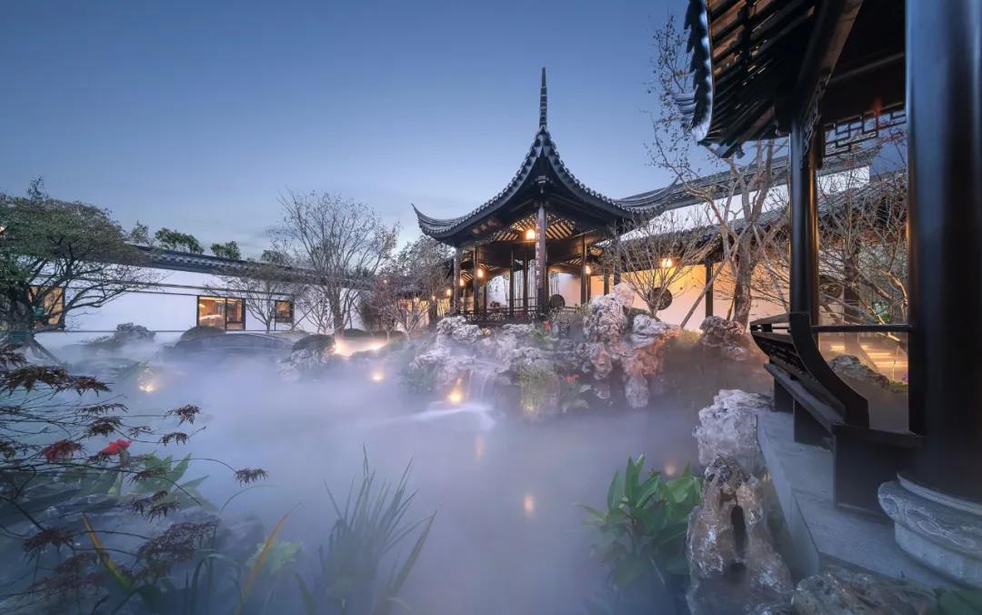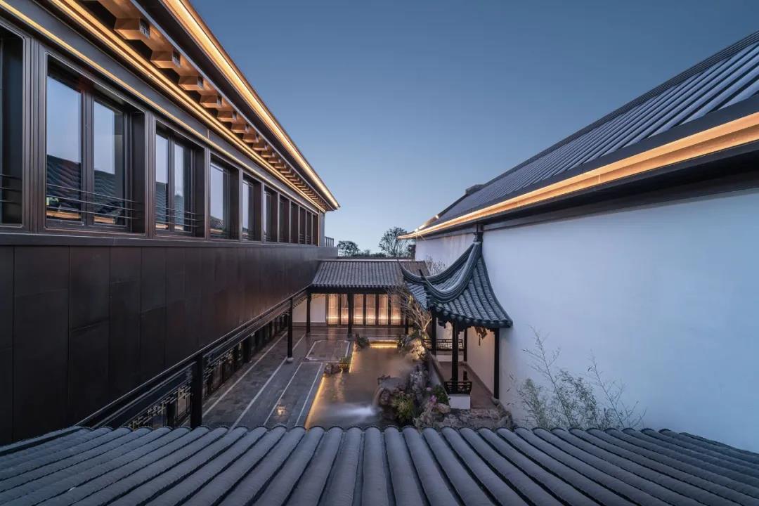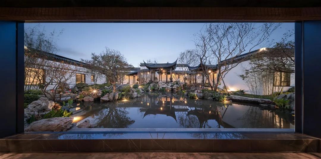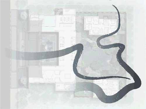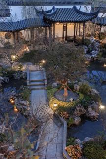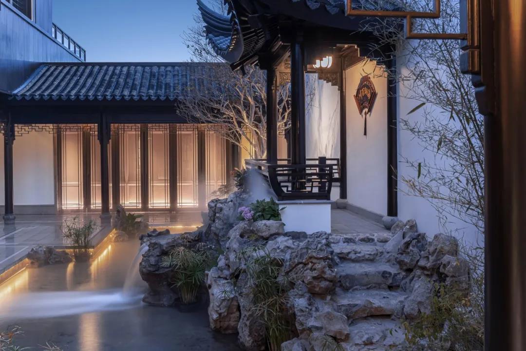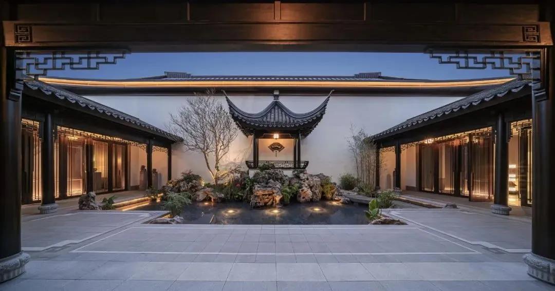 二進(jìn)心遠(yuǎn)堂,此處以“曲”作為主要的元素氣質(zhì),感受影動(dòng)石稀的禪韻、煙雨之境,重現(xiàn)古典營造手法。雨水從四面流入天井,大有四水歸堂,以水為財(cái)之意。