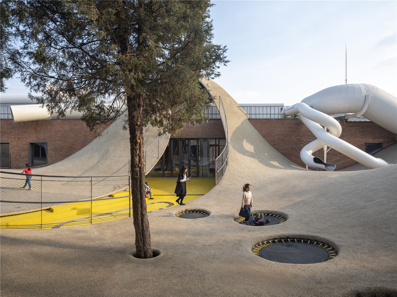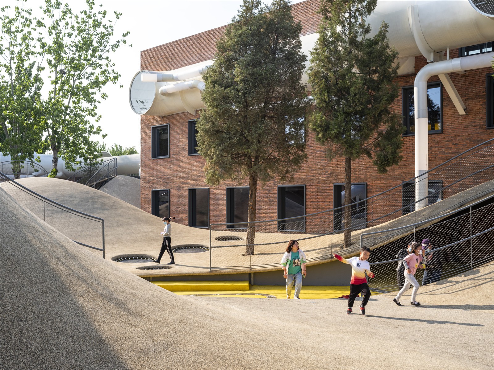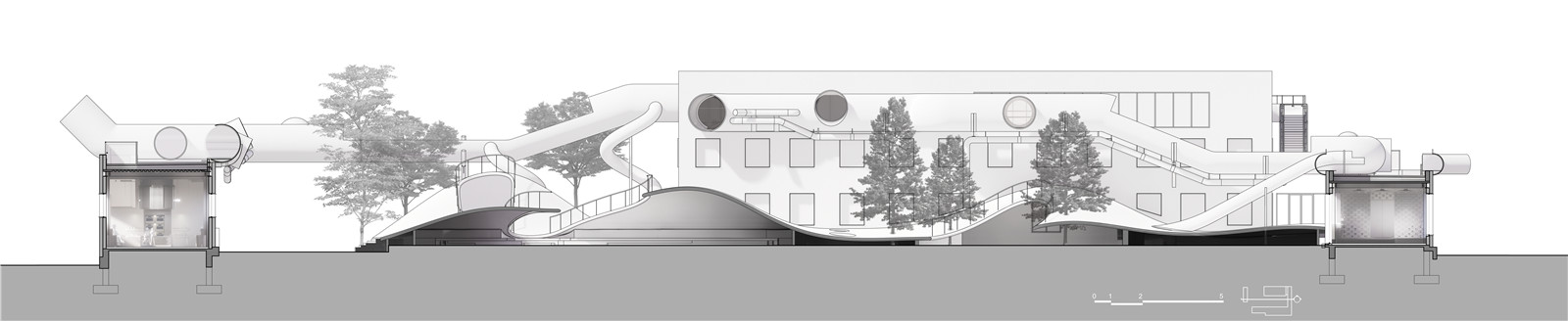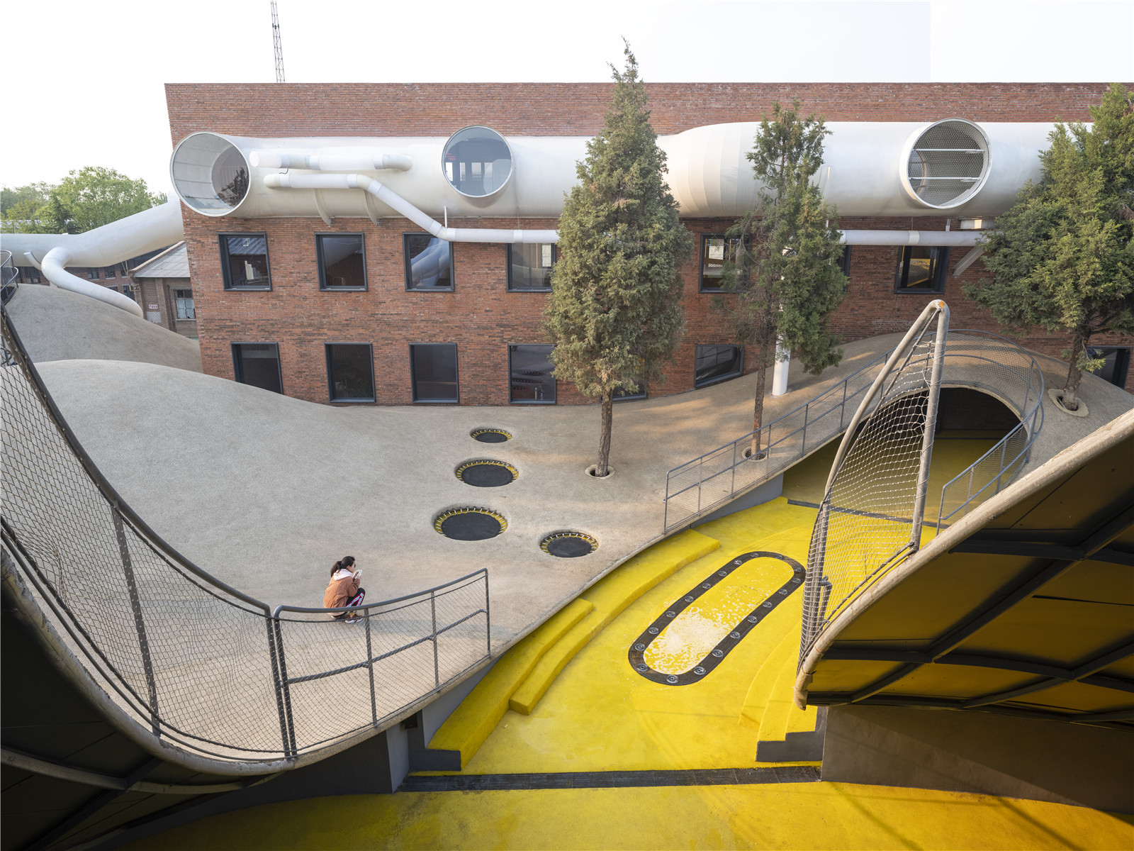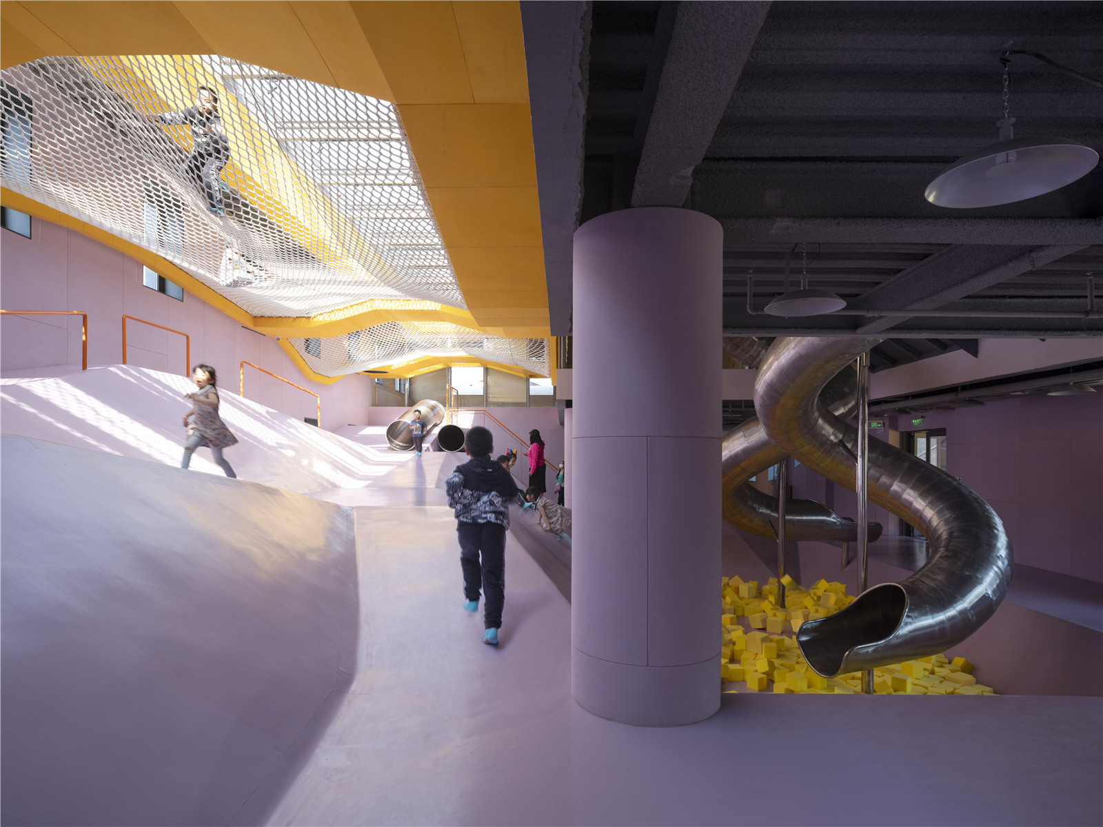 原有建筑群被改造成三個兒童區(qū)域。 一號區(qū)域是單層6米的建筑,主要供低齡幼兒(2-4歲)游玩,適于低齡兒童的身體機(jī)能條件。一號區(qū)域懸掛大尺度彈性運動布簾,裸露的建筑構(gòu)件如柱子等都做過特殊造型設(shè)計,保障兒童使用安全。 連接一號區(qū)域與二號區(qū)域的是附屬設(shè)施,包含咖啡館,餐廳和圖書館。 二號區(qū)域?qū)⒃械娜龑咏ㄖ慕ǔ删植侩p層挑高的游戲區(qū),為4歲以上兒童設(shè)計,以抽象化的山丘地形行成自然的攀爬面和球池。地形的底部是互動放映廳。地形的挑空處模擬地貌地形搭建的水平爬網(wǎng)、俯瞰球池。爬網(wǎng)延長面的二層和三層之間布置了8間教室,學(xué)習(xí)區(qū)到游樂區(qū)的所有連接均為滑梯。三號區(qū)域是單層建筑,主要作為烘培教室,并且緊鄰公園。5棟建筑的屋頂平臺通過管道串聯(lián)成環(huán)形系統(tǒng),屋頂平臺是輔助的休息區(qū)域,同時也于室外游戲區(qū)通過山丘和滑筒交錯連接。