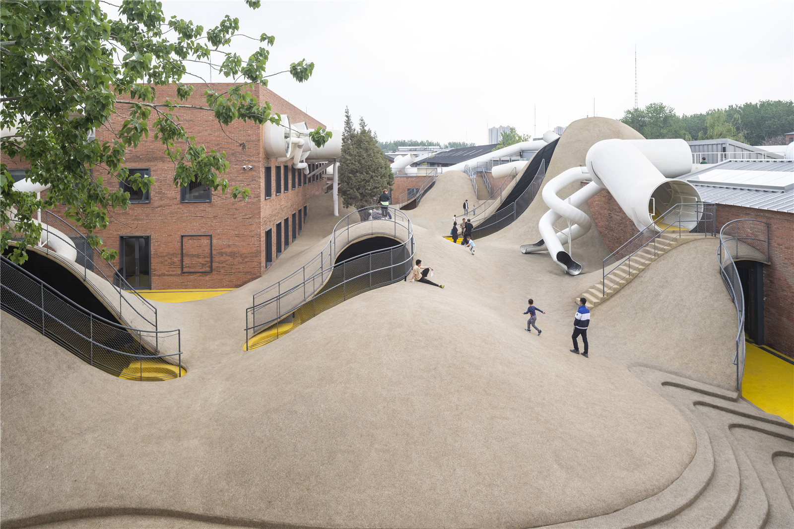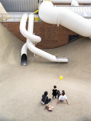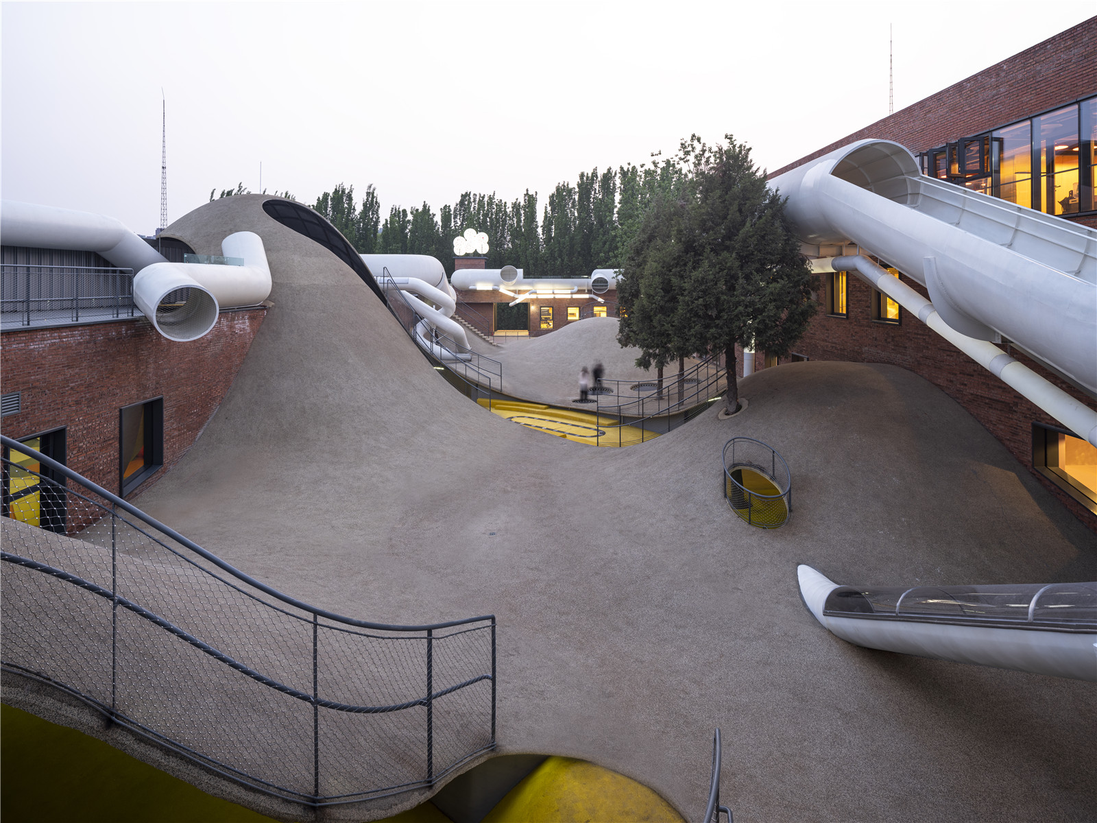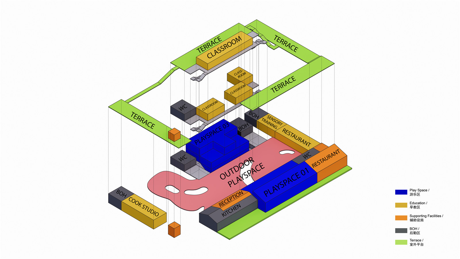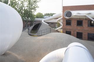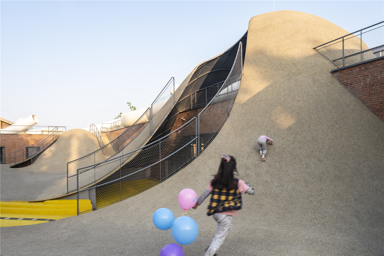 原有建筑群被改造成三個兒童區(qū)域。 一號區(qū)域是單層6米的建筑,主要供低齡幼兒(2-4歲)游玩,適于低齡兒童的身體機(jī)能條件。一號區(qū)域懸掛大尺度彈性運動布簾,裸露的建筑構(gòu)件如柱子等都做過特殊造型設(shè)計,保障兒童使用安全。 連接一號區(qū)域與二號區(qū)域的是附屬設(shè)施,包含咖啡館,餐廳和圖書館。 二號區(qū)域?qū)⒃械娜龑咏ㄖ慕ǔ删植侩p層挑高的游戲區(qū),為4歲以上兒童設(shè)計,以抽象化的山丘地形行成自然的攀爬面和球池。地形的底部是互動放映廳。地形的挑空處模擬地貌地形搭建的水平爬網(wǎng)、俯瞰球池。爬網(wǎng)延長面的二層和三層之間布置了8間教室,學(xué)習(xí)區(qū)到游樂區(qū)的所有連接均為滑梯。三號區(qū)域是單層建筑,主要作為烘培教室,并且緊鄰公園。5棟建筑的屋頂平臺通過管道串聯(lián)成環(huán)形系統(tǒng),屋頂平臺是輔助的休息區(qū)域,同時也于室外游戲區(qū)通過山丘和滑筒交錯連接。