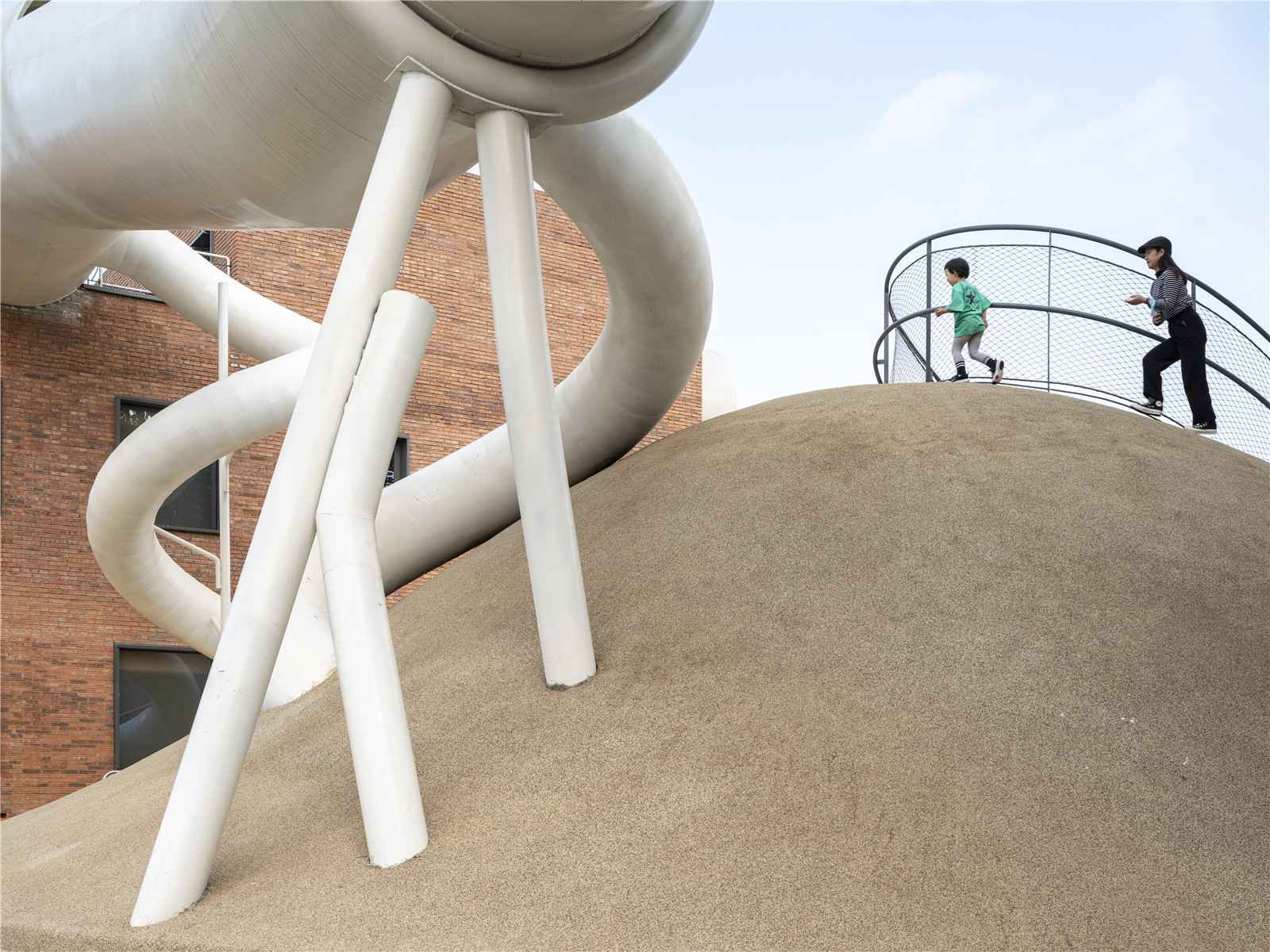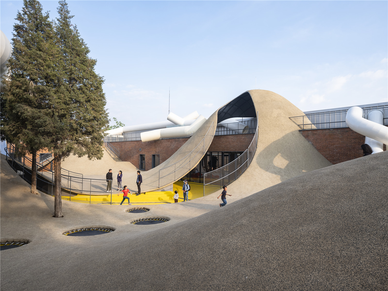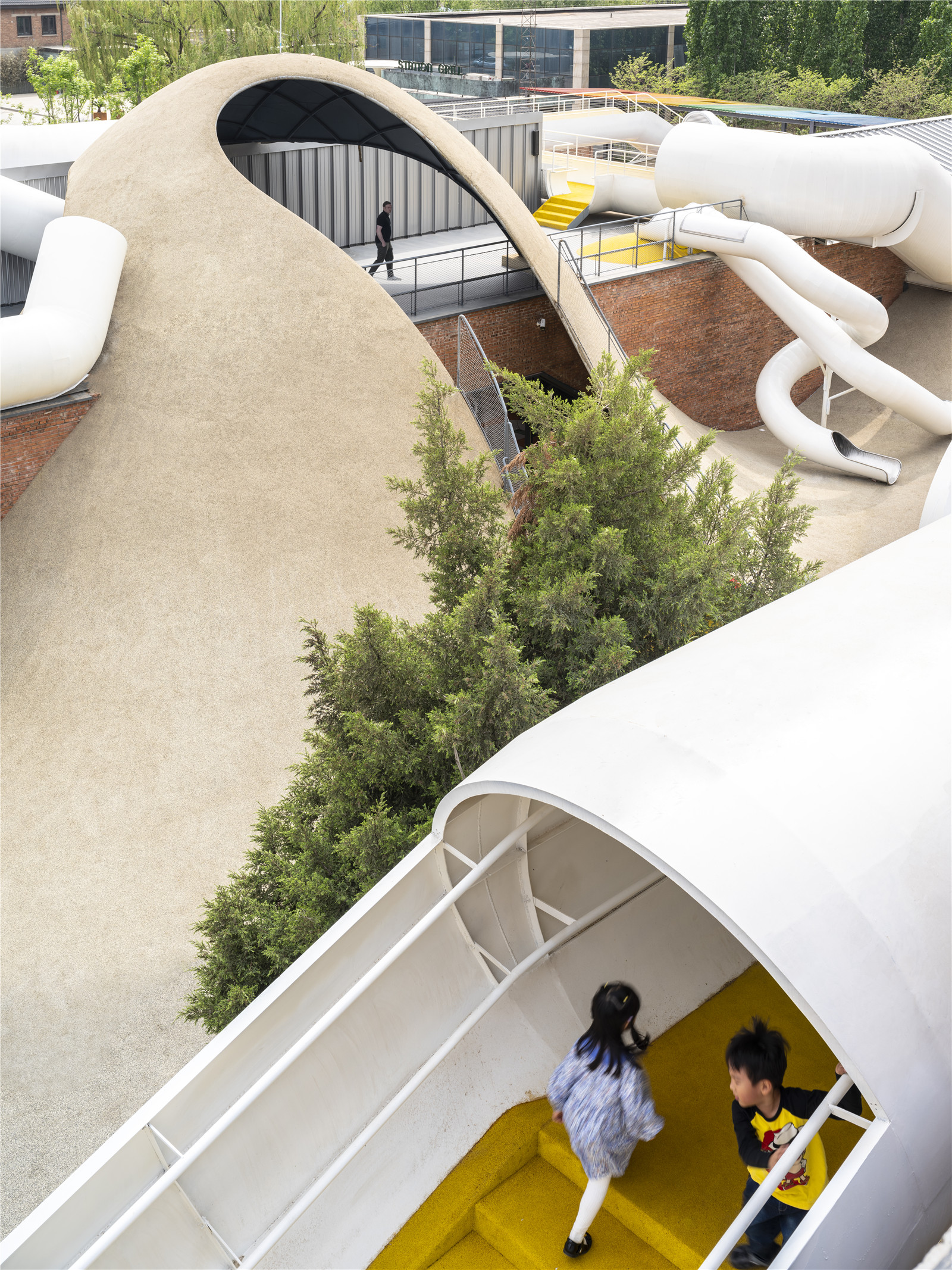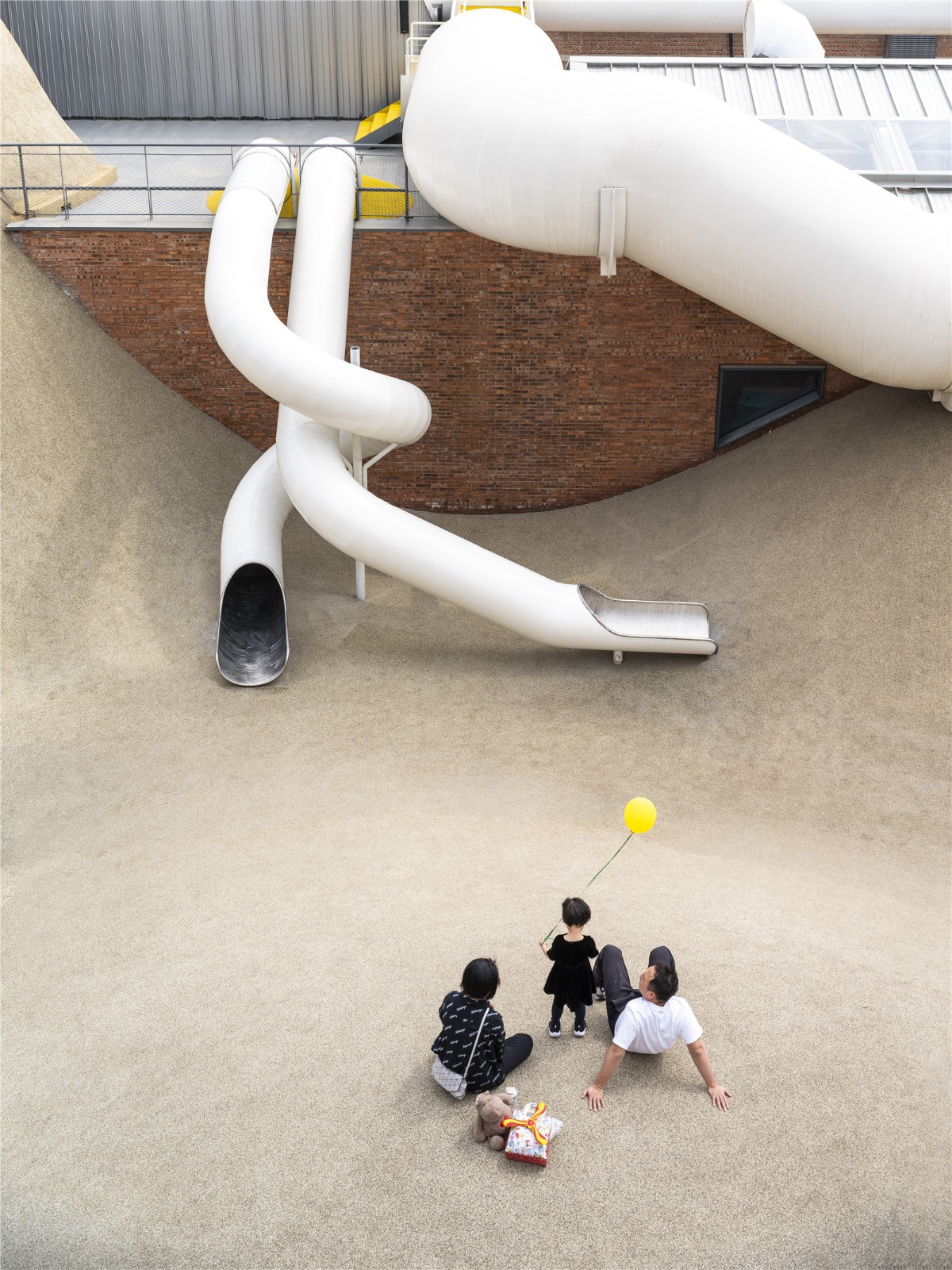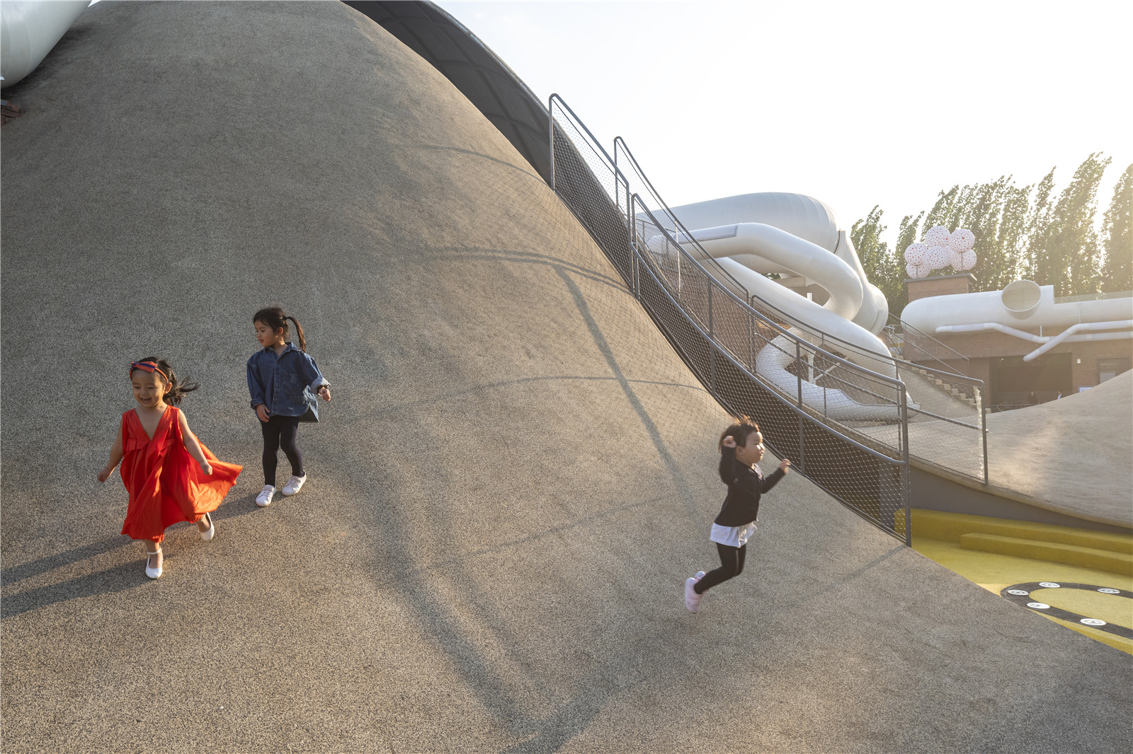原有建筑群被改造成三個兒童區(qū)域。 一號區(qū)域是單層6米的建筑,主要供低齡幼兒(2-4歲)游玩,適于低齡兒童的身體機(jī)能條件。一號區(qū)域懸掛大尺度彈性運動布簾,裸露的建筑構(gòu)件如柱子等都做過特殊造型設(shè)計,保障兒童使用安全。 連接一號區(qū)域與二號區(qū)域的是附屬設(shè)施,包含咖啡館,餐廳和圖書館。 二號區(qū)域?qū)⒃械娜龑咏ㄖ慕ǔ删植侩p層挑高的游戲區(qū),為4歲以上兒童設(shè)計,以抽象化的山丘地形行成自然的攀爬面和球池。地形的底部是互動放映廳。地形的挑空處模擬地貌地形搭建的水平爬網(wǎng)、俯瞰球池。爬網(wǎng)延長面的二層和三層之間布置了8間教室,學(xué)習(xí)區(qū)到游樂區(qū)的所有連接均為滑梯。三號區(qū)域是單層建筑,主要作為烘培教室,并且緊鄰公園。5棟建筑的屋頂平臺通過管道串聯(lián)成環(huán)形系統(tǒng),屋頂平臺是輔助的休息區(qū)域,同時也于室外游戲區(qū)通過山丘和滑筒交錯連接。