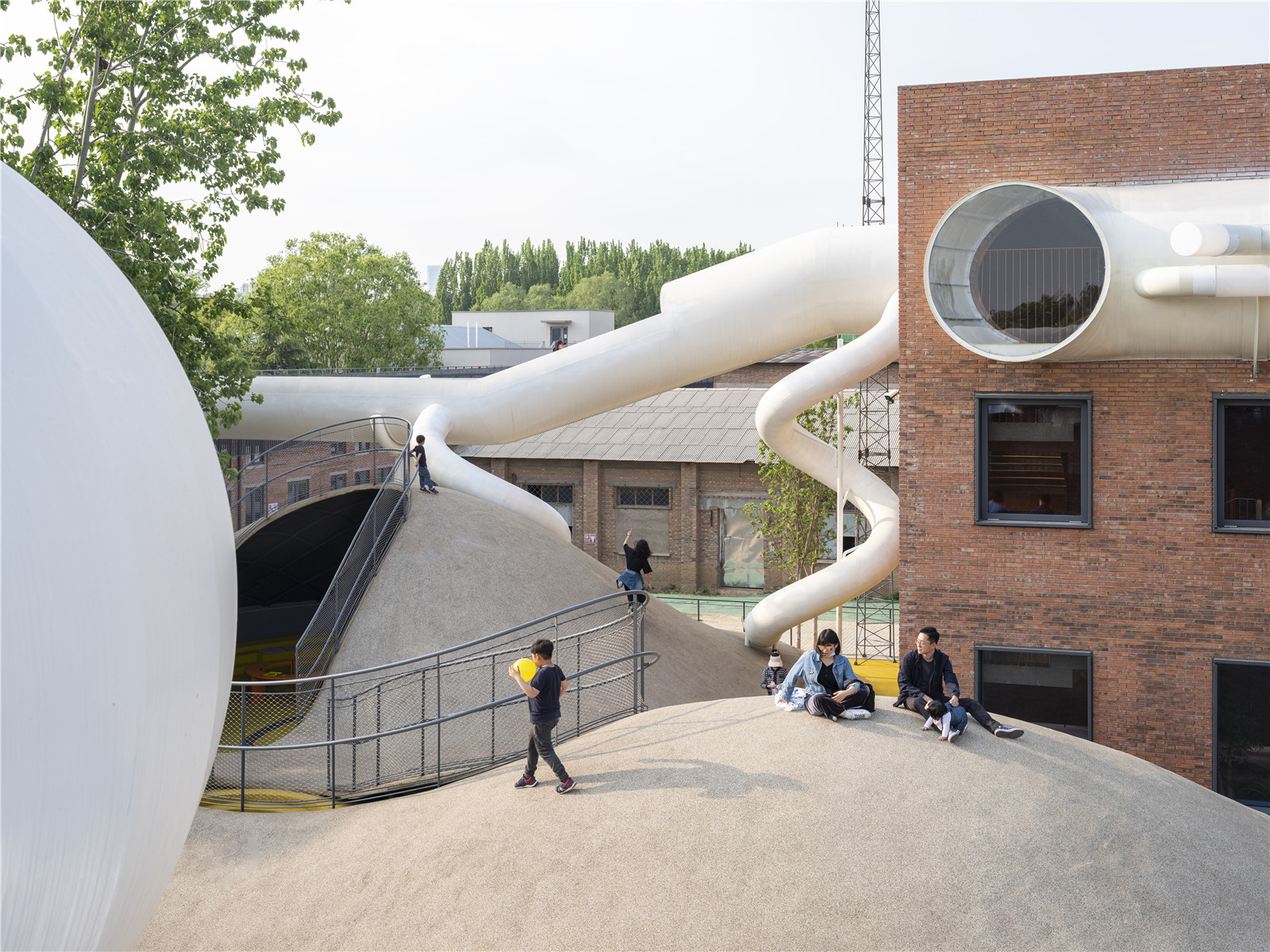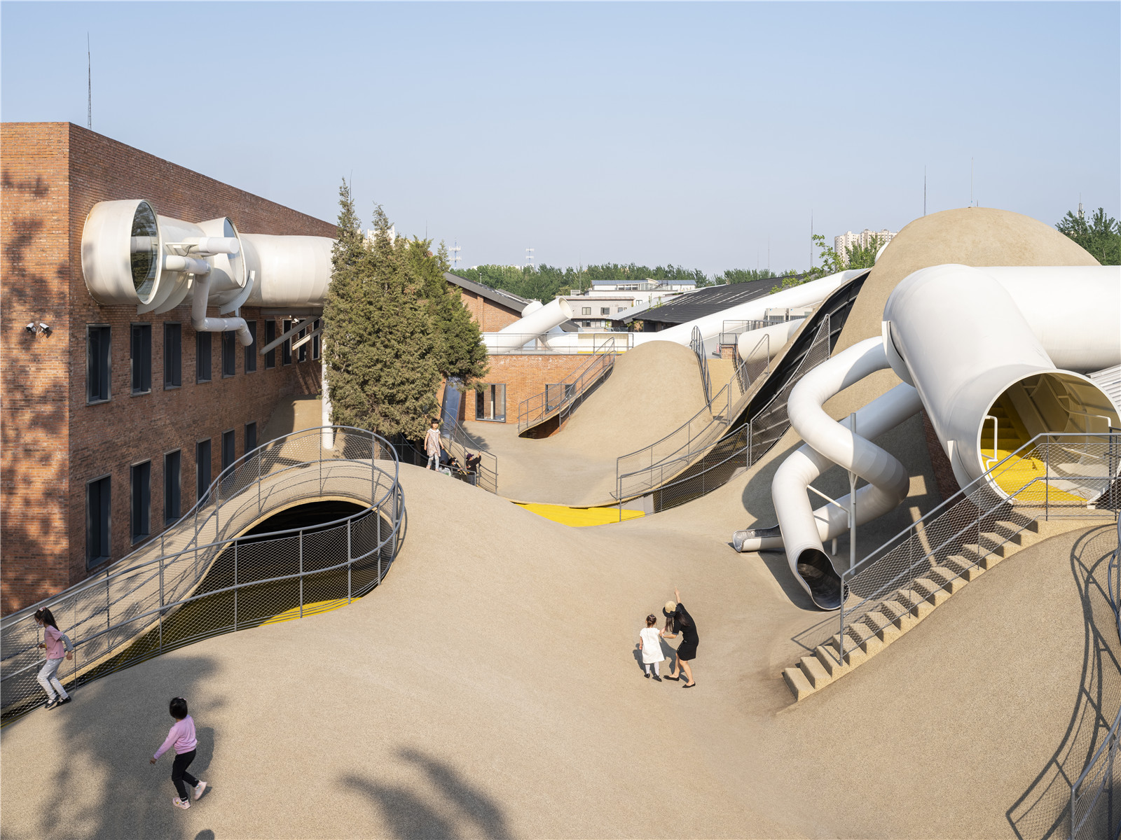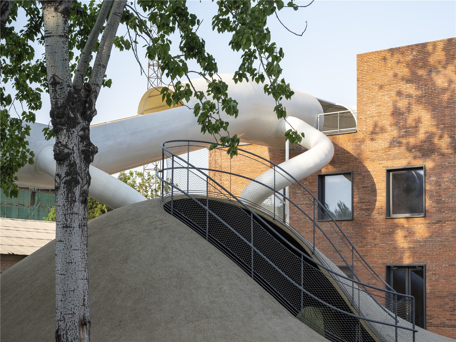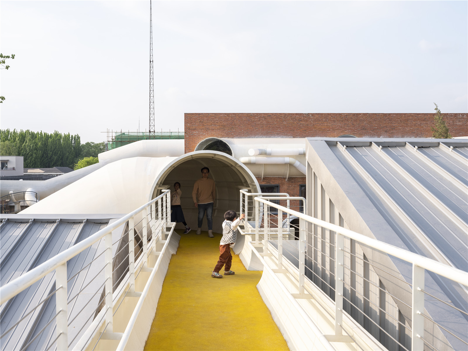原有建筑群被改造成三個兒童區(qū)域。 一號區(qū)域是單層6米的建筑,主要供低齡幼兒(2-4歲)游玩,適于低齡兒童的身體機(jī)能條件。一號區(qū)域懸掛大尺度彈性運動布簾,裸露的建筑構(gòu)件如柱子等都做過特殊造型設(shè)計,保障兒童使用安全。 連接一號區(qū)域與二號區(qū)域的是附屬設(shè)施,包含咖啡館,餐廳和圖書館。 二號區(qū)域?qū)⒃械娜龑咏ㄖ慕ǔ删植侩p層挑高的游戲區(qū),為4歲以上兒童設(shè)計,以抽象化的山丘地形行成自然的攀爬面和球池。地形的底部是互動放映廳。地形的挑空處模擬地貌地形搭建的水平爬網(wǎng)、俯瞰球池。爬網(wǎng)延長面的二層和三層之間布置了8間教室,學(xué)習(xí)區(qū)到游樂區(qū)的所有連接均為滑梯。三號區(qū)域是單層建筑,主要作為烘培教室,并且緊鄰公園。5棟建筑的屋頂平臺通過管道串聯(lián)成環(huán)形系統(tǒng),屋頂平臺是輔助的休息區(qū)域,同時也于室外游戲區(qū)通過山丘和滑筒交錯連接。
