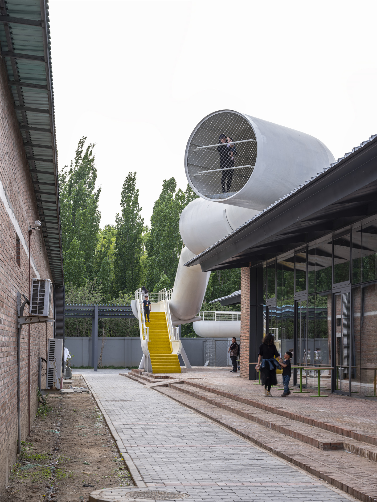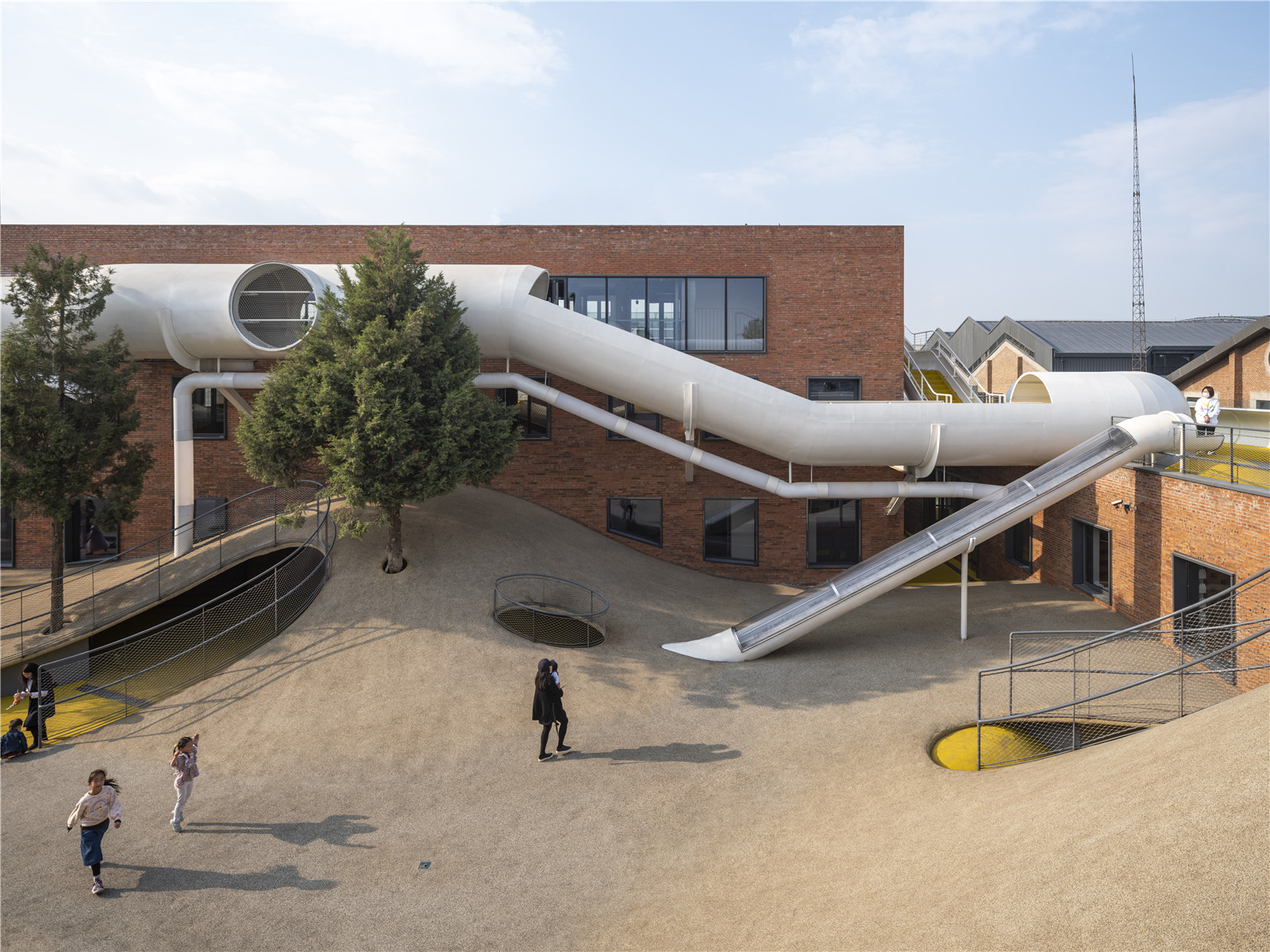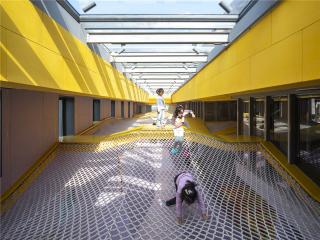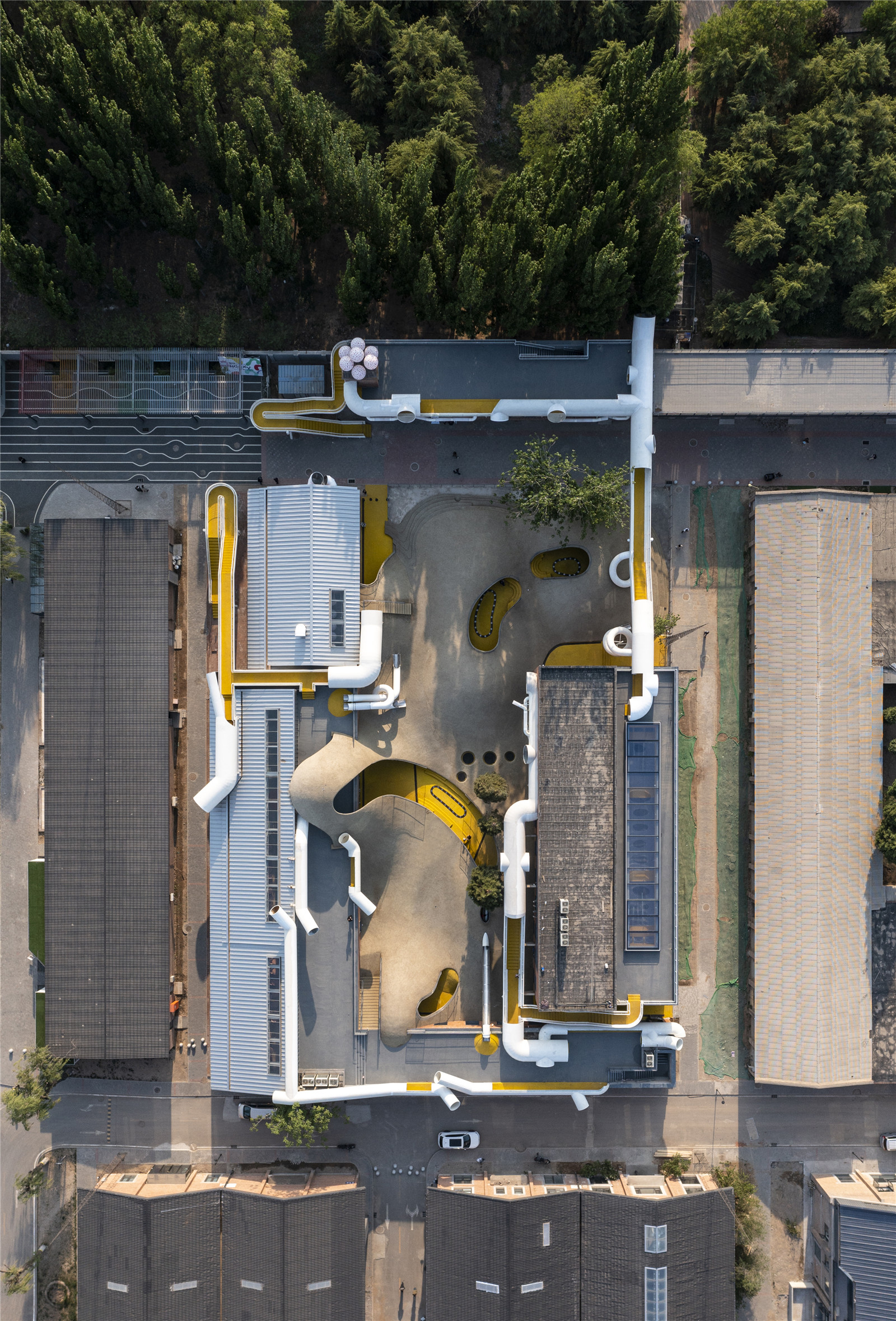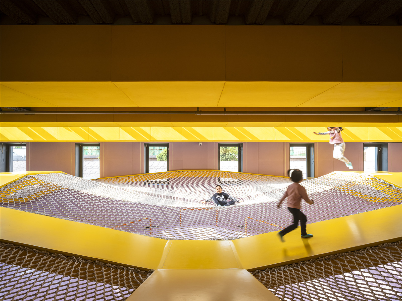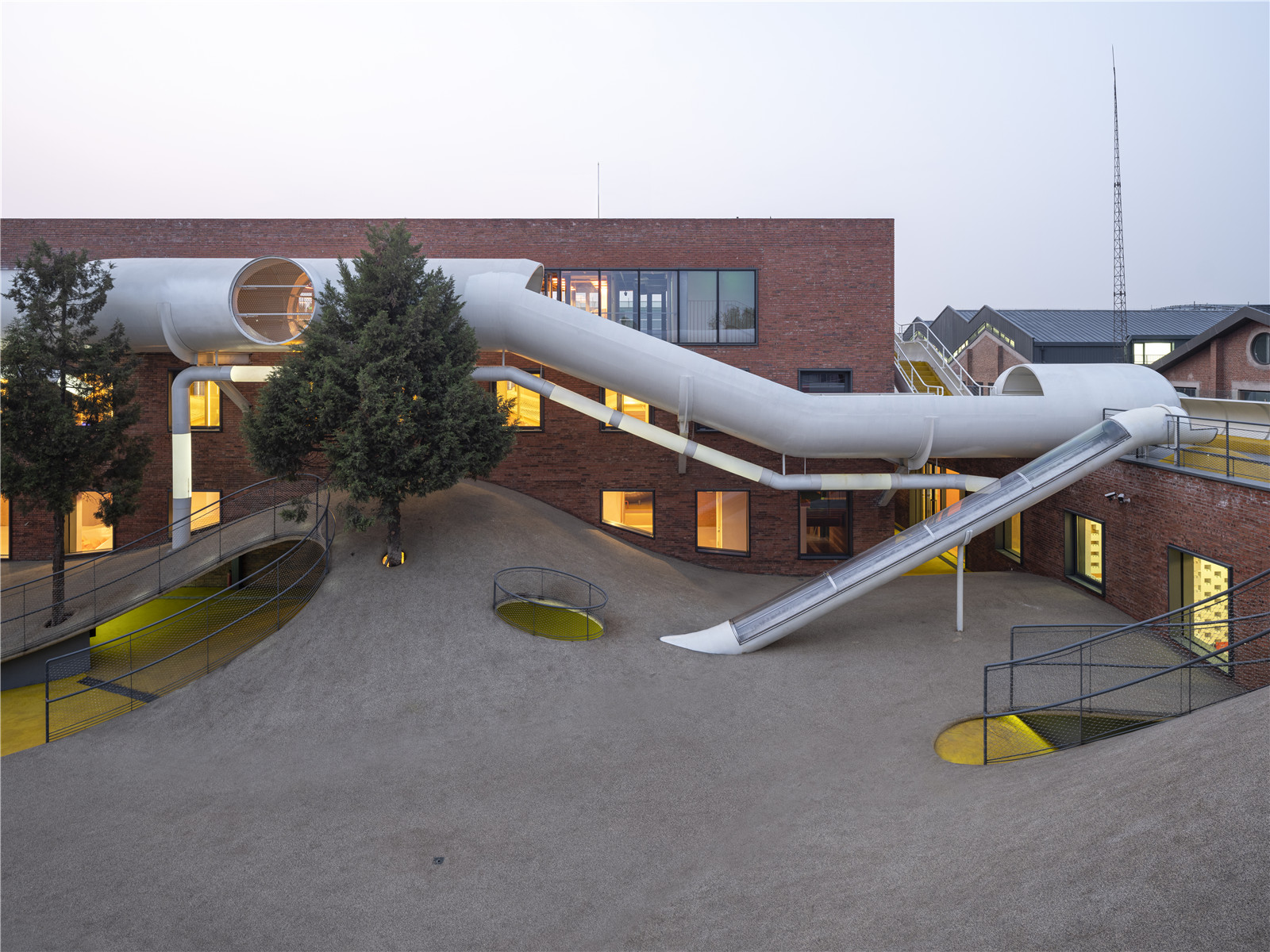 原有建筑群被改造成三個兒童區(qū)域。 一號區(qū)域是單層6米的建筑,主要供低齡幼兒(2-4歲)游玩,適于低齡兒童的身體機(jī)能條件。一號區(qū)域懸掛大尺度彈性運動布簾,裸露的建筑構(gòu)件如柱子等都做過特殊造型設(shè)計,保障兒童使用安全。 連接一號區(qū)域與二號區(qū)域的是附屬設(shè)施,包含咖啡館,餐廳和圖書館。 二號區(qū)域?qū)⒃械娜龑咏ㄖ慕ǔ删植侩p層挑高的游戲區(qū),為4歲以上兒童設(shè)計,以抽象化的山丘地形行成自然的攀爬面和球池。地形的底部是互動放映廳。地形的挑空處模擬地貌地形搭建的水平爬網(wǎng)、俯瞰球池。爬網(wǎng)延長面的二層和三層之間布置了8間教室,學(xué)習(xí)區(qū)到游樂區(qū)的所有連接均為滑梯。三號區(qū)域是單層建筑,主要作為烘培教室,并且緊鄰公園。5棟建筑的屋頂平臺通過管道串聯(lián)成環(huán)形系統(tǒng),屋頂平臺是輔助的休息區(qū)域,同時也于室外游戲區(qū)通過山丘和滑筒交錯連接。