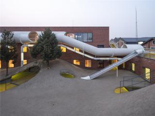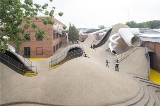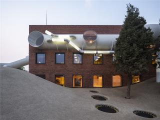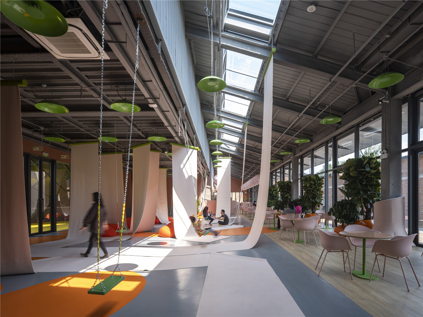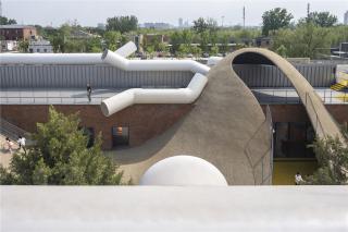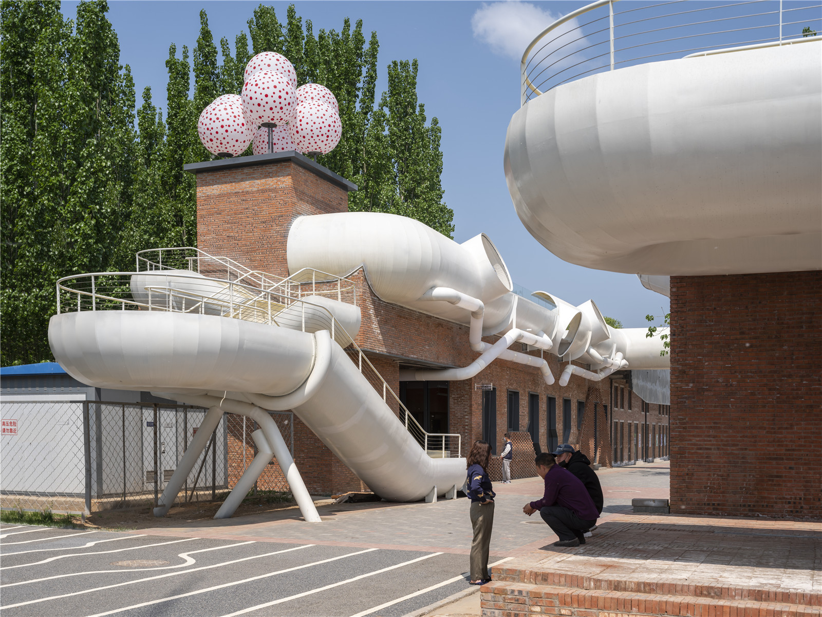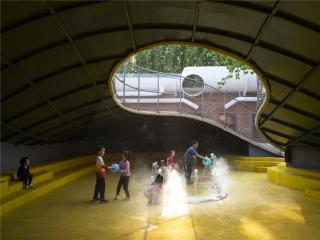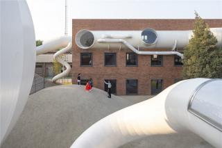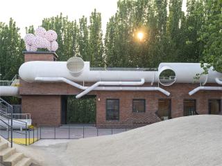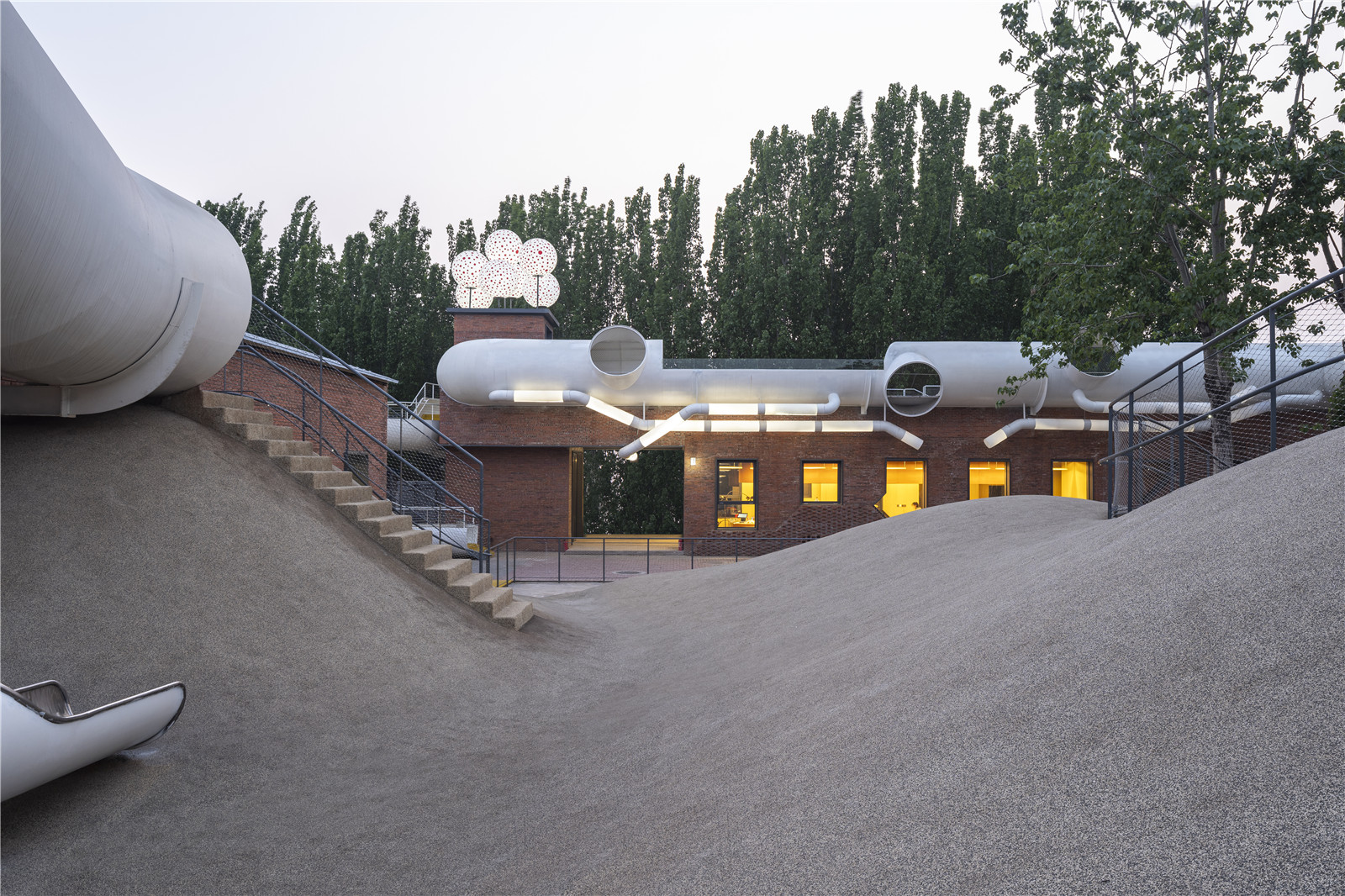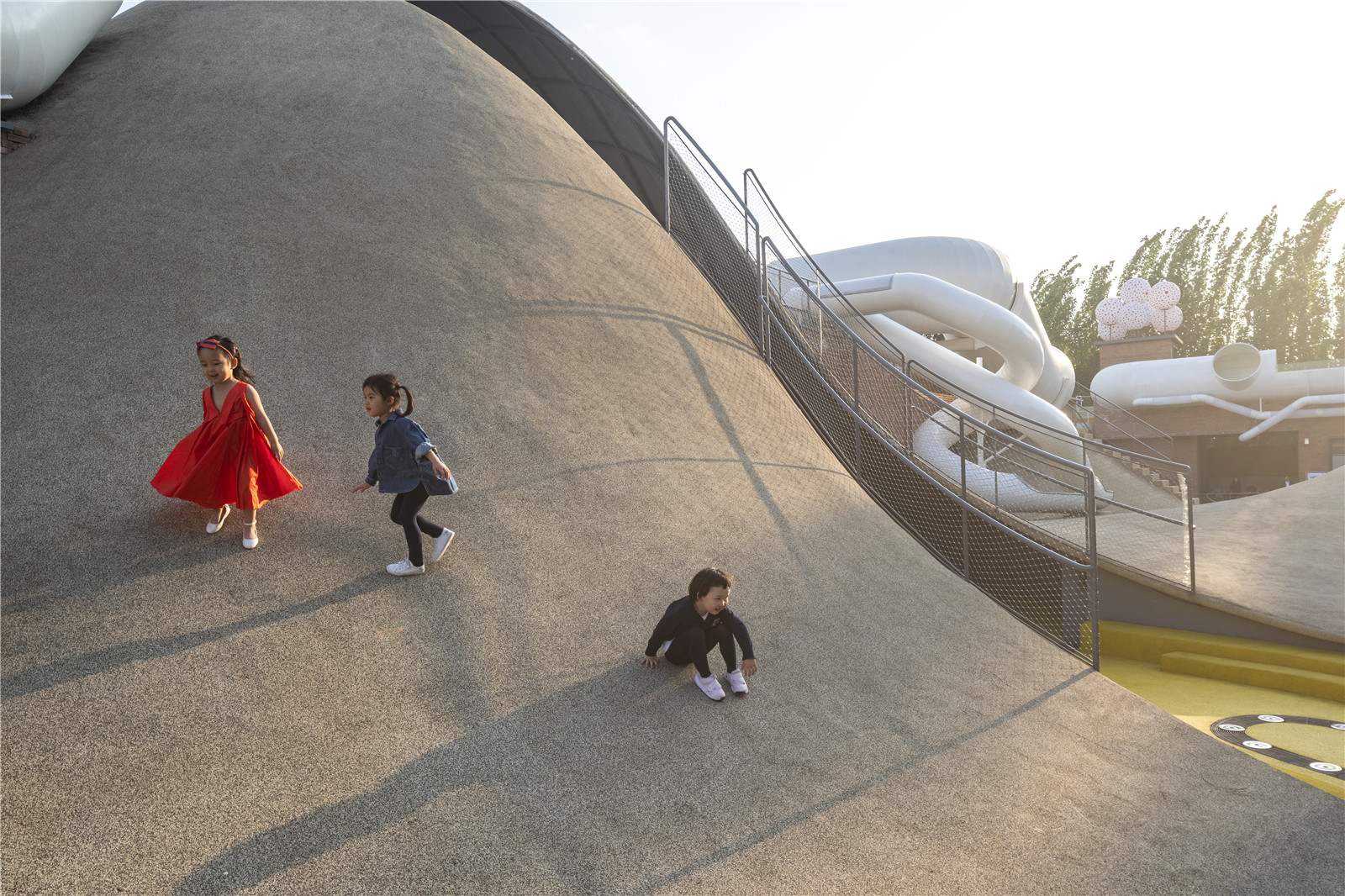 原有建筑群被改造成三個兒童區(qū)域。 一號區(qū)域是單層6米的建筑,主要供低齡幼兒(2-4歲)游玩,適于低齡兒童的身體機(jī)能條件。一號區(qū)域懸掛大尺度彈性運動布簾,裸露的建筑構(gòu)件如柱子等都做過特殊造型設(shè)計,保障兒童使用安全。 連接一號區(qū)域與二號區(qū)域的是附屬設(shè)施,包含咖啡館,餐廳和圖書館。 二號區(qū)域?qū)⒃械娜龑咏ㄖ慕ǔ删植侩p層挑高的游戲區(qū),為4歲以上兒童設(shè)計,以抽象化的山丘地形行成自然的攀爬面和球池。地形的底部是互動放映廳。地形的挑空處模擬地貌地形搭建的水平爬網(wǎng)、俯瞰球池。爬網(wǎng)延長面的二層和三層之間布置了8間教室,學(xué)習(xí)區(qū)到游樂區(qū)的所有連接均為滑梯。三號區(qū)域是單層建筑,主要作為烘培教室,并且緊鄰公園。5棟建筑的屋頂平臺通過管道串聯(lián)成環(huán)形系統(tǒng),屋頂平臺是輔助的休息區(qū)域,同時也于室外游戲區(qū)通過山丘和滑筒交錯連接。