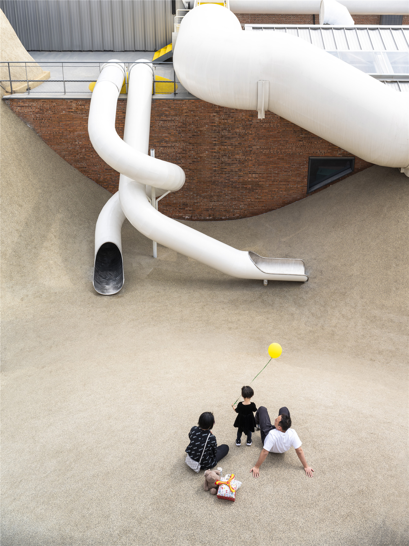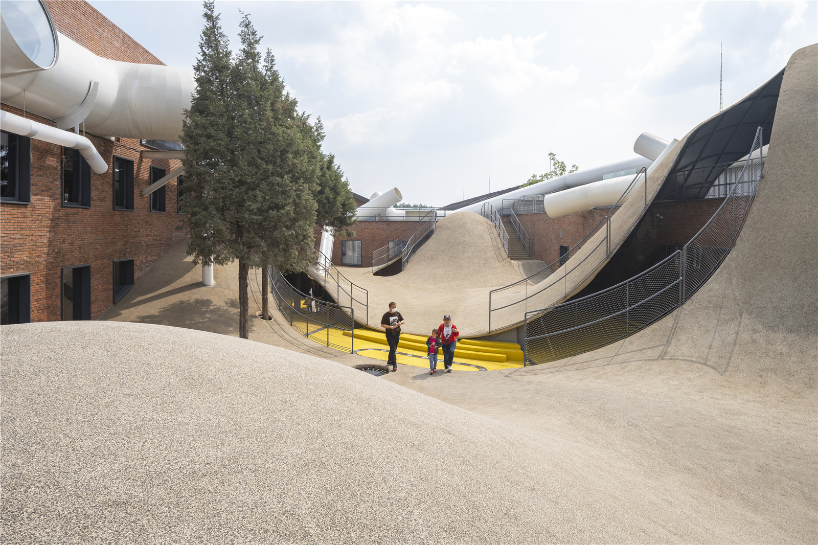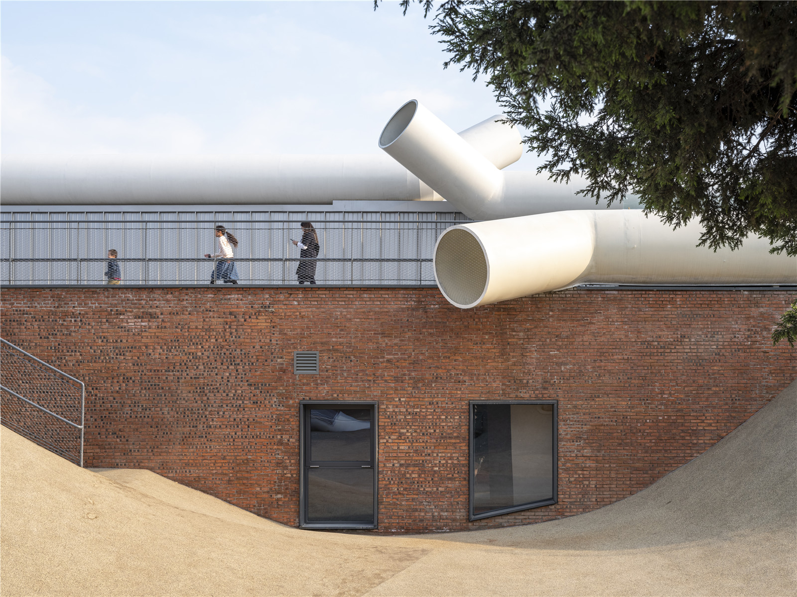 整個場地由五棟建筑組成半圍合式的街區(qū),所有的屋面平臺通過管道串聯(lián)一體,環(huán)形的動線使得屋面獨立于建筑的室內(nèi)功能而存在。屋面提供了一個俯視全貌的高點。孩子們可以通過滑筒從屋頂一直探索到山丘地形的下方,高差變化從7米到4.3米。屋面使得整個冒險之旅擁有多種探索路徑,并鼓勵孩子不走最尋常的路徑,比如與最短的路徑相比,第二短的路徑可能會更加有趣。