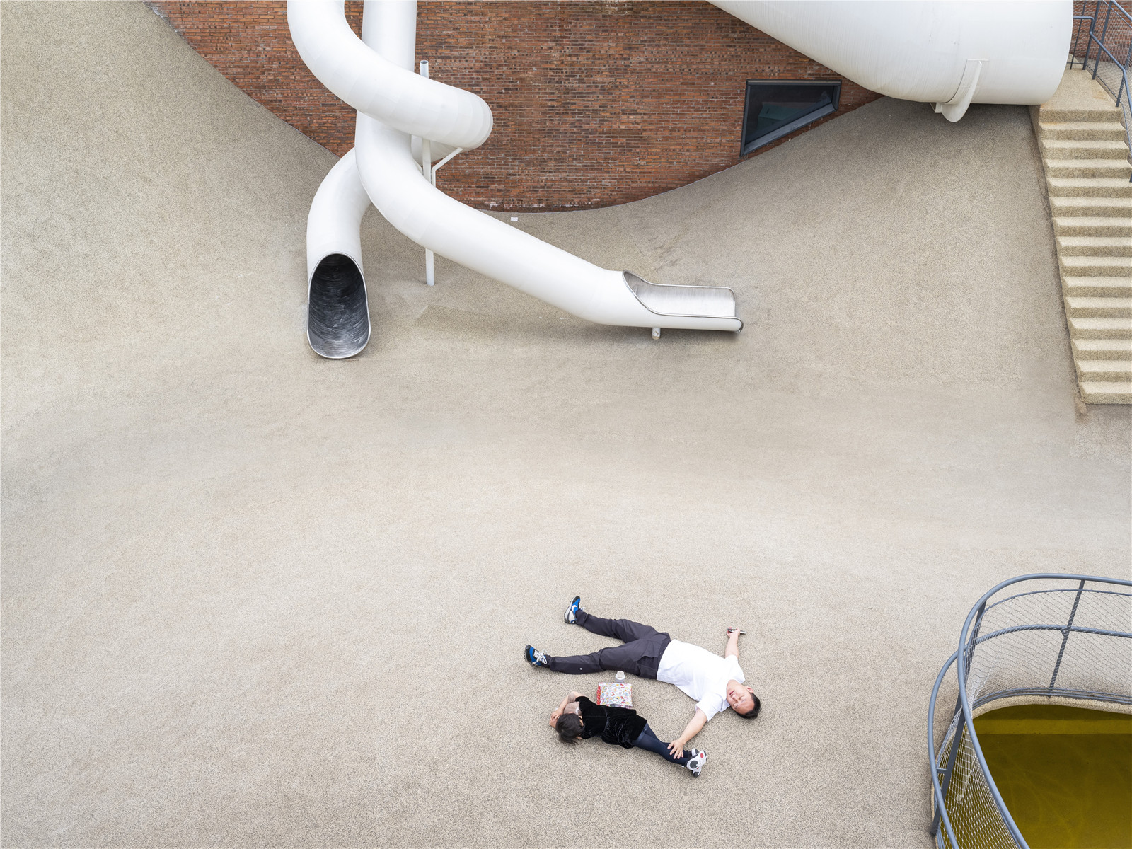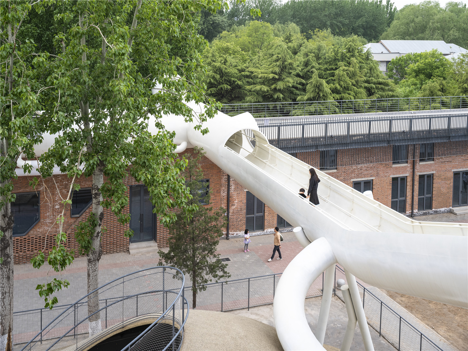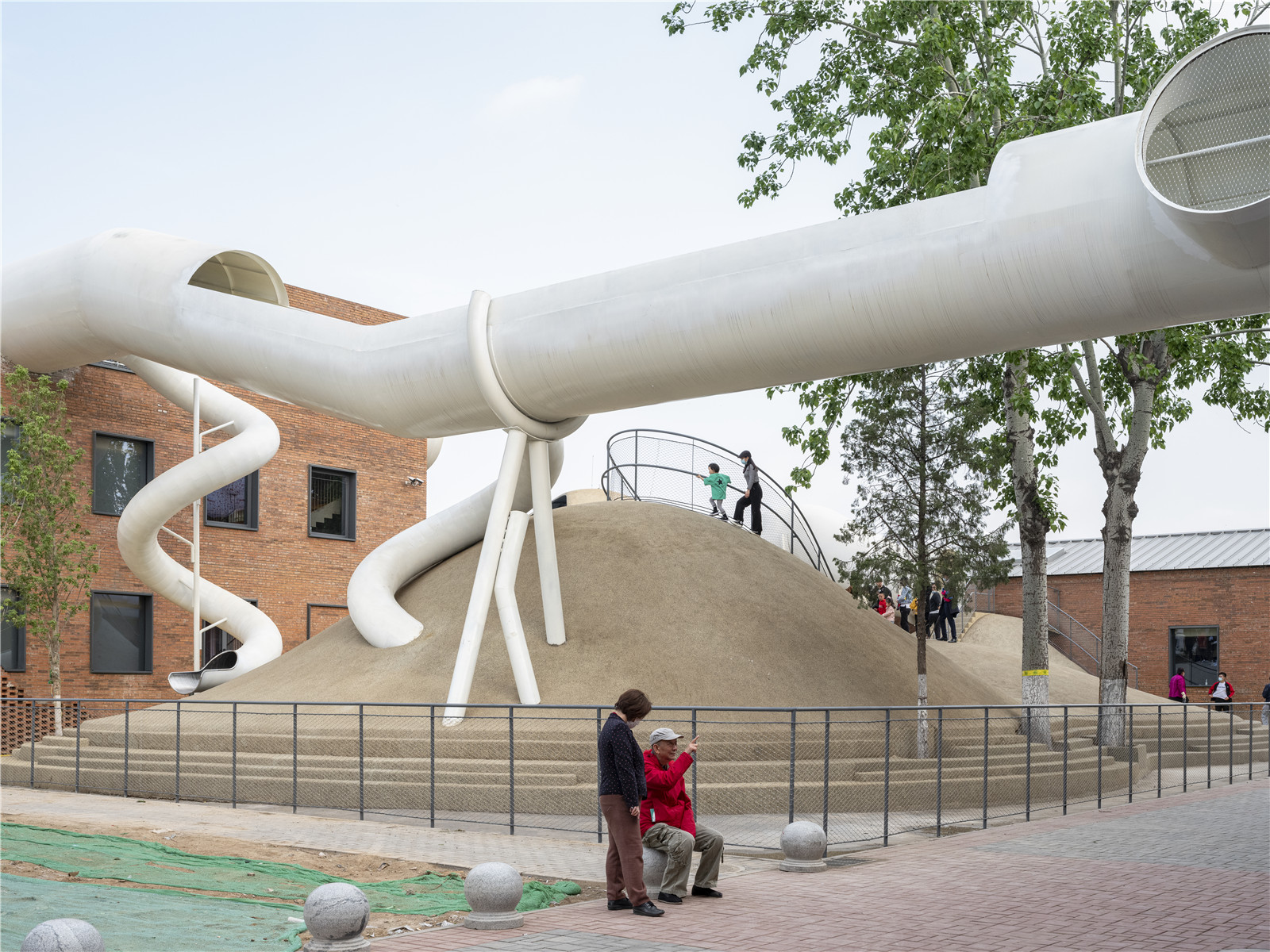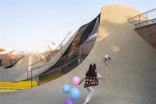整個場地由五棟建筑組成半圍合式的街區(qū),所有的屋面平臺通過管道串聯(lián)一體,環(huán)形的動線使得屋面獨立于建筑的室內(nèi)功能而存在。屋面提供了一個俯視全貌的高點。孩子們可以通過滑筒從屋頂一直探索到山丘地形的下方,高差變化從7米到4.3米。屋面使得整個冒險之旅擁有多種探索路徑,并鼓勵孩子不走最尋常的路徑,比如與最短的路徑相比,第二短的路徑可能會更加有趣。