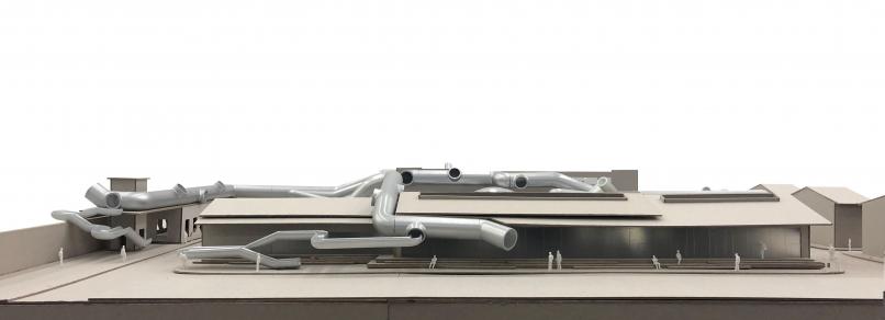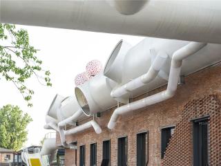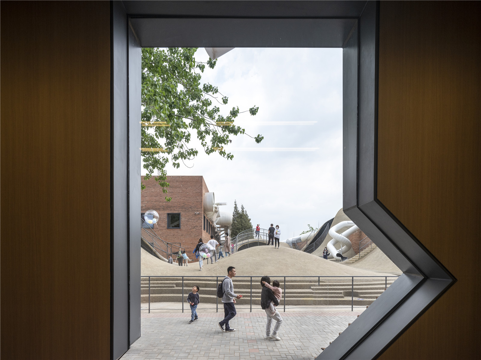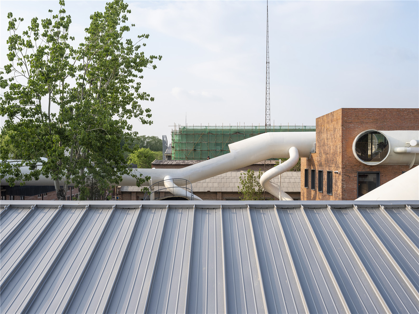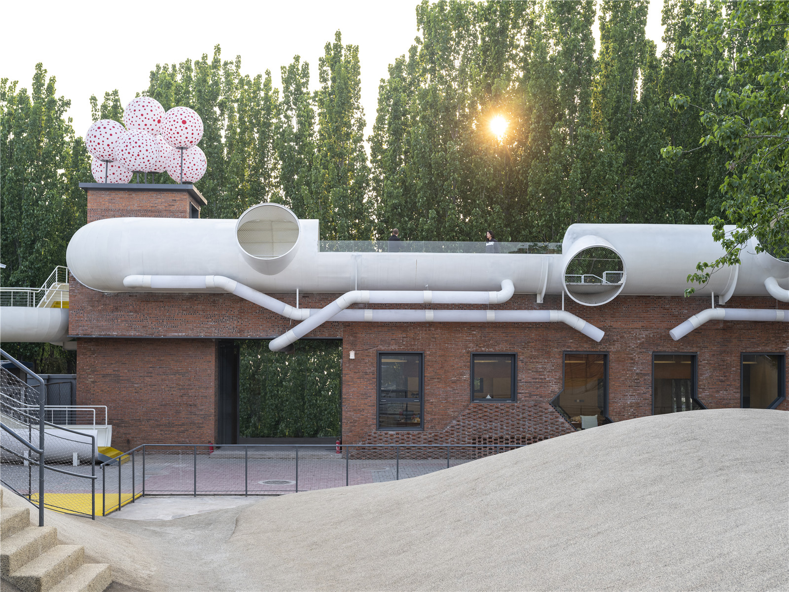 新建筑建立原有的五棟倉庫的原址上形成一個圍合的場地,由園區(qū)的小街分成兩個組團(tuán),其中一個組團(tuán)背靠公園并且設(shè)置了出入口。建筑主體采用全鋼結(jié)構(gòu),外掛管道系統(tǒng)作為主體結(jié)構(gòu)的重要組成部分,承載了除游戲功能外的屋面疏散以及動線交通的主要功能。建筑的外立面保留了原有建筑的窗洞口的位置和數(shù)量,模擬兒童的身體動作,尤其是針對兒童的視線高度,抽象的體現(xiàn)在洞口造型上。