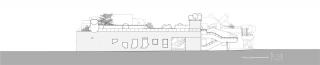 The existing cluster provides for 3 internal play spaces. Play space 1 is a single level low pitched 6m volume,used for 2-4 year olds as a crawlspace with hanging fabrics. Features also include a soft space topography for babies supplemented with a restaurant and library. Play space 2 is divided vertically into three levels. A tiered environment for ages over 4 includes a subterranean interactive environment, a steep climbing topography, with a suspended tensile net all connected with slides. Additional directed learning can be found on level 2 and 3 with a total of 6 multifunctional classrooms. A single slide connects vertically 7m from the classroom to level 1. The South Building competes the courtyard adjacent to the road with views into a public park. All buildings have a looped roof terrace easing parents observation of children, while being able to access parent specific amenities including a terraced bar.