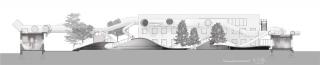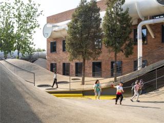 借助地形學(xué)設(shè)計的山丘系統(tǒng)獨立于建筑的主體結(jié)構(gòu),令整個場地被高低起伏的山地形態(tài)覆蓋,可以讓孩子們無拘無束,感受到速度與山地起伏的變化,幫助孩子認(rèn)知他們的感官和統(tǒng)合系統(tǒng)。山丘連接每棟建筑的主要出入口,是每個公共入口的多功能前廳。 同時,山丘的底部還布置了兩個半室外的環(huán)形劇場。
