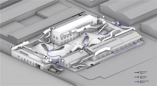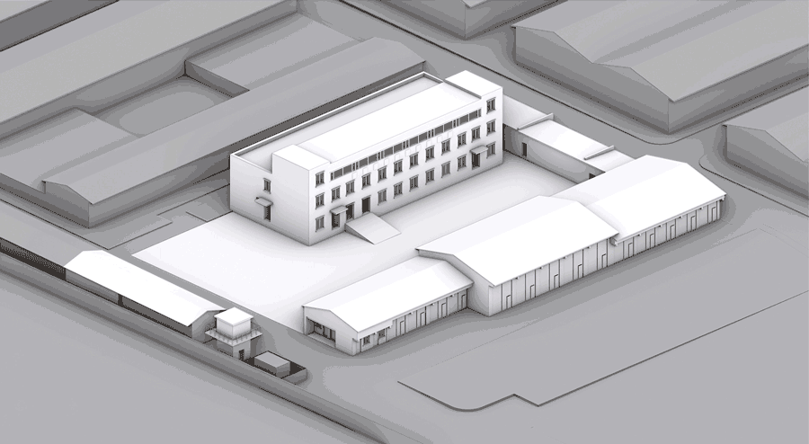 The building complex is formed by a cluster of existing warehouses encircling a courtyard. A public street disconnects the south building which is re-connected by the use of an aerial bridge to link the roof terraces. Access also provides a private route to an adjoining kindergarten, and an option to enter the adjacent public park.