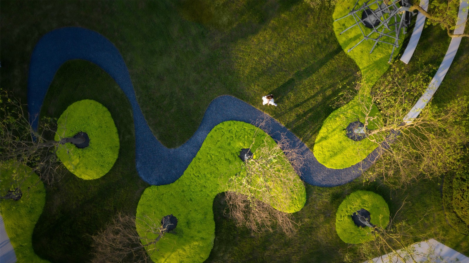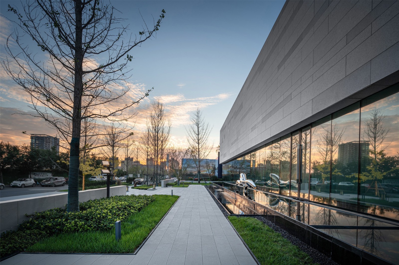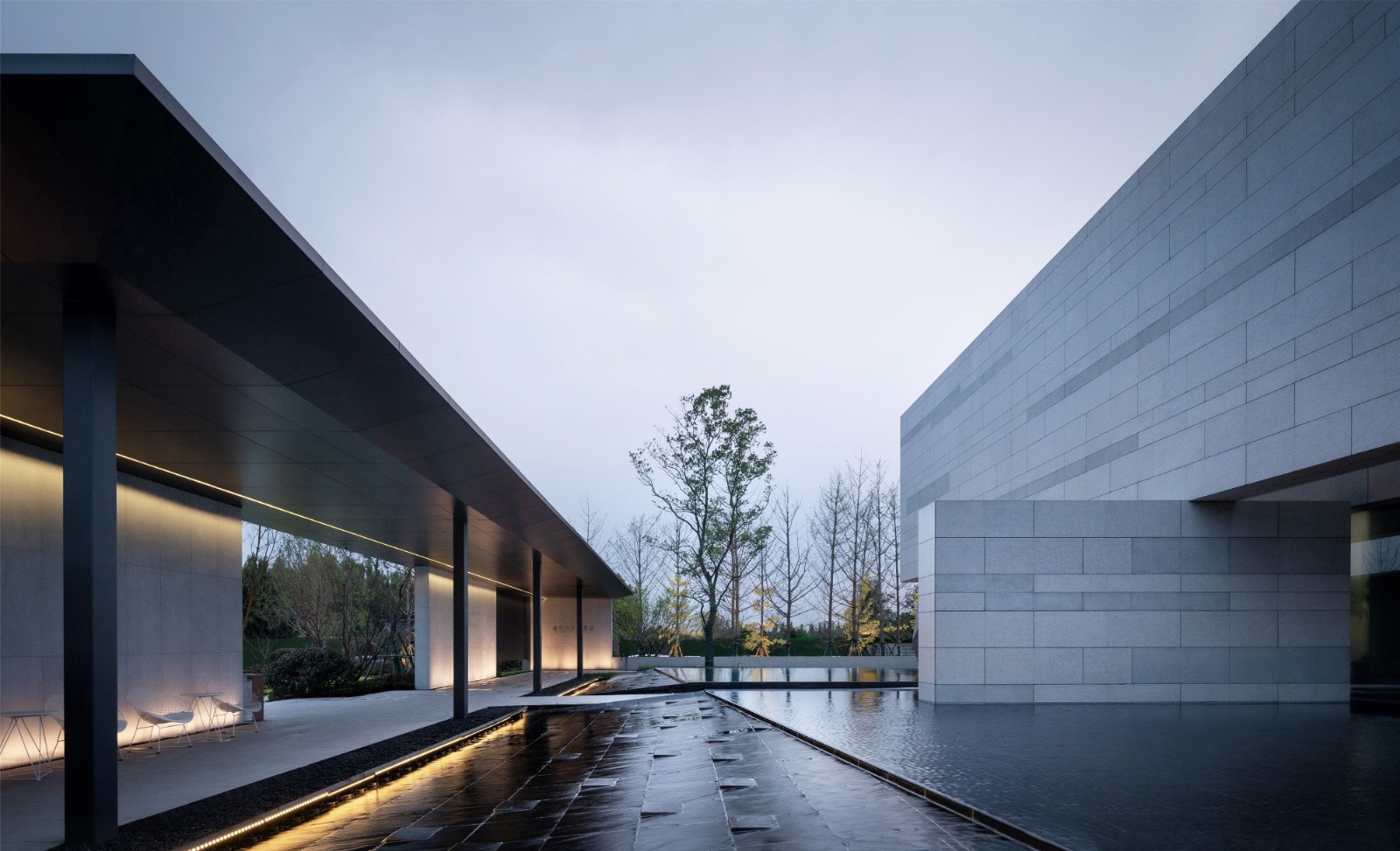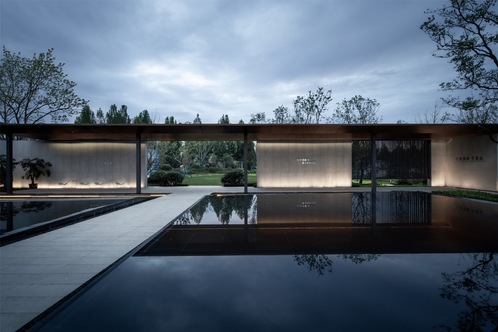 The open still water reflected the distinct lines,The reflection came out of the sunset and the swaying tree shadows,Go through the promenade and convert the space.Let people walk and feel the fun of exploring.Create an immersive experience of a minimalist space.