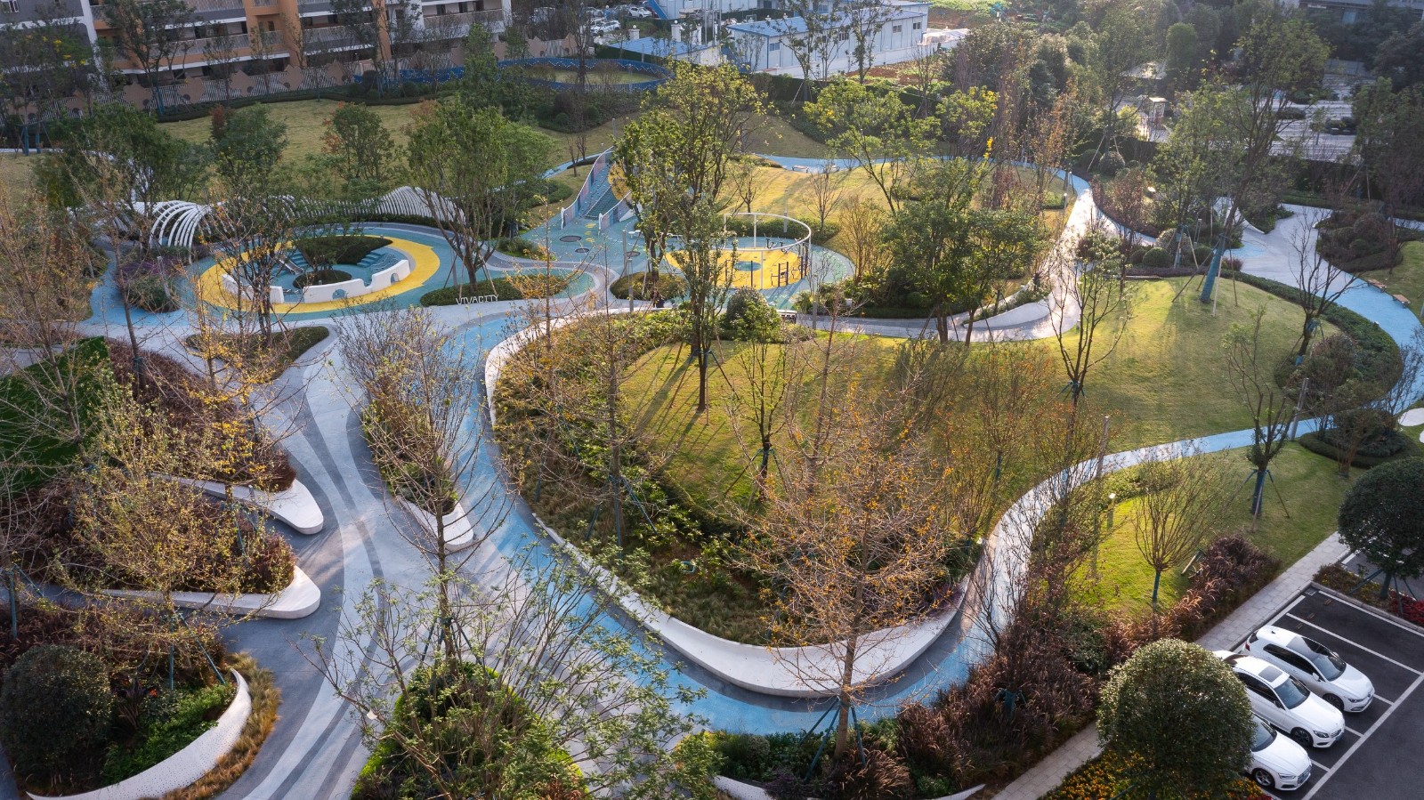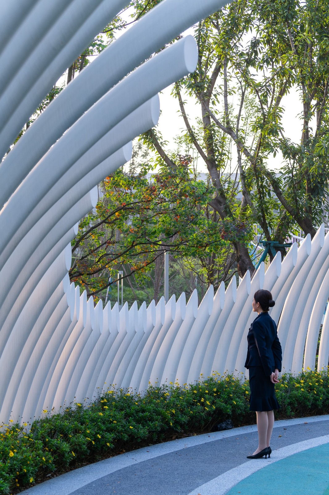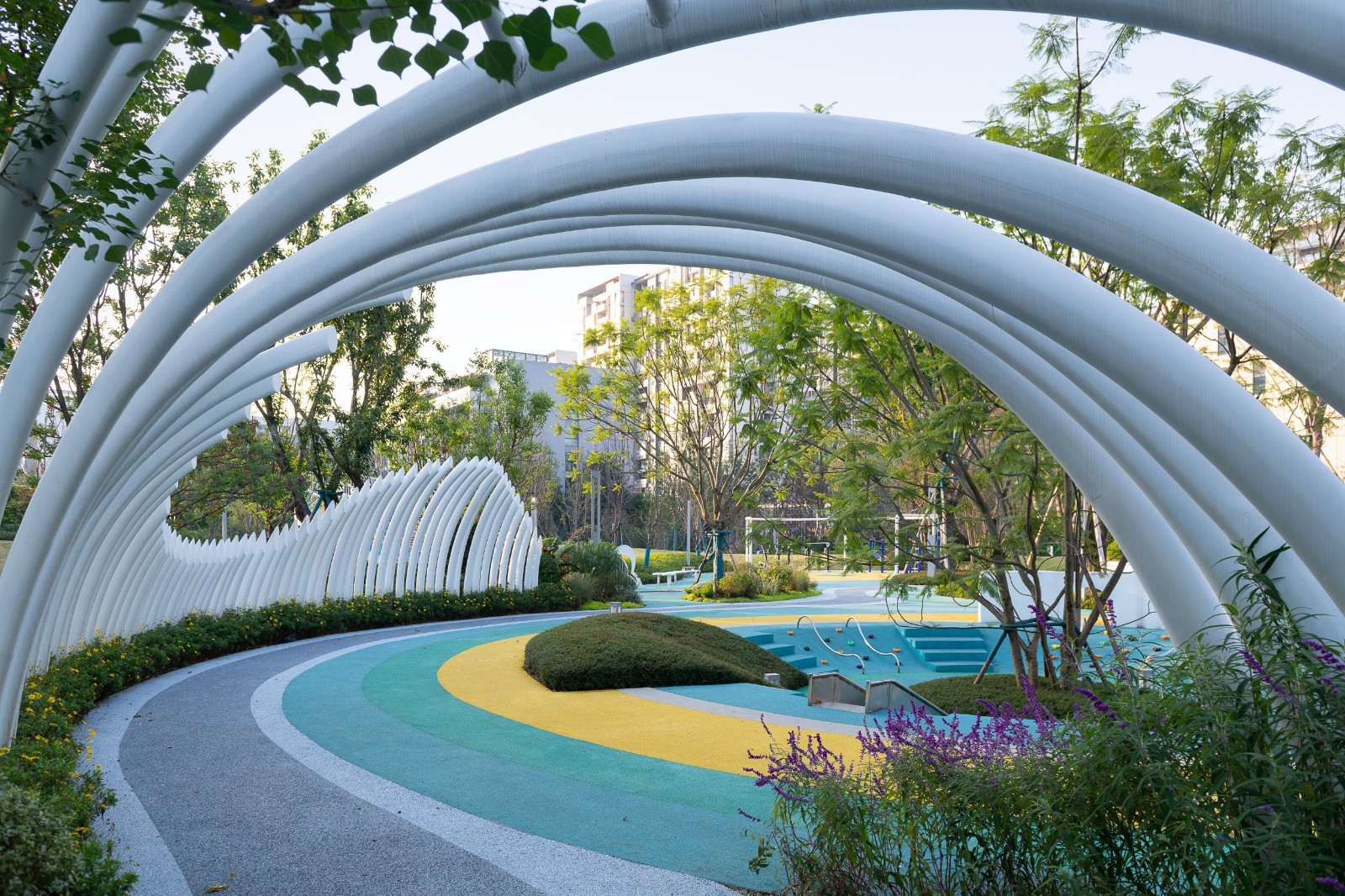 Street Park is an urban ecological green space of about 9,600 m 2. The design introduces the theme concept of colorful butterfly spirit, thus making the whole park a fashionable and dynamic gathering place for entertainment and leisure. Stop the noise, walk in it and feel the natural embrace.For the dimension of residential residents in this project, all residents realize the real mansion configuration, first entering the park will bring a unique scene experience; 75% of the park green volume and functions also complement the public area garden, making the surrounding residents feel more real, and get a real park home.