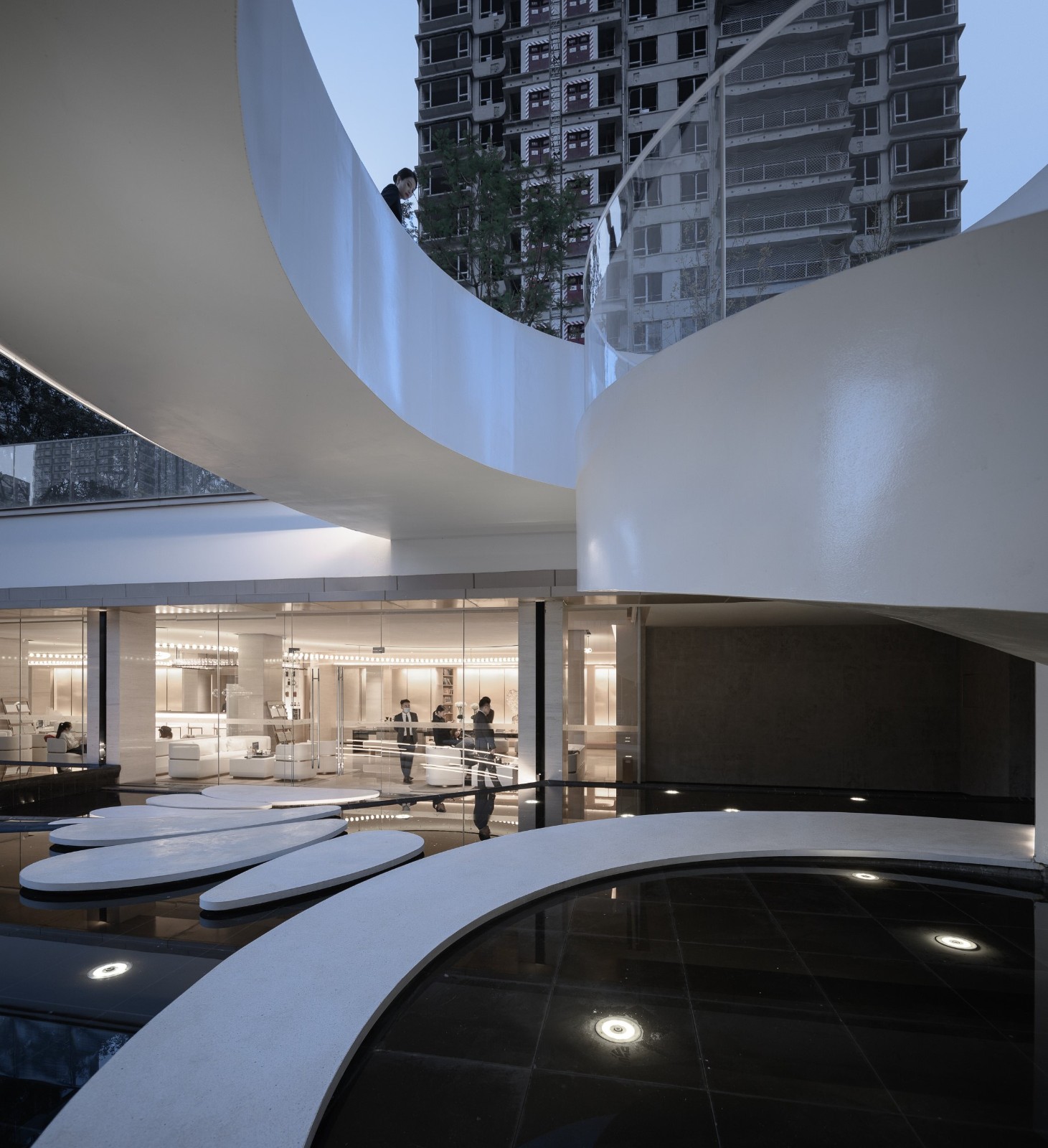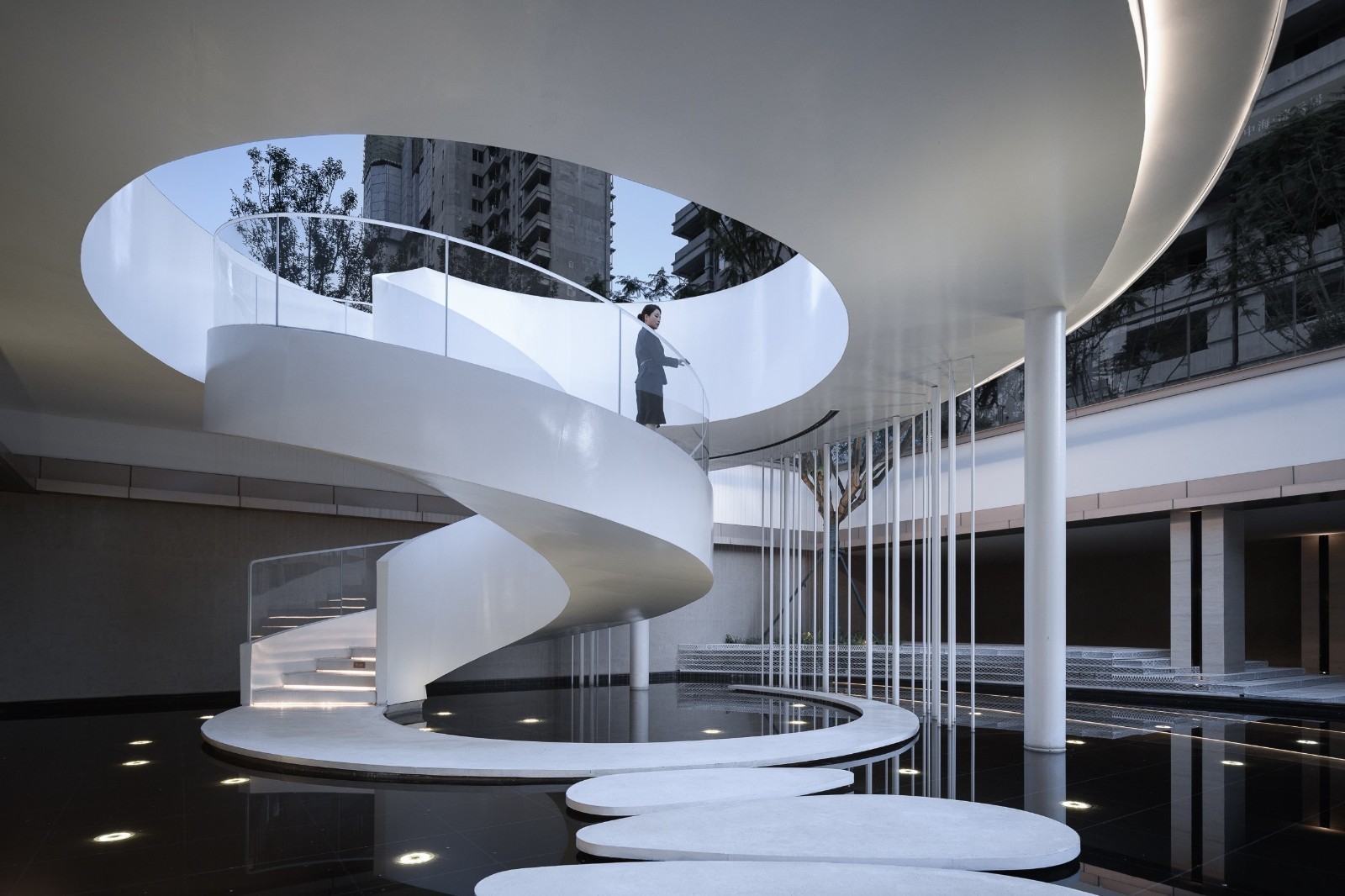 The sinking square follows the inspiration path of Corbusier, and builds the "seventh sense of aesthetics" landscape in the form of series jewelry aesthetics. The space forms the "eight-tone box dancers", the rhythmic ladder and the dancing corridor, like a butterfly dancing in the eight-tone box.A large area of blank space forms a viewing space with the artistic aesthetic of light and shadow; light and shadow penetration, echo the eight tone box rotation, the wonderful movement should be so.