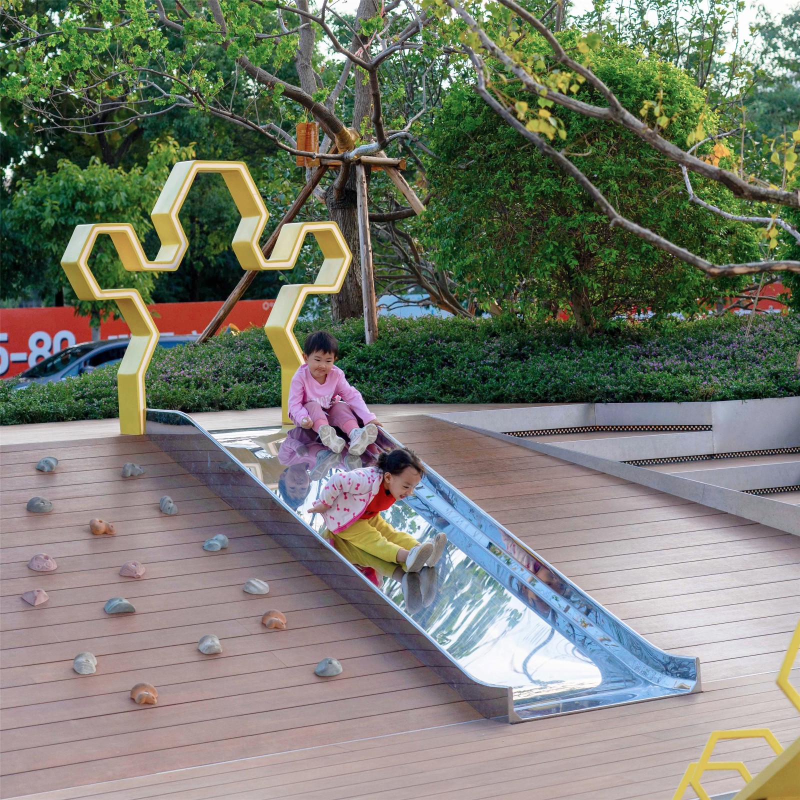 Here, it is not only a natural and gorgeous space,It is also an imaginative fun place.The jungle park under the black cypress tree adopts a full "bee" flavor design.Ladder skateboard, wooden ladder climbing, fun trampoline, trapezoidal jump grid, fun terrain design.Children play freely, and adults can also enjoy the childlike fun time.